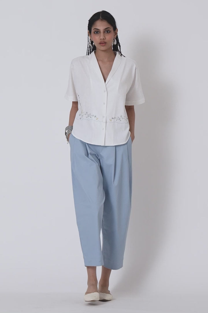 Cuban collar shirt made in handspun and handwoven cotton. Short sleeves. Finished with vintage floral motifs embroidered by hand.