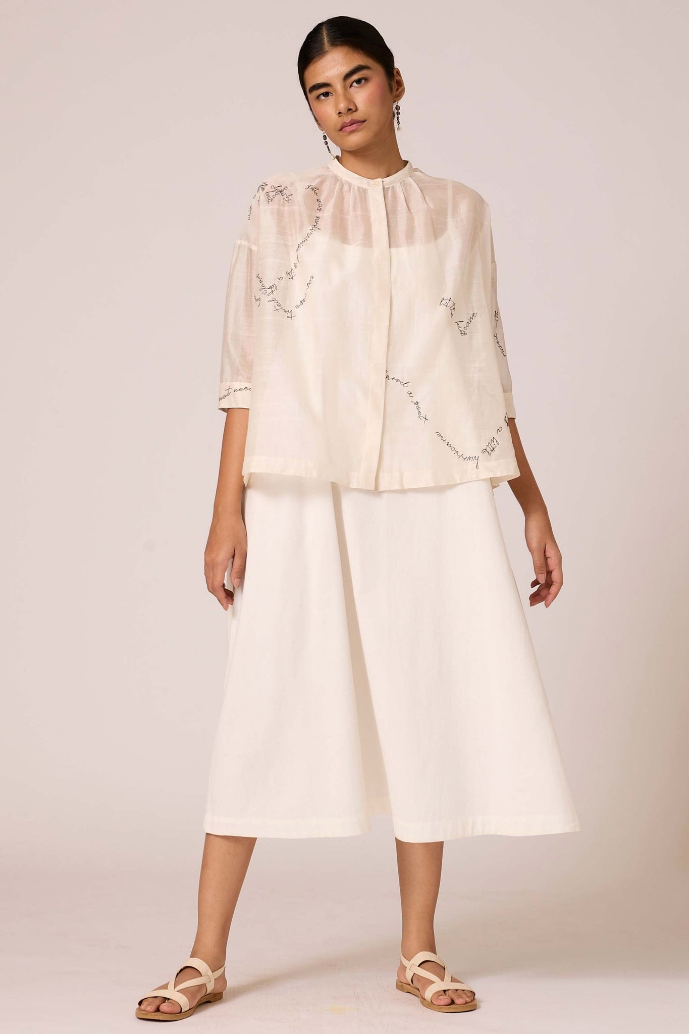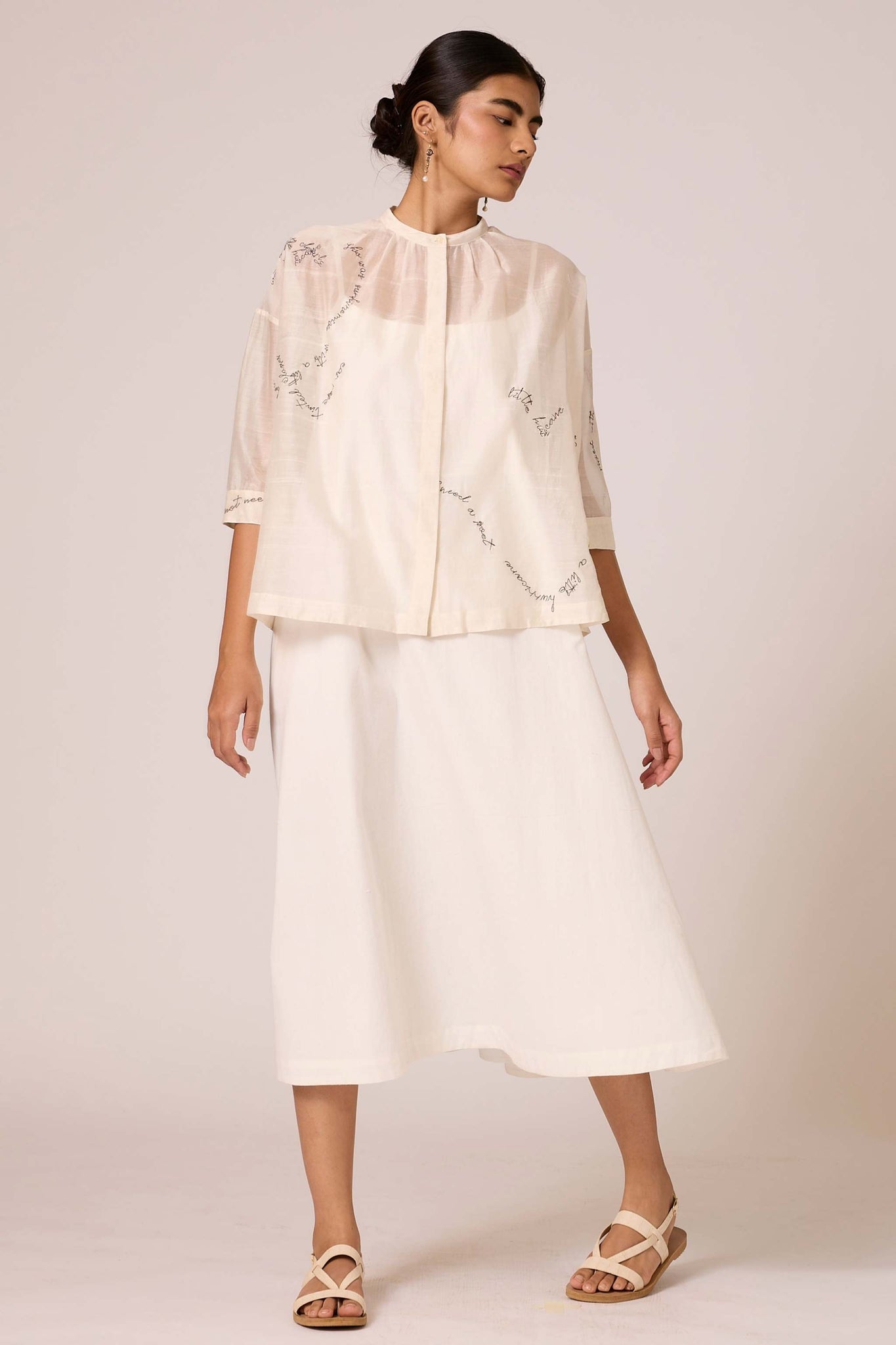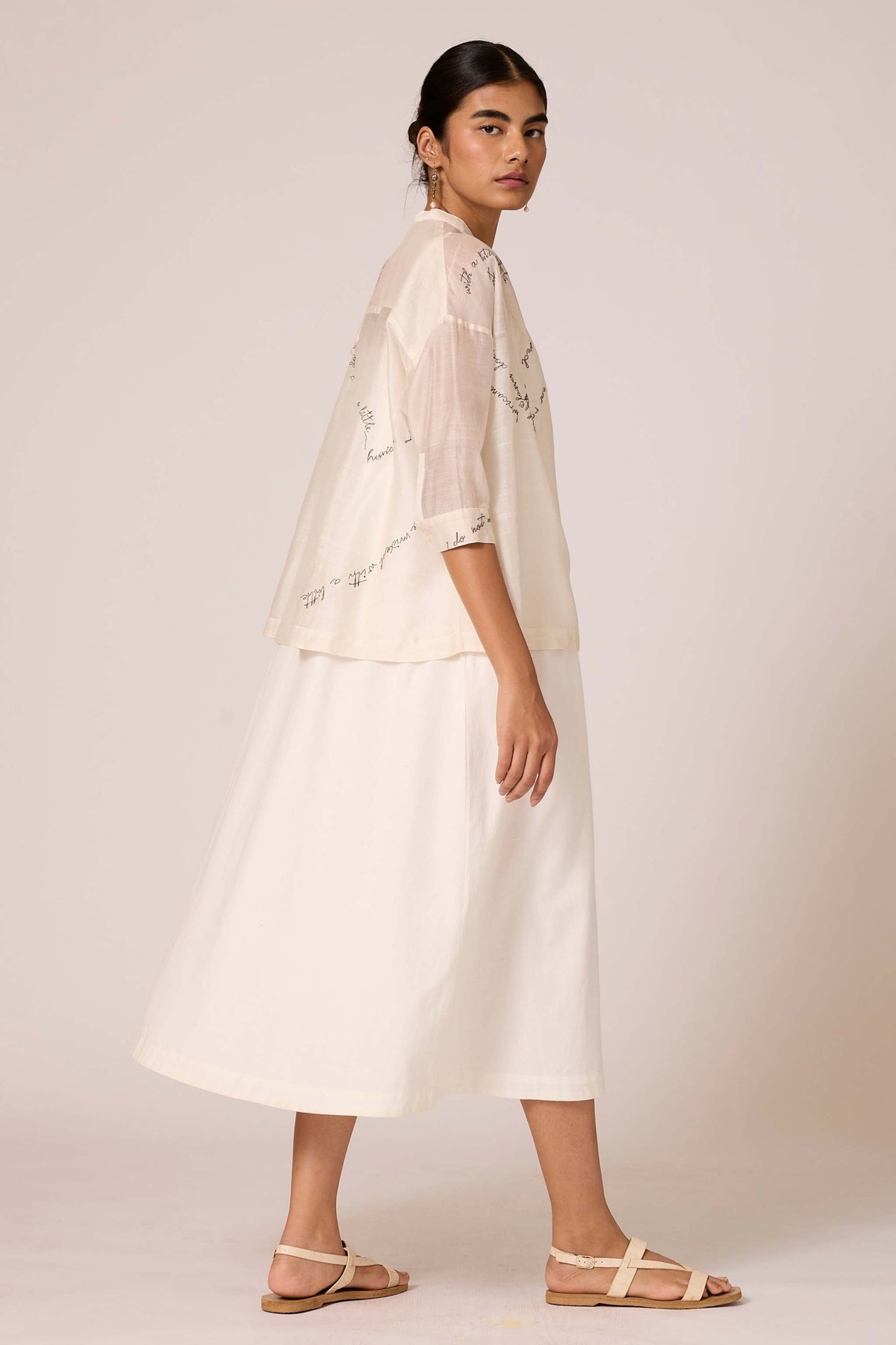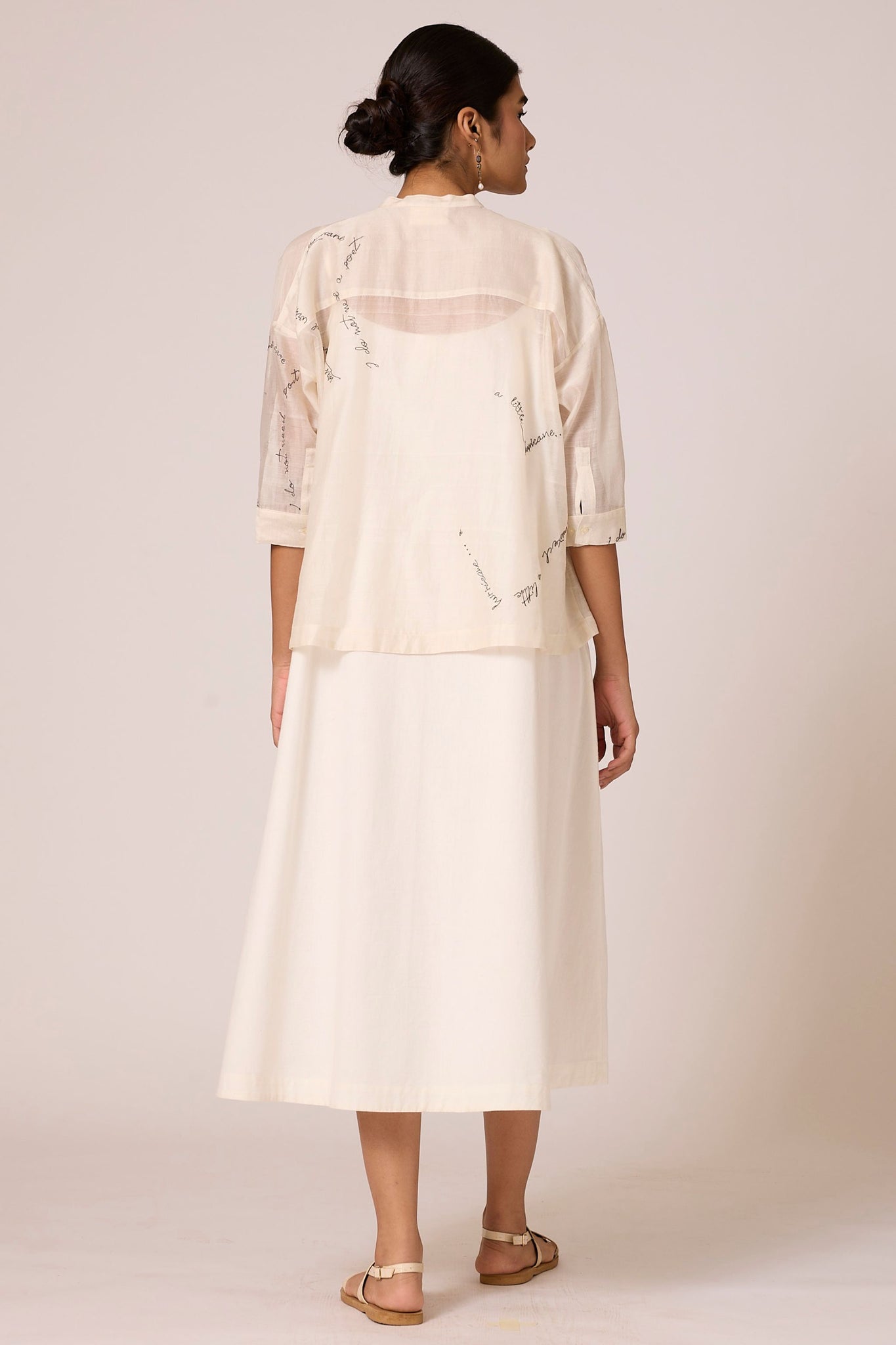 A slip dress crafted from handspun and handwoven cotton with a scoop neckline, adjustable straps and inseam pockets. Paired seamlessly with a Chanderi overlay featuring exquisite hand embroidery from our studio.