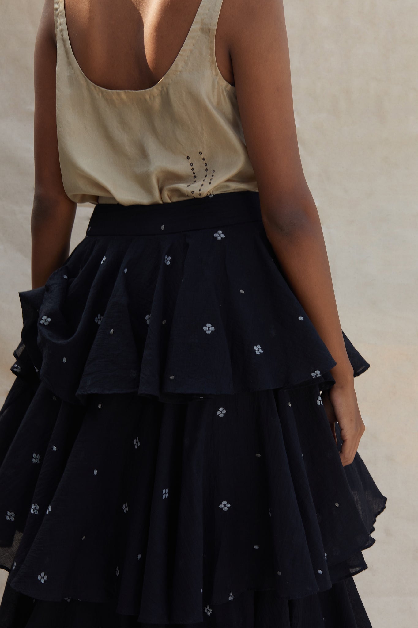 Tiered statement skirt in fine jamdani. Concealed side zip. Playful and chic.