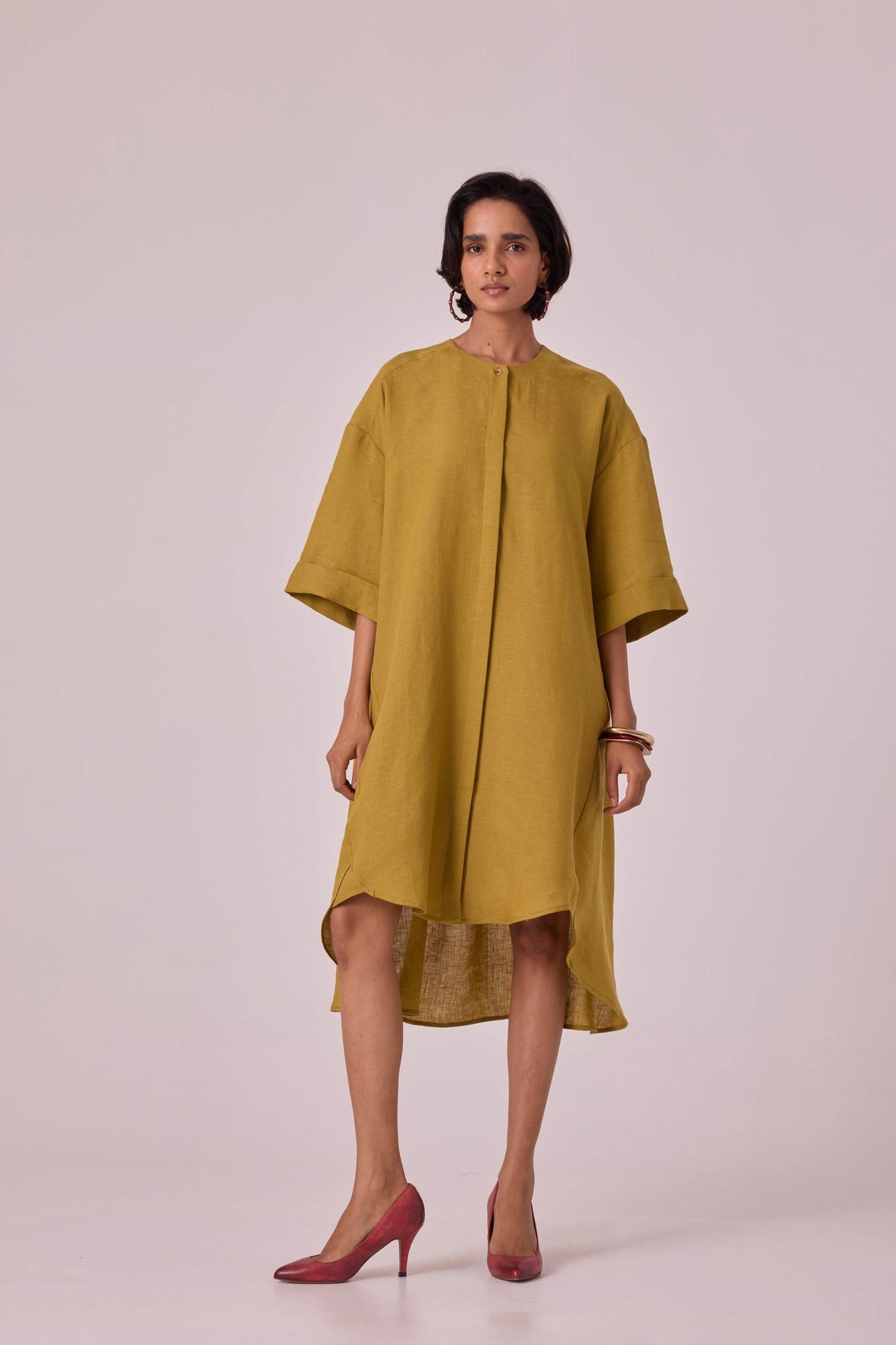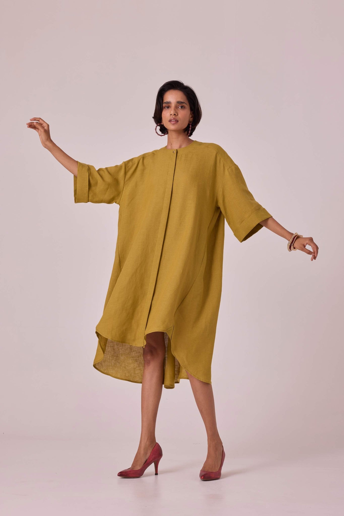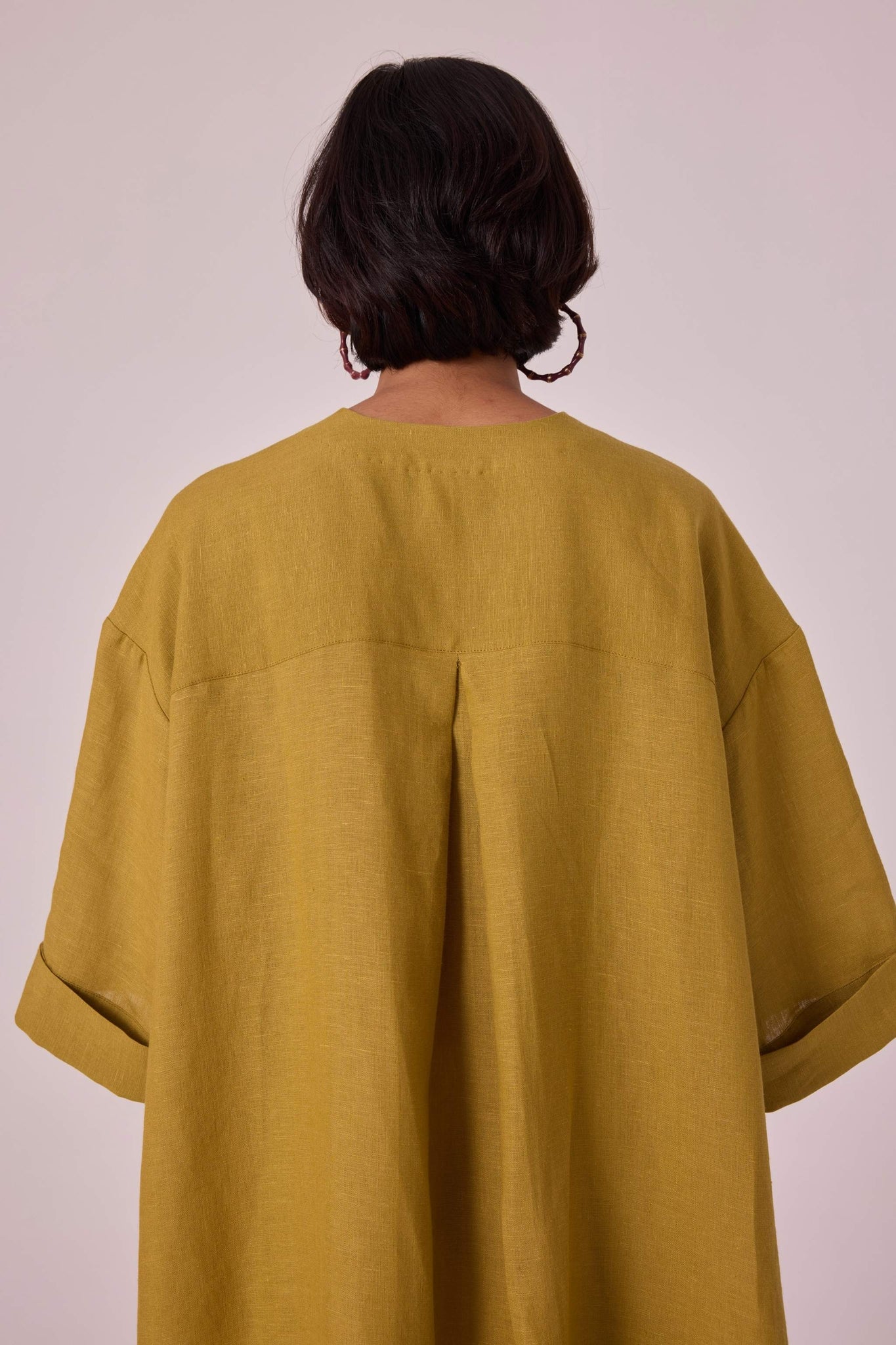 Pure linen tunic in a breezy silhouette. Boxy sleeves and a modish round neck. Curved hemline with a unique gusset detail. Neatly concealed placket with button-through front. The back yoke includes a single inverted pleat for added style. Oversized fit.