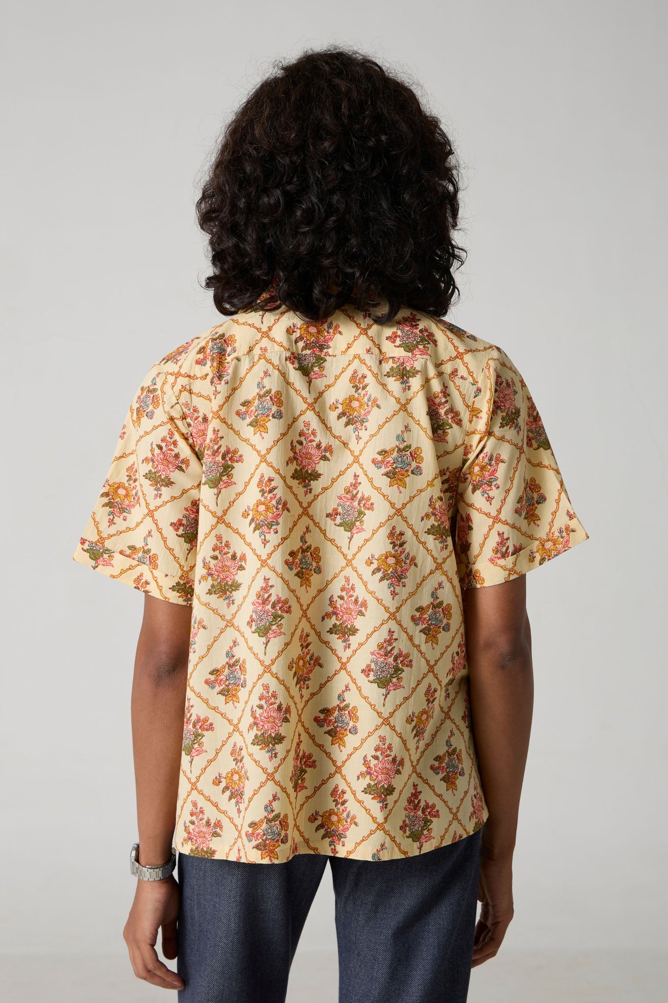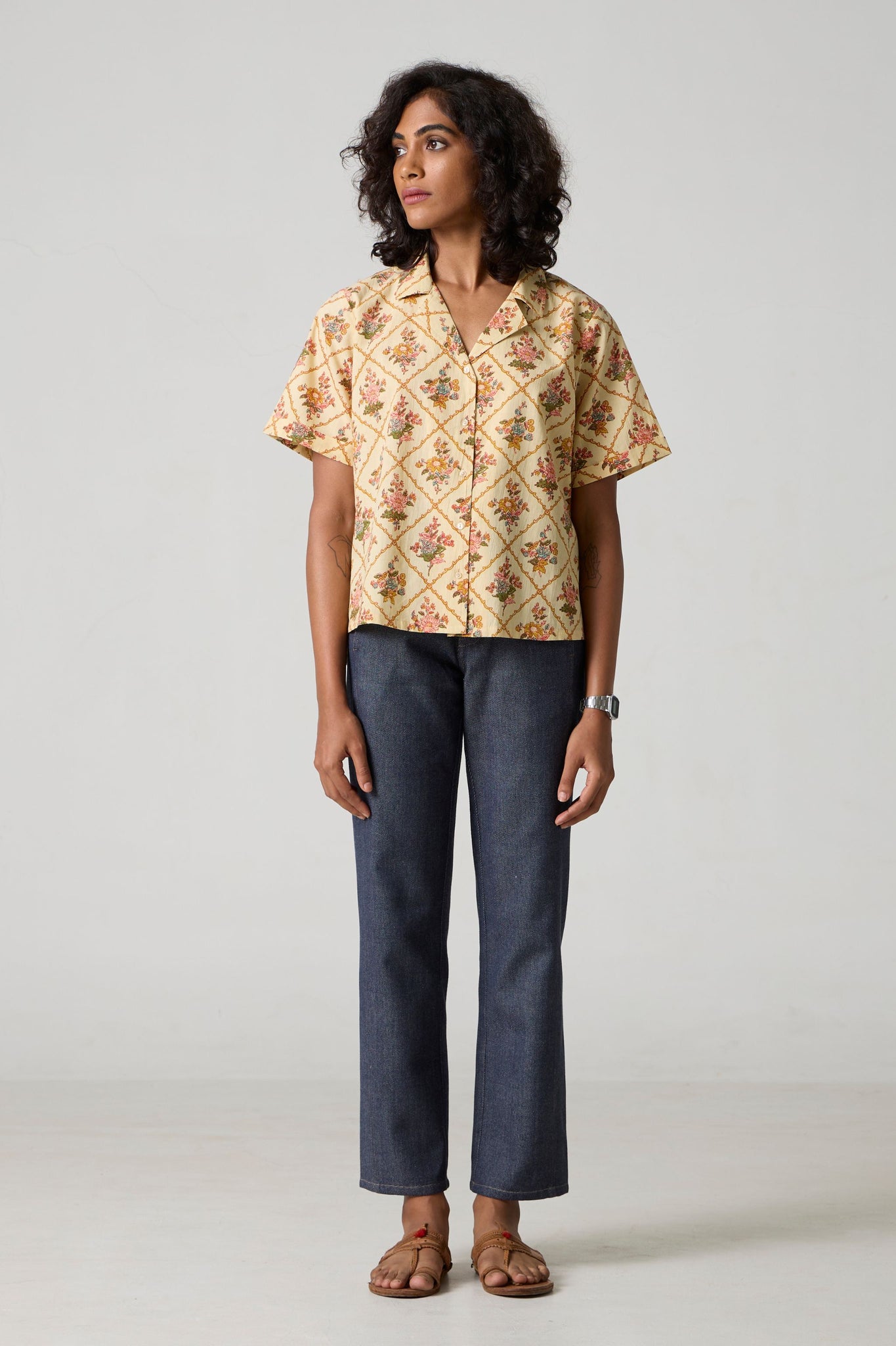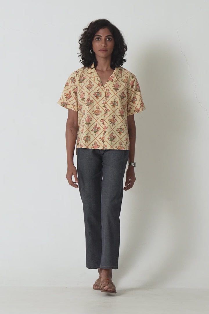 Notch collar hand block printed shirt made in organic cotton. Short sleeve. Back yoke. Crafted in soft cotton featuring a signature developed in-studio.