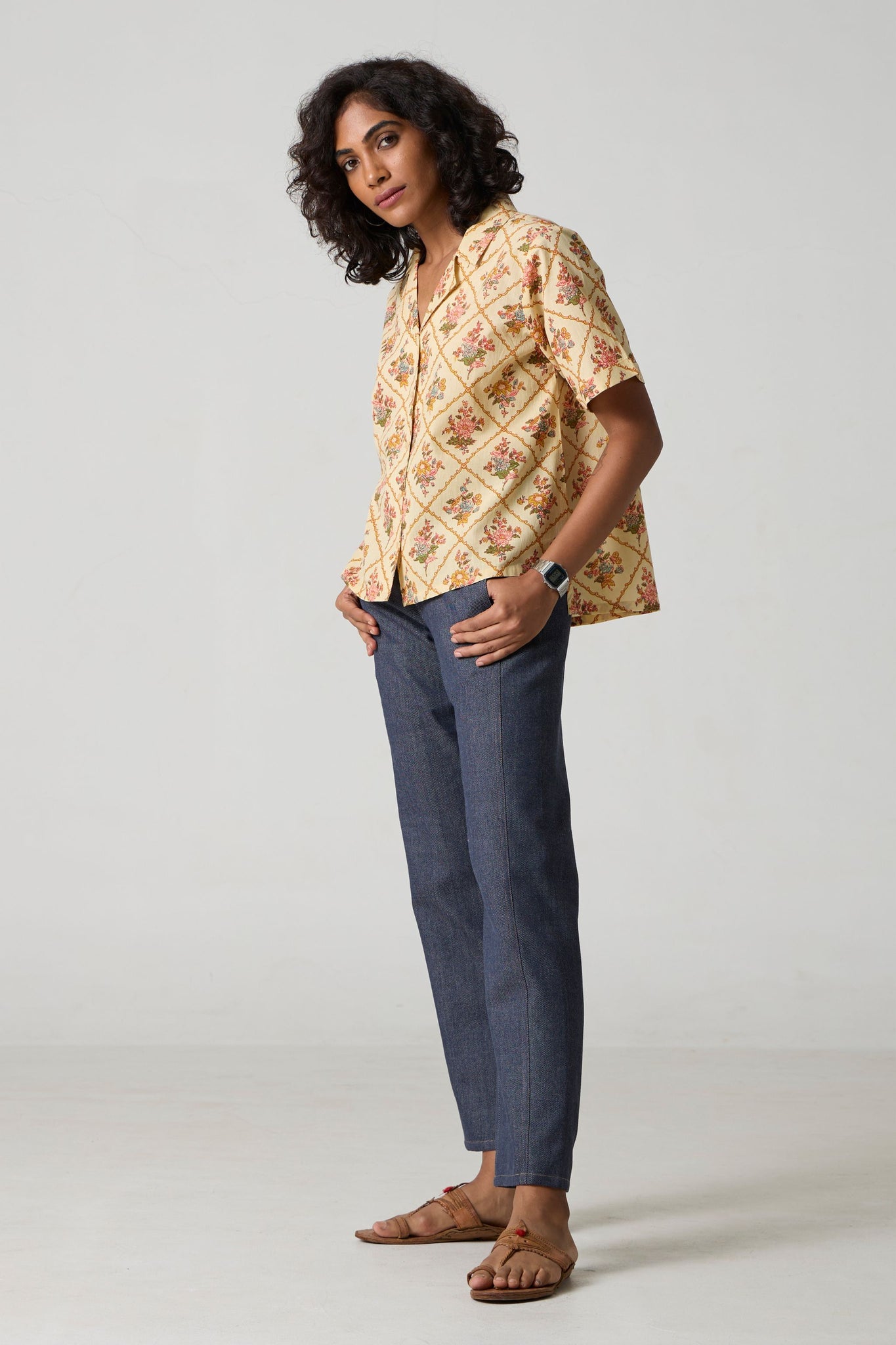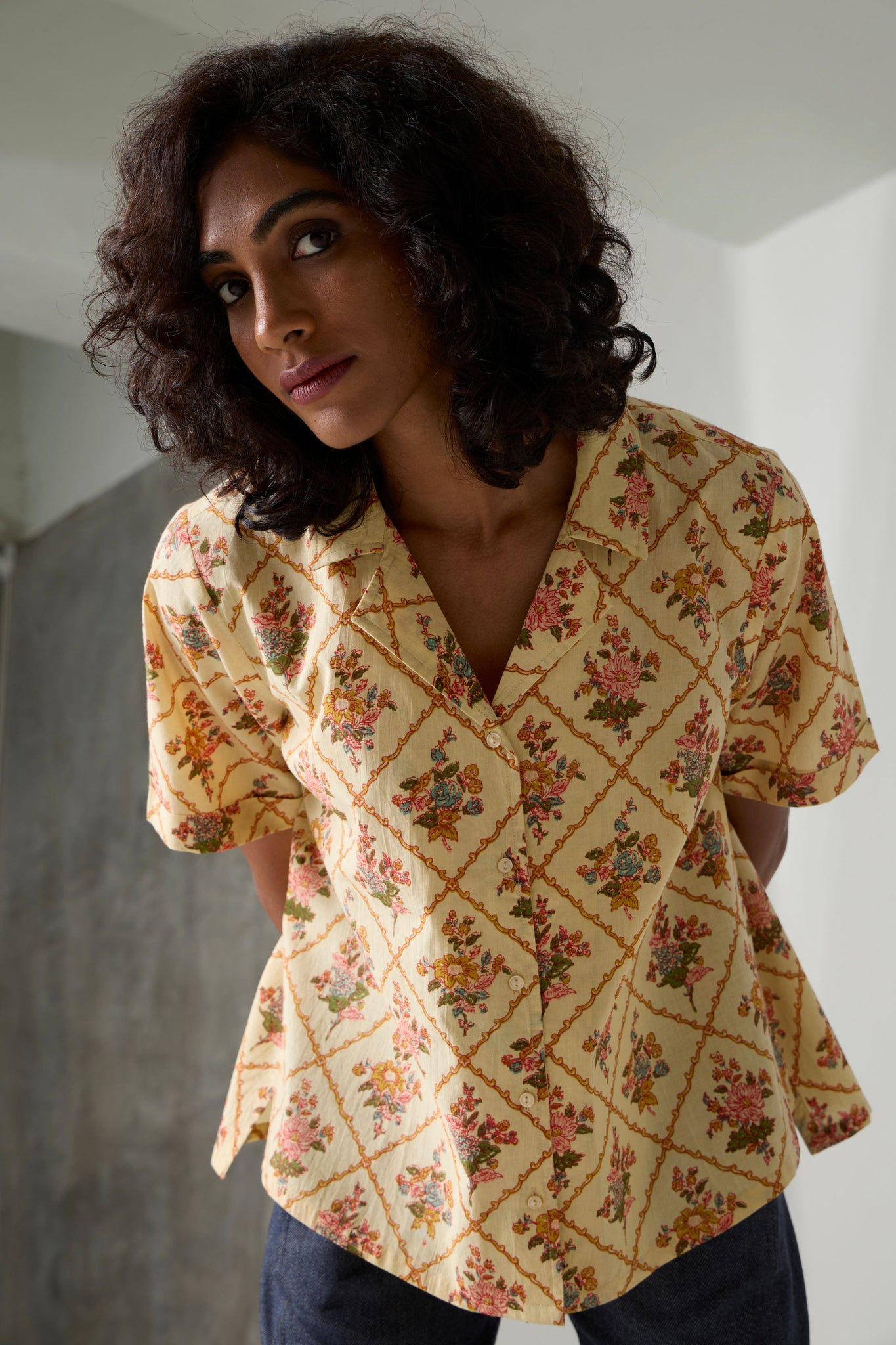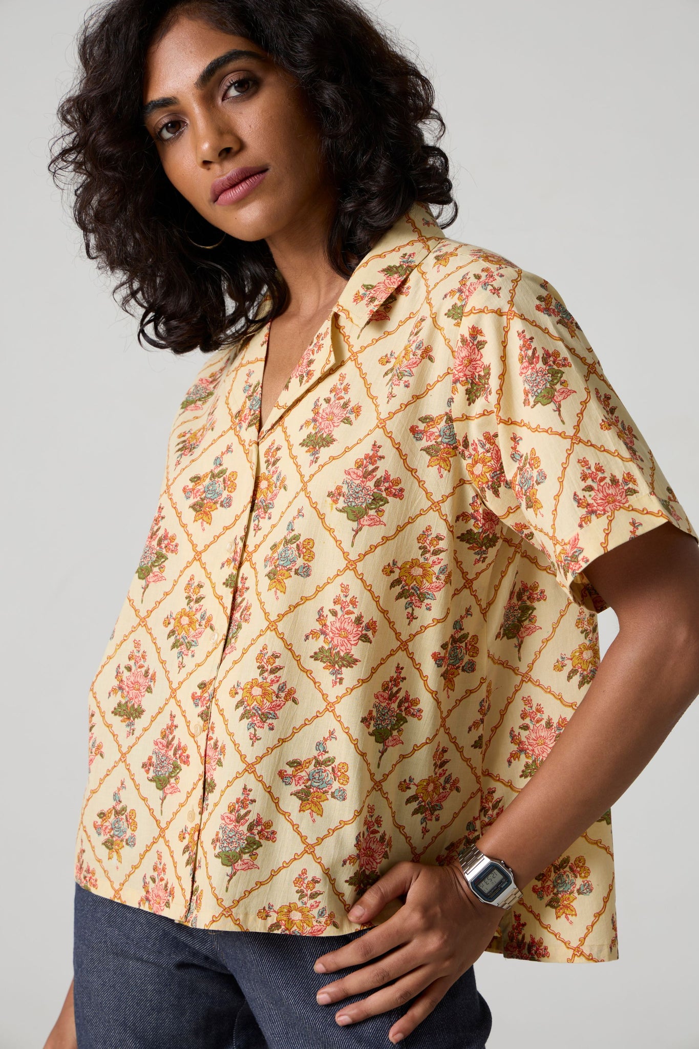 Notch collar hand block printed shirt made in organic cotton. Short sleeve. Back yoke. Crafted in soft cotton featuring a signature developed in-studio.