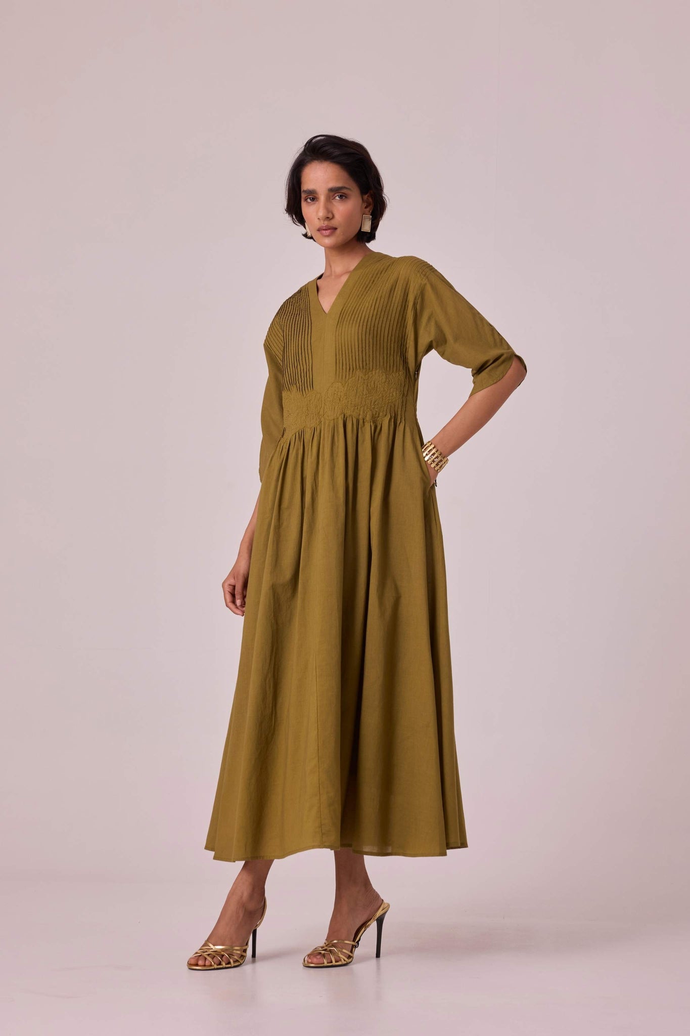 Understated elegance. V-neck with pintuck and embroidery detail. Drop sleeves. In-seam pockets. This dress is shipped with a slip.