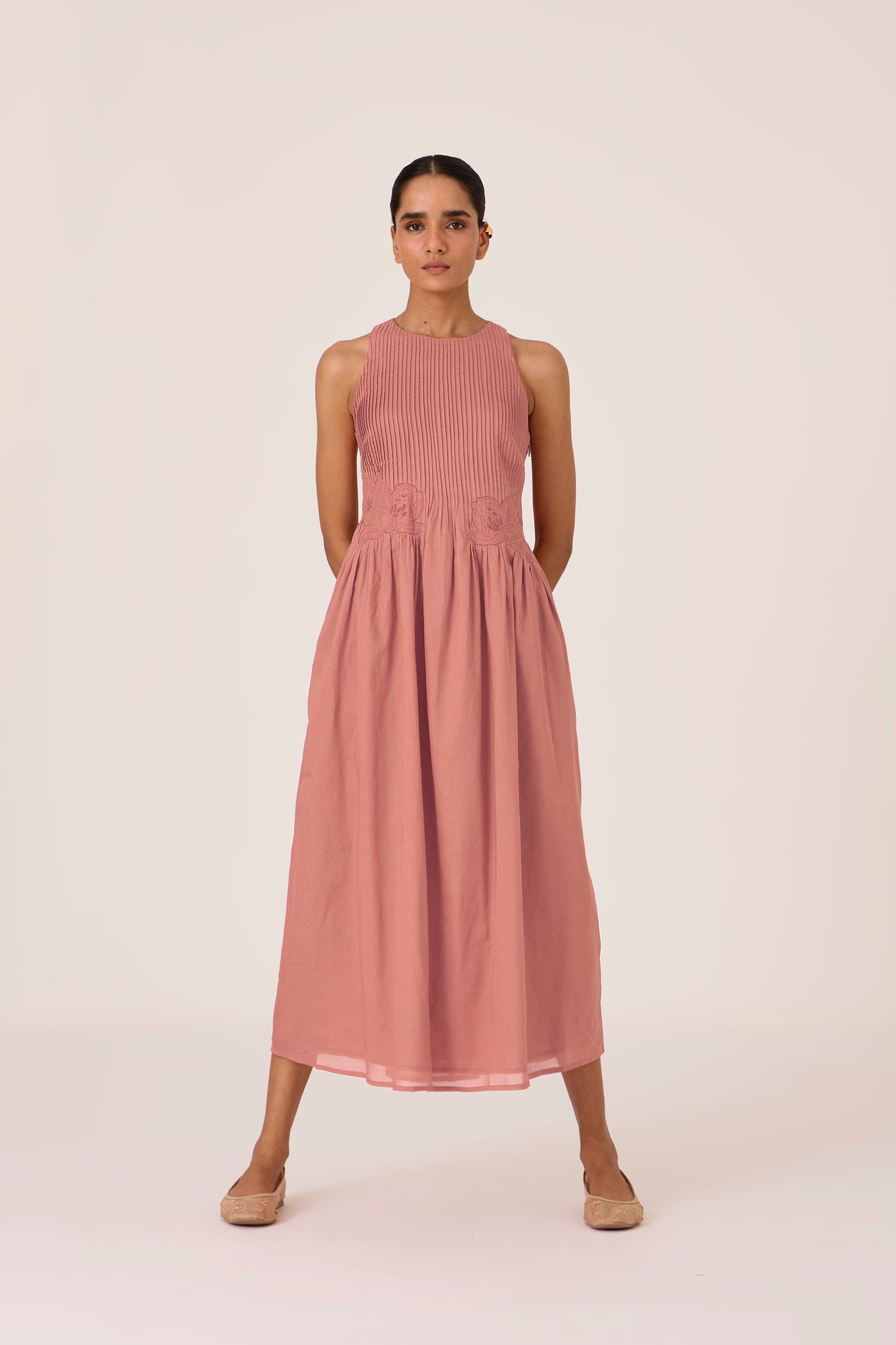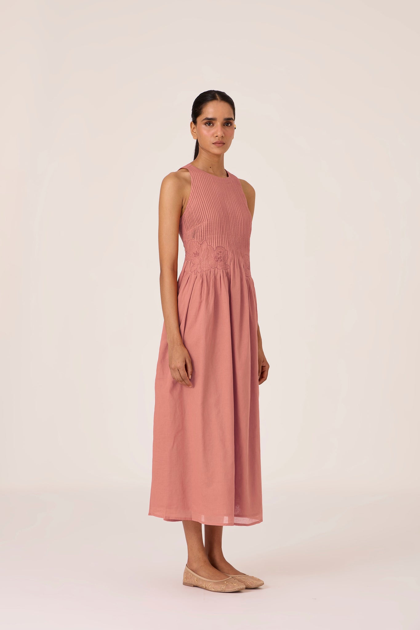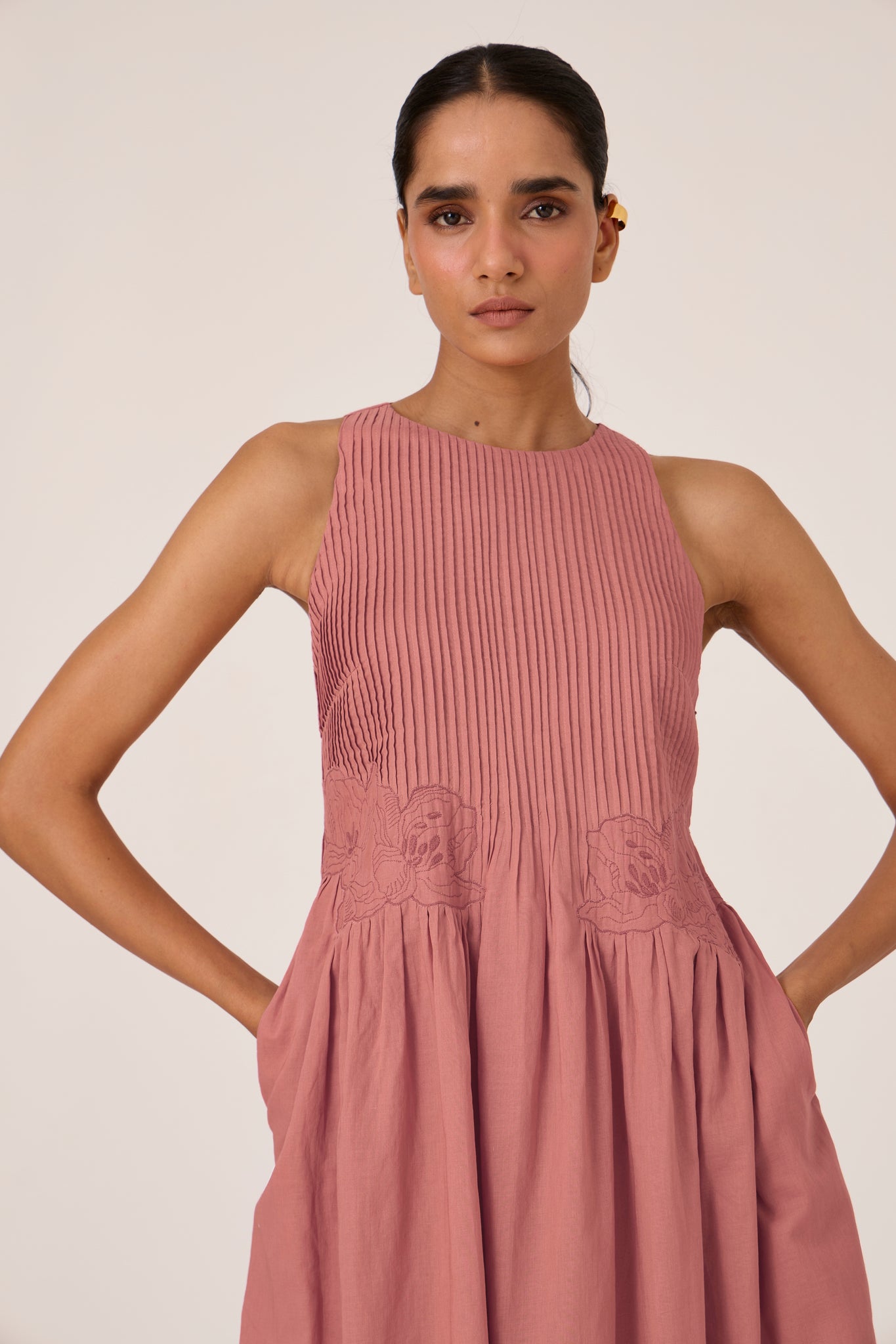 Gathered waist sleeveless dress with fine pintuck bodice. Waist gathers for gentle movement. Single rouleau button at the back.  Side zip for ease.
