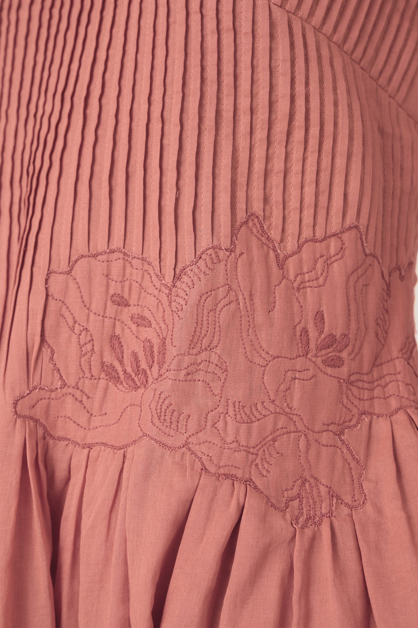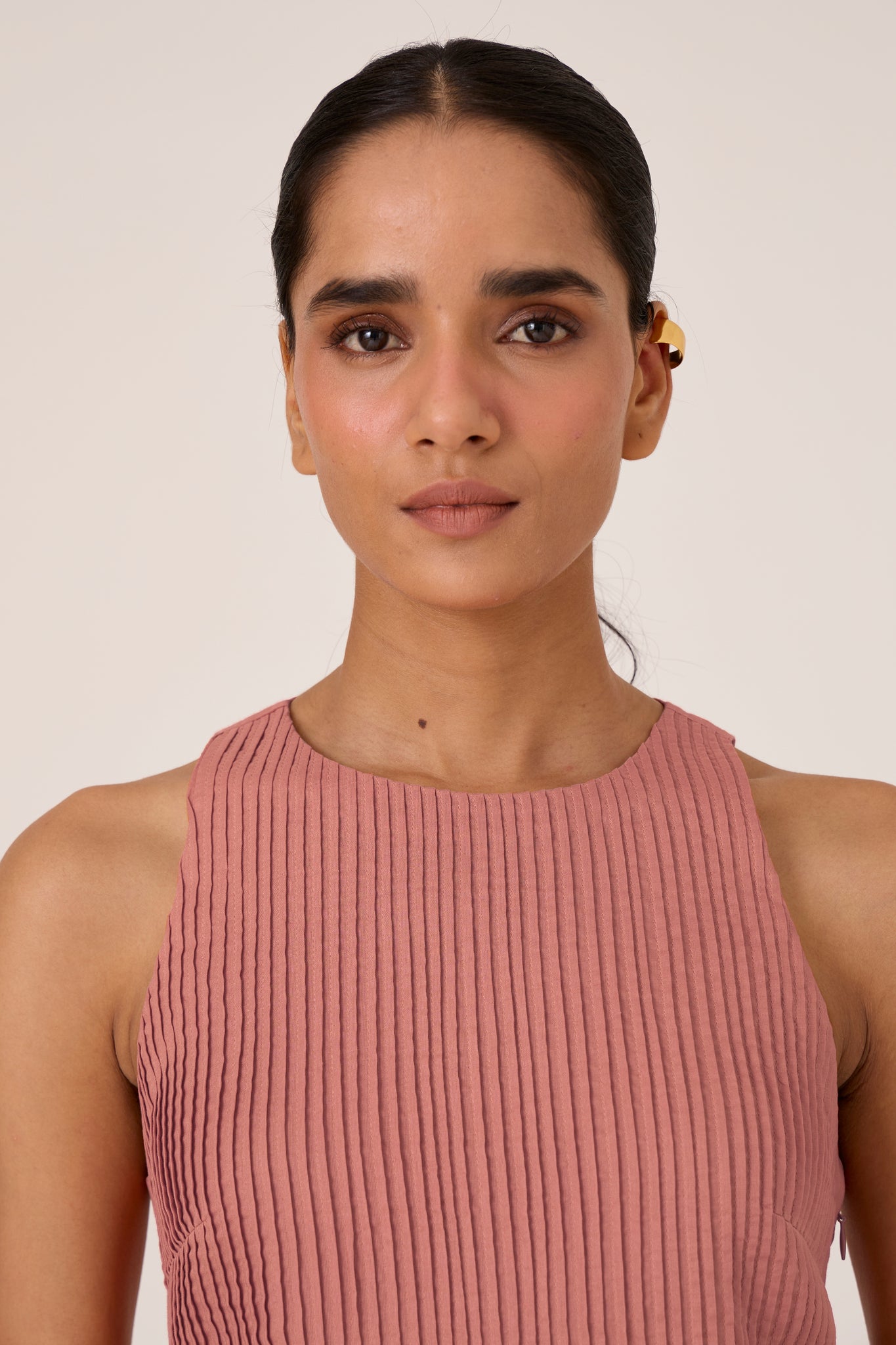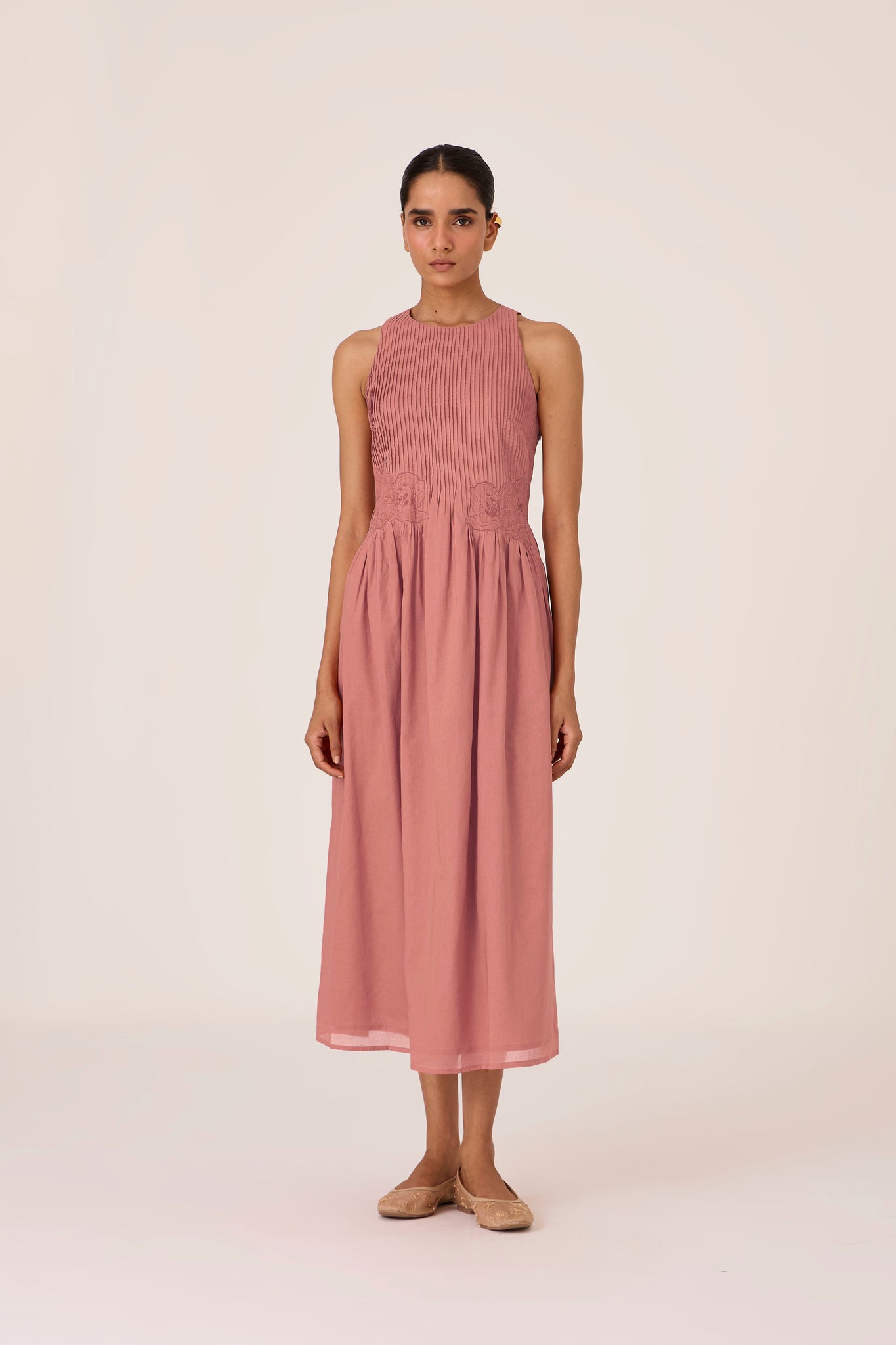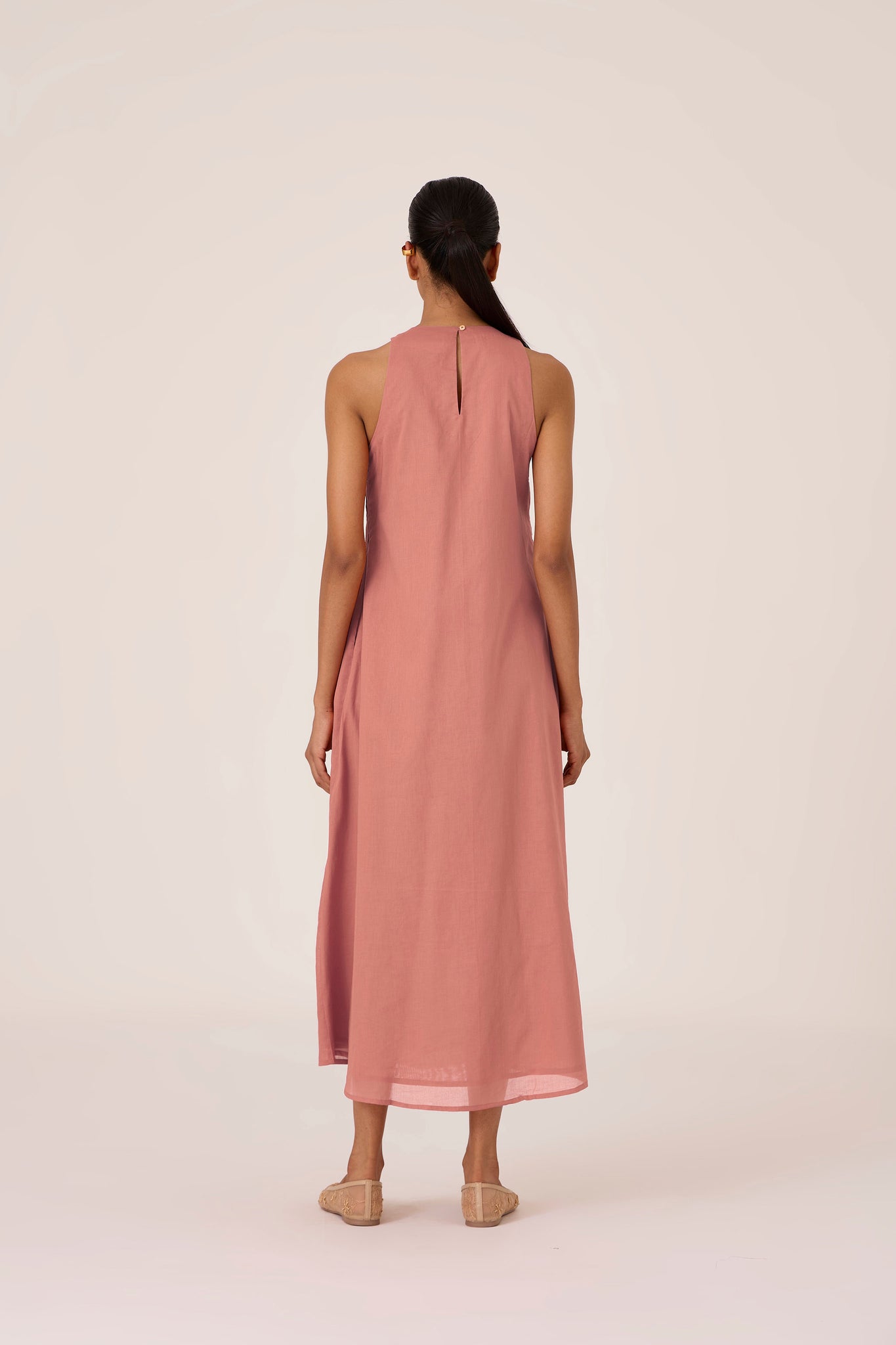 Gathered waist sleeveless dress with fine pintuck bodice. Waist gathers for gentle movement. Single rouleau button at the back.  Side zip for ease.