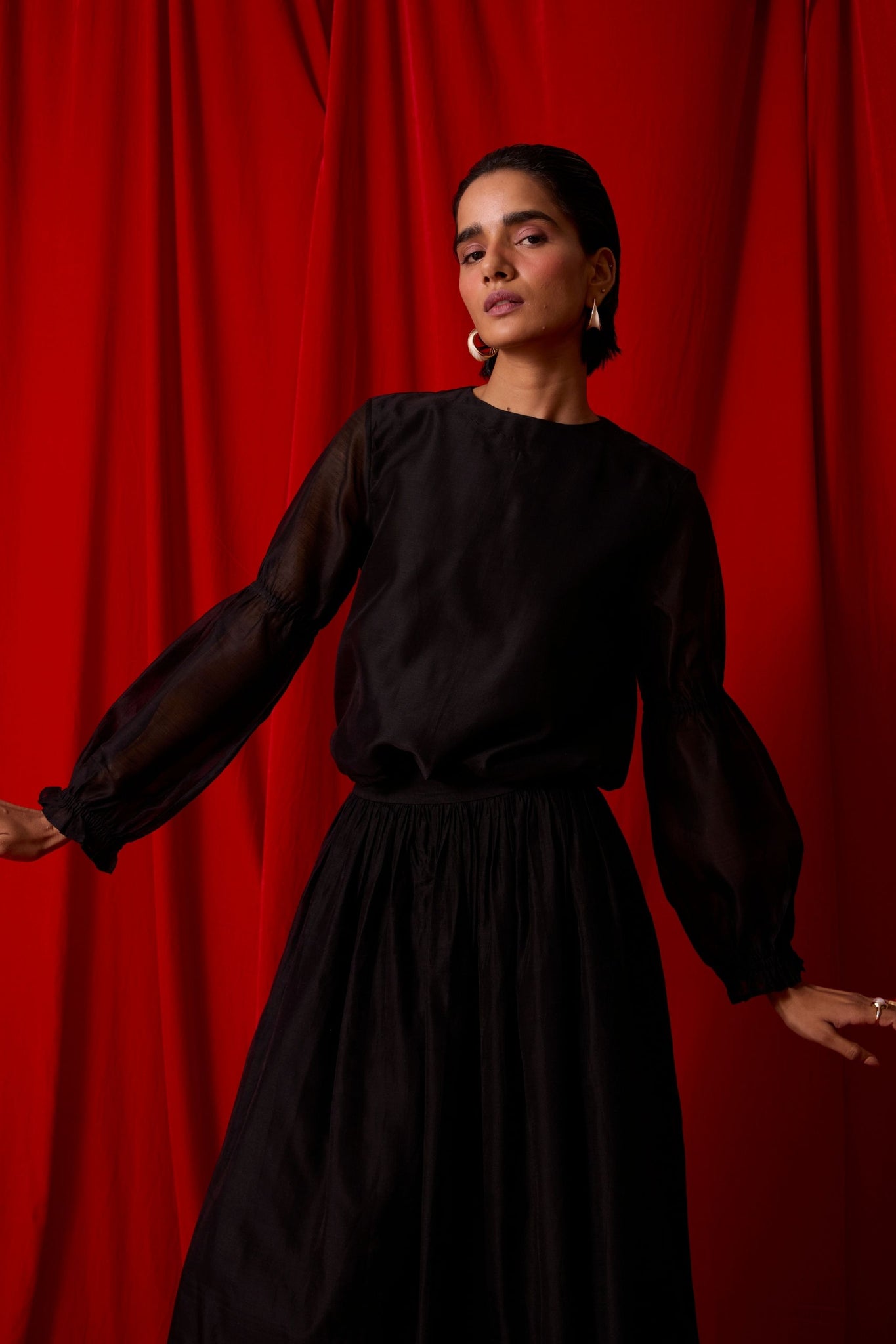 A refined silhouette in luminous Chanderi, the Atlas top is shaped with a subtle drawstring waist that allows the form to shift with intention. Elasticated sleeve details and a clean back fastening bring measured structure to a piece that moves effortlessly between everyday and festive wear.