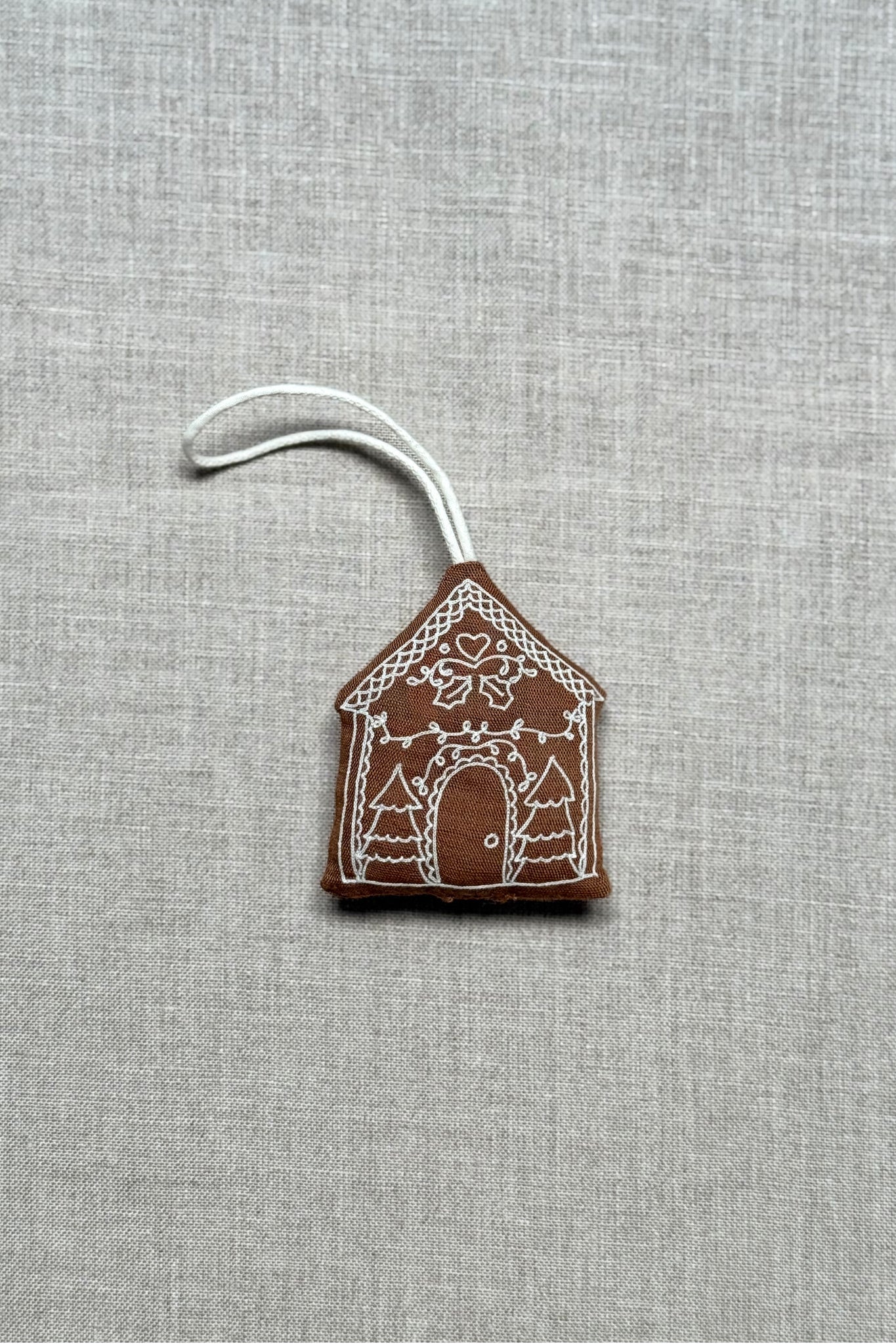 Complete your holiday decor with this set of four gingerbread house ornaments, each lovingly hand-embroidered with festive details.