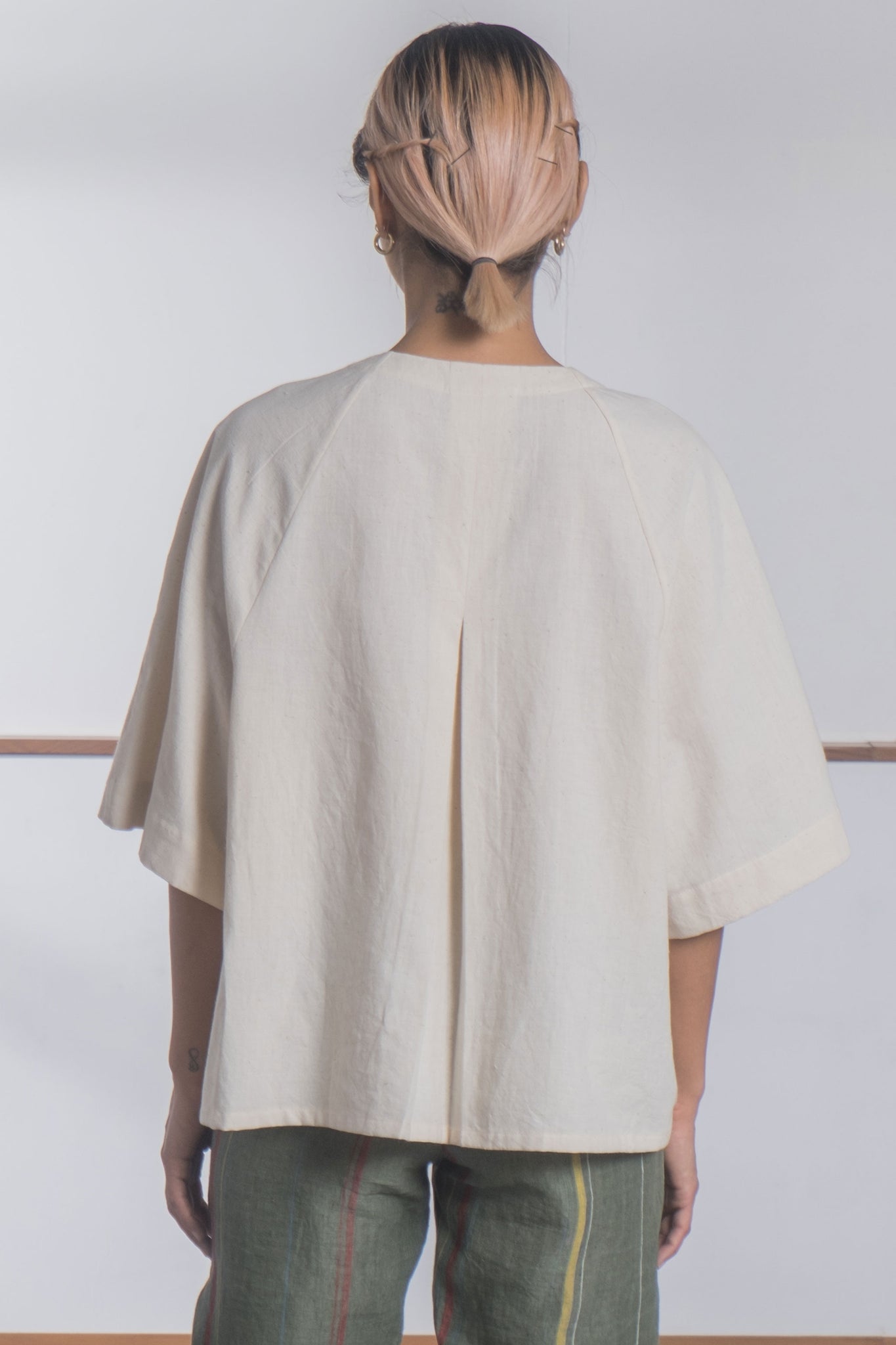 Boxy top in mid weight breathable khadi. Hidden placket with button fastening. Raglan sleeves.