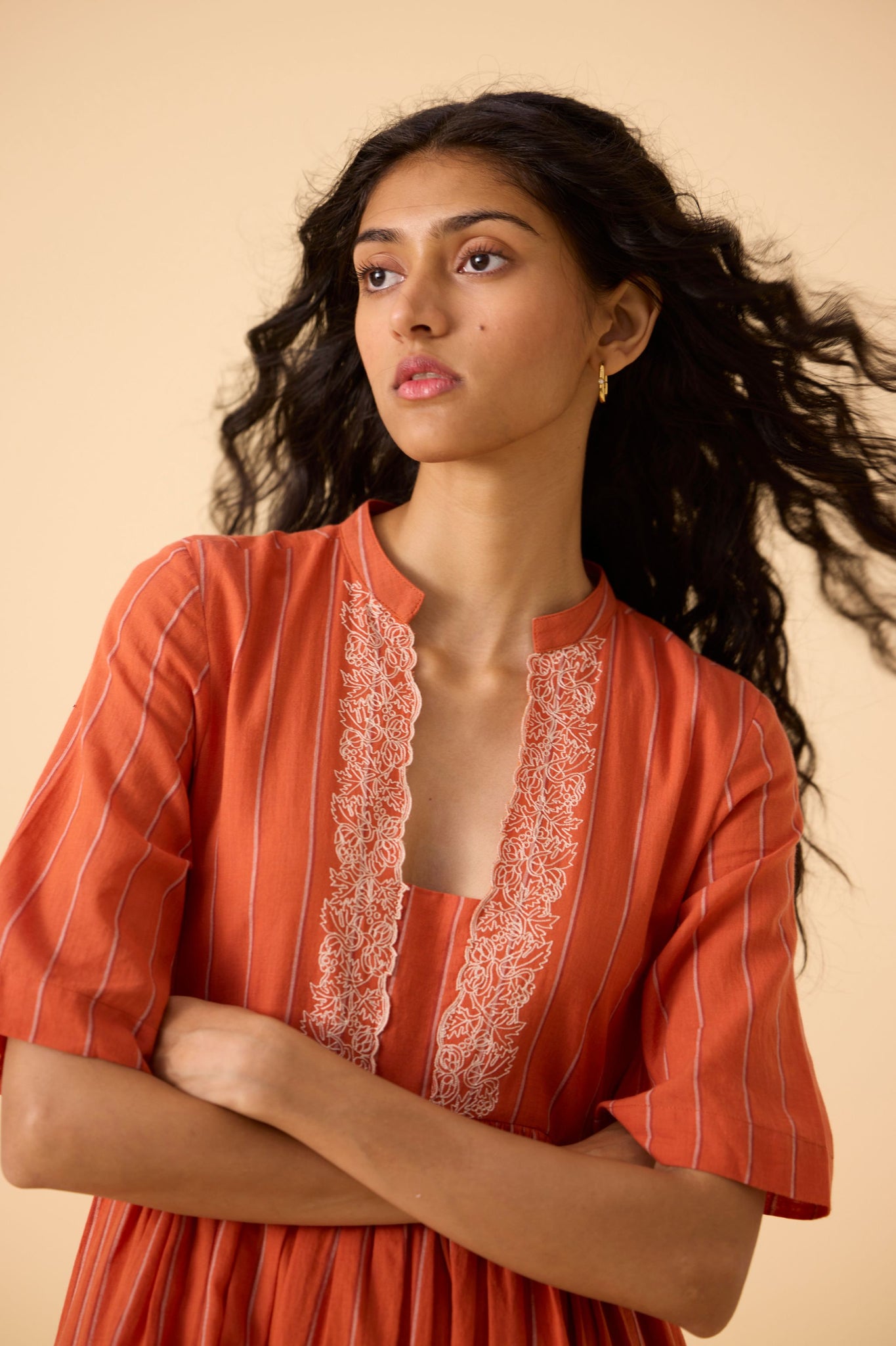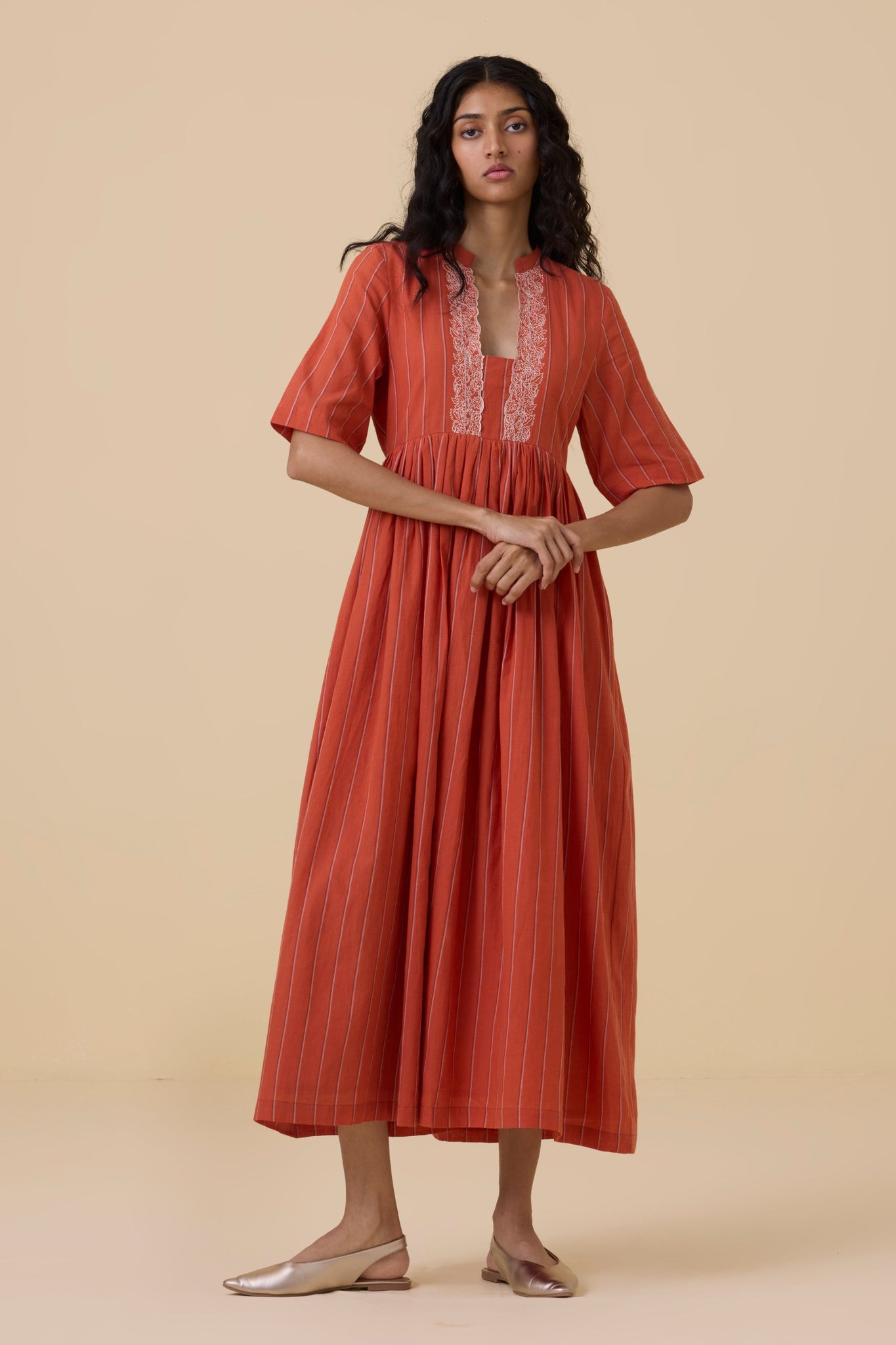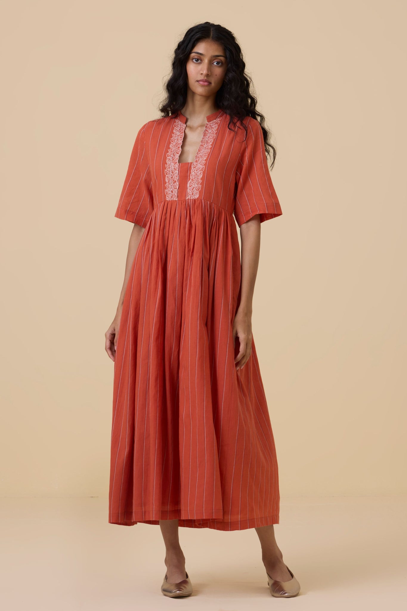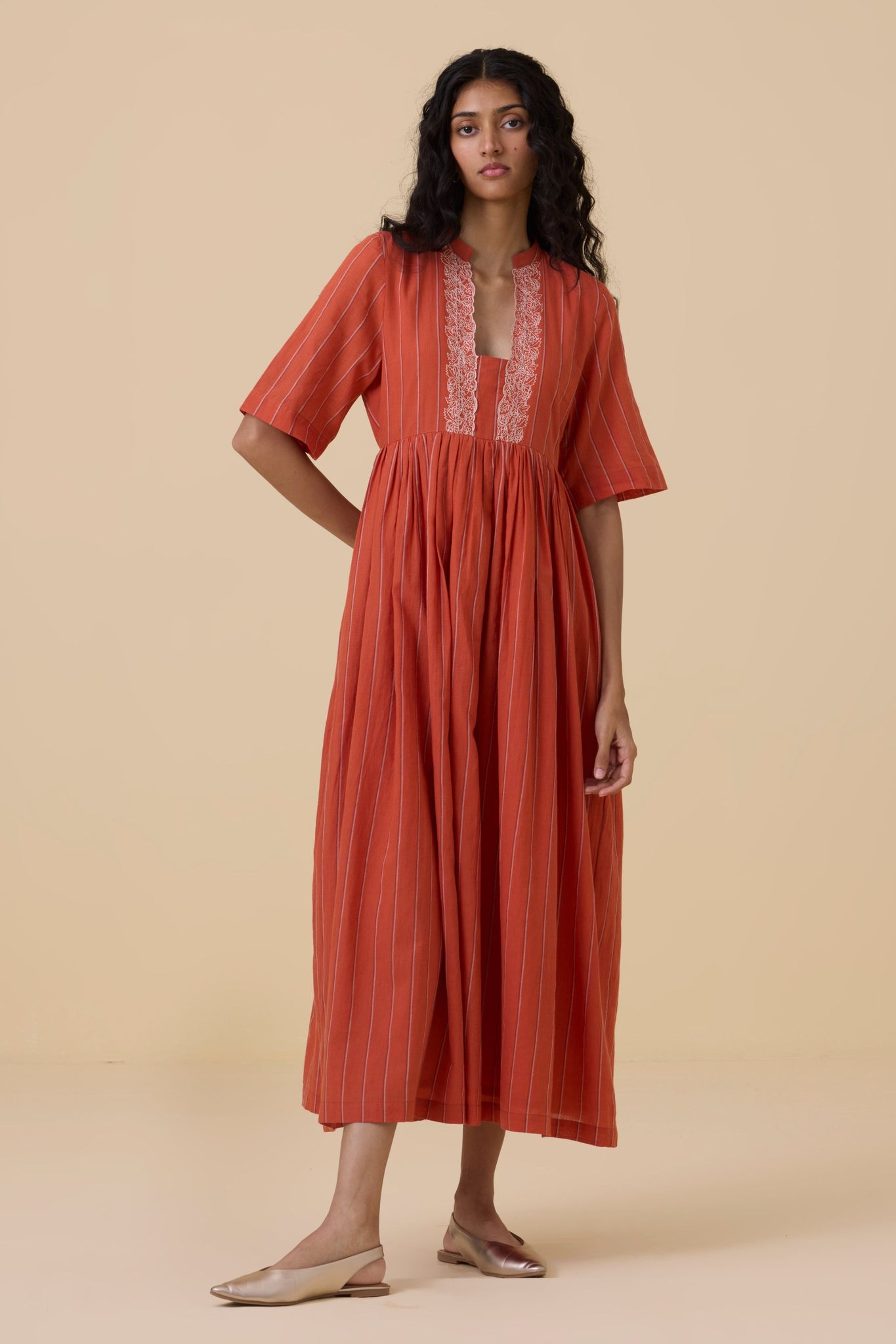 Flowy cotton dress in a deep shade of cherry. Features a plunge neckline lined with fine thread work. Elbow-length sleeves. In-seam pockets. This dress is lined waist down.