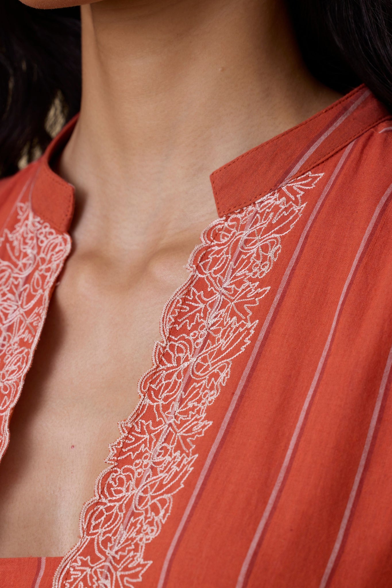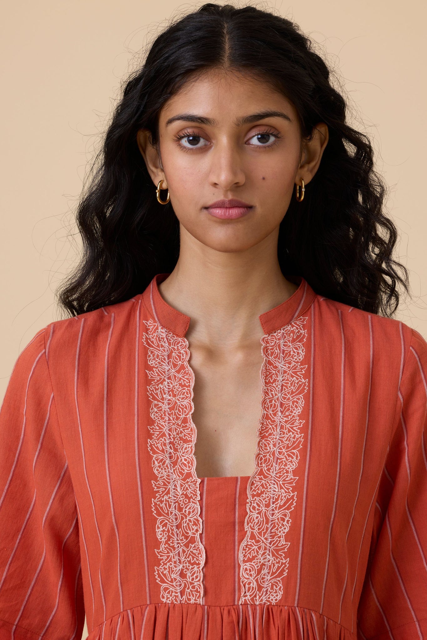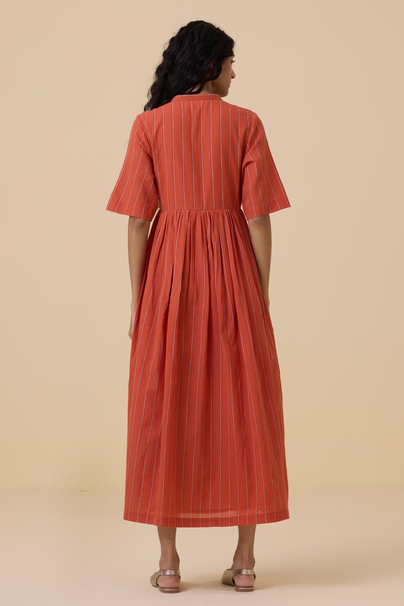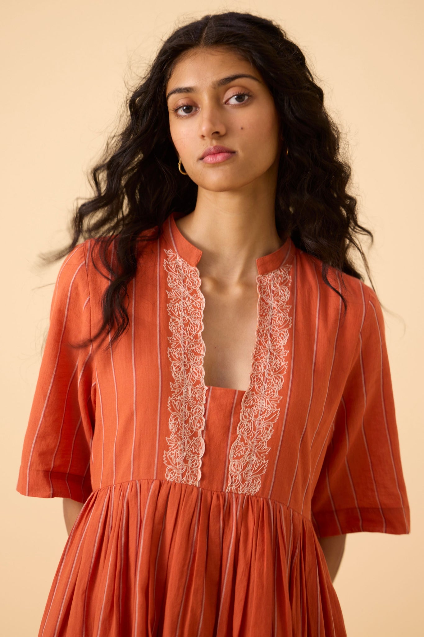 Flowy cotton dress in a deep shade of cherry. Features a plunge neckline lined with fine thread work. Elbow-length sleeves. In-seam pockets. This dress is lined waist down.