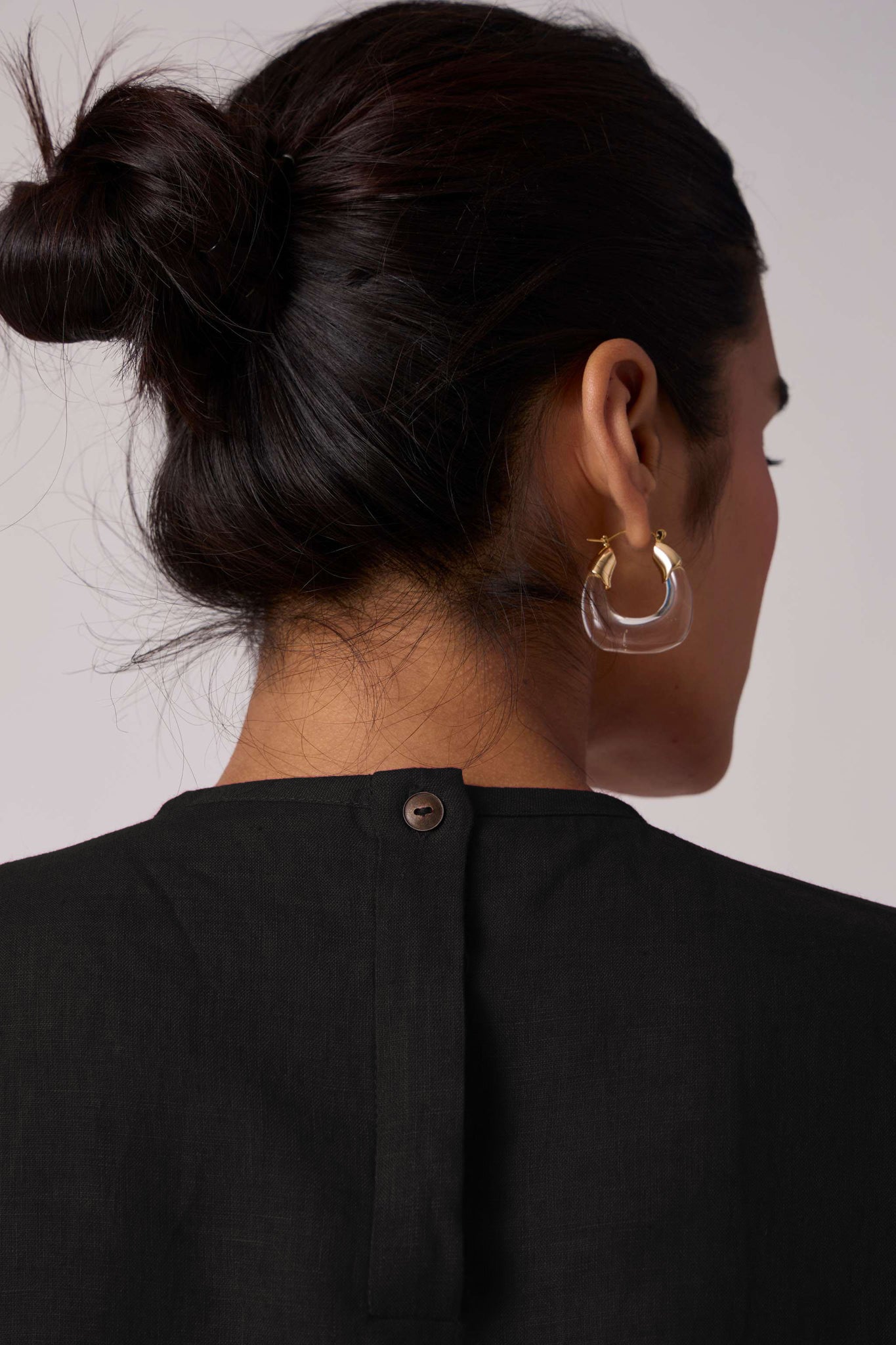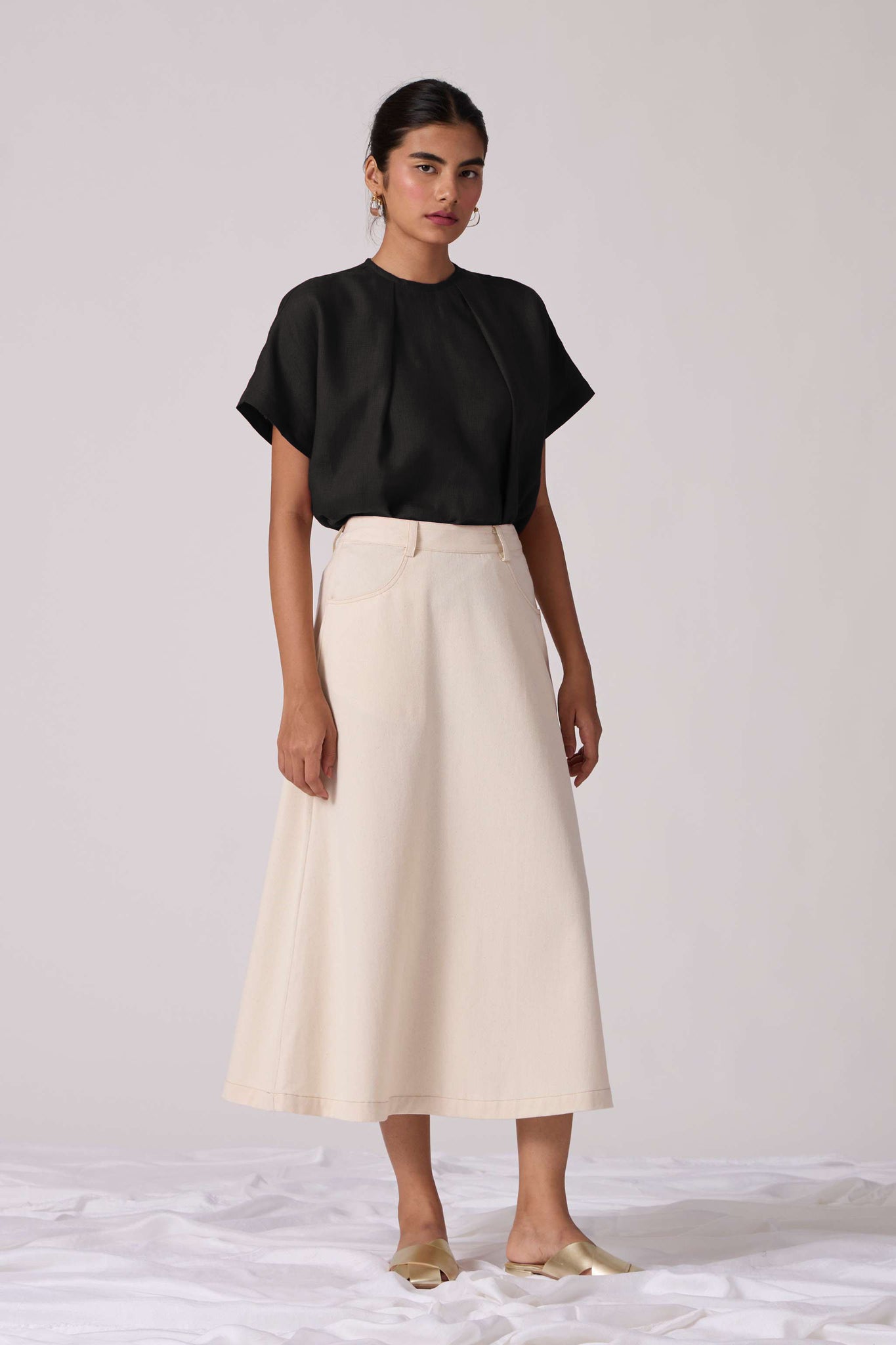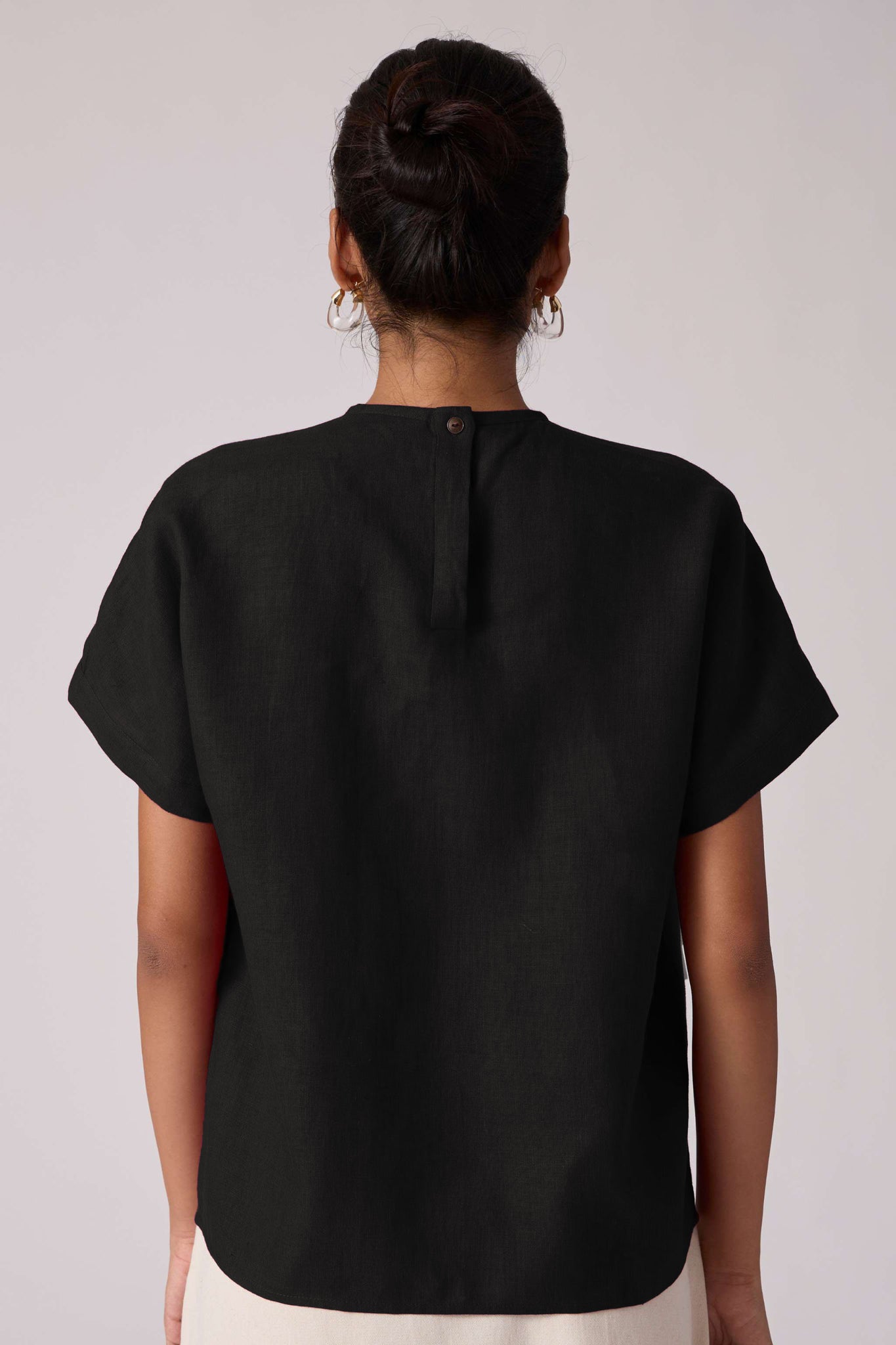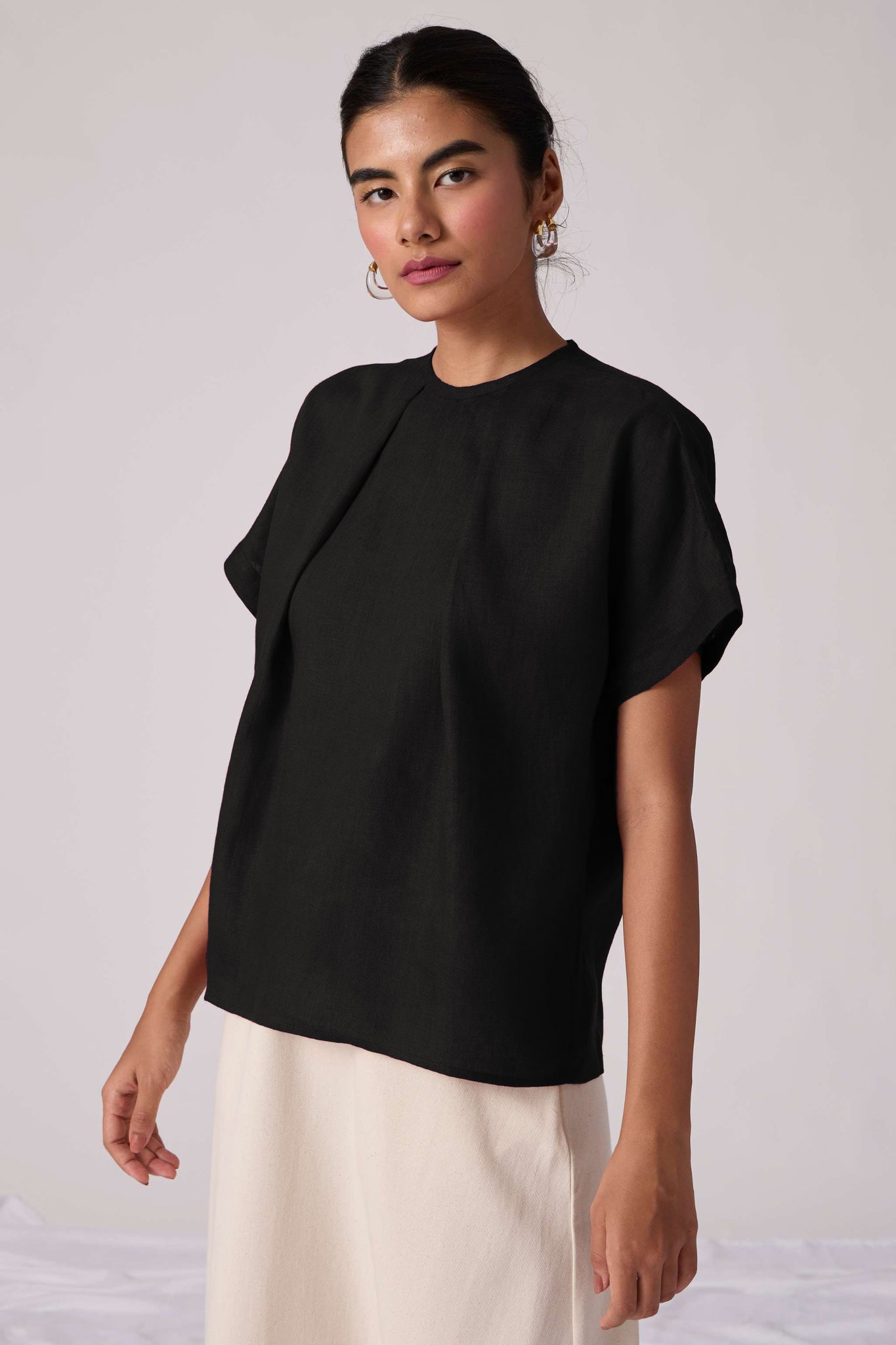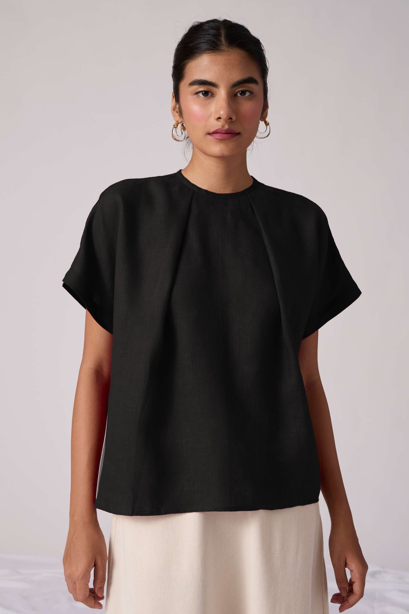 A linen-cotton top featuring a closed round neckline with front pleating detail. Drop sleeves. Back button fastening with a concealed placket.