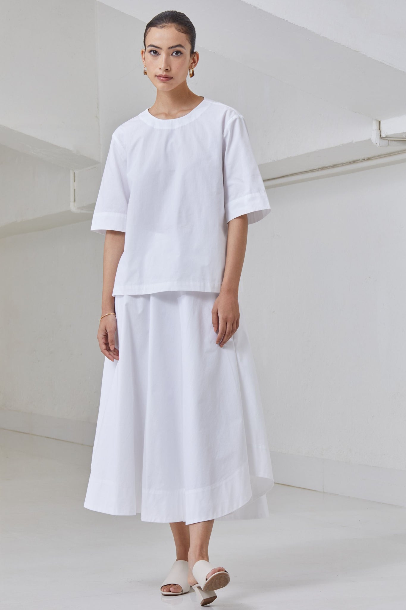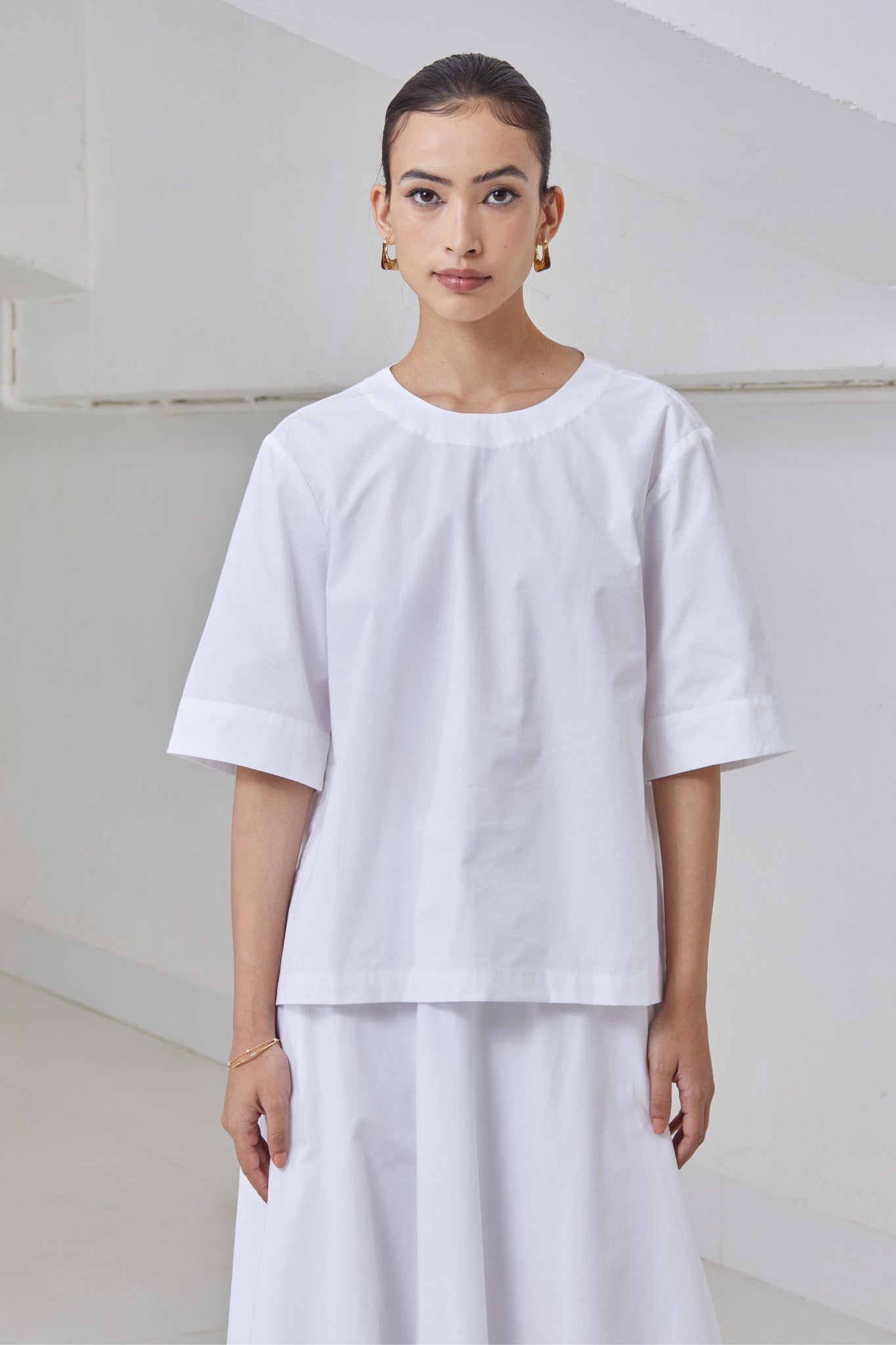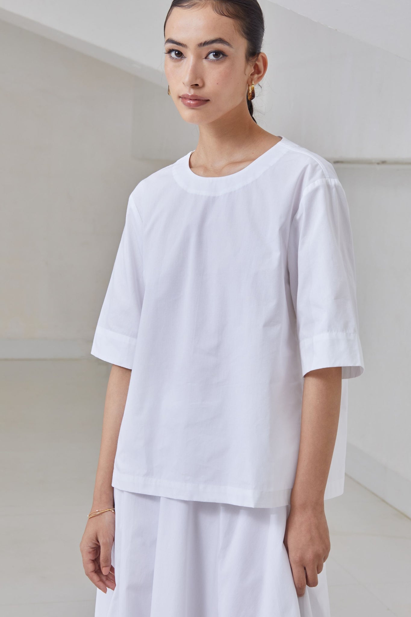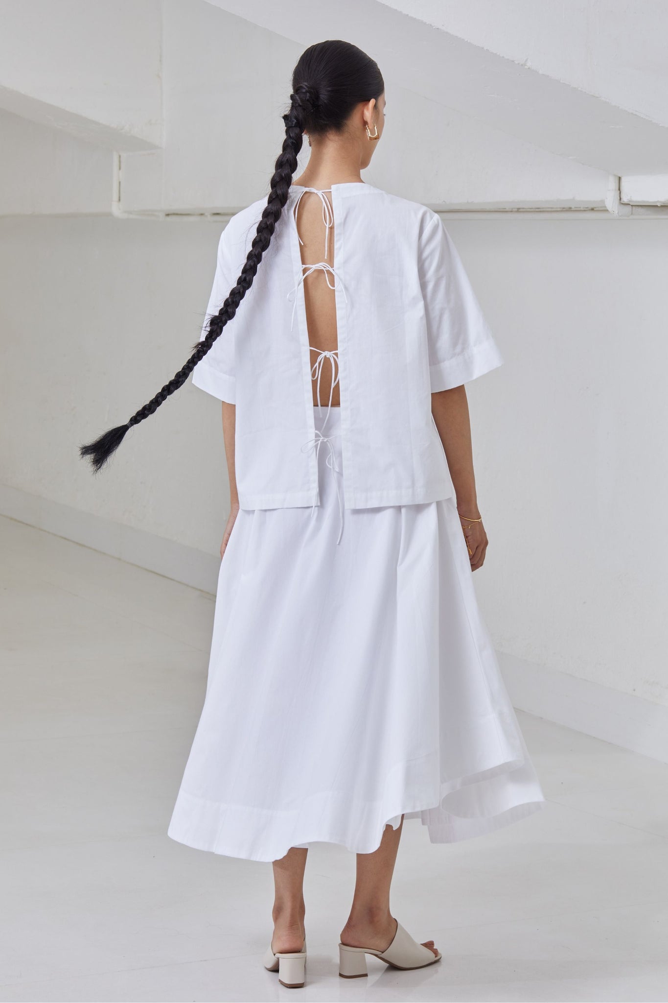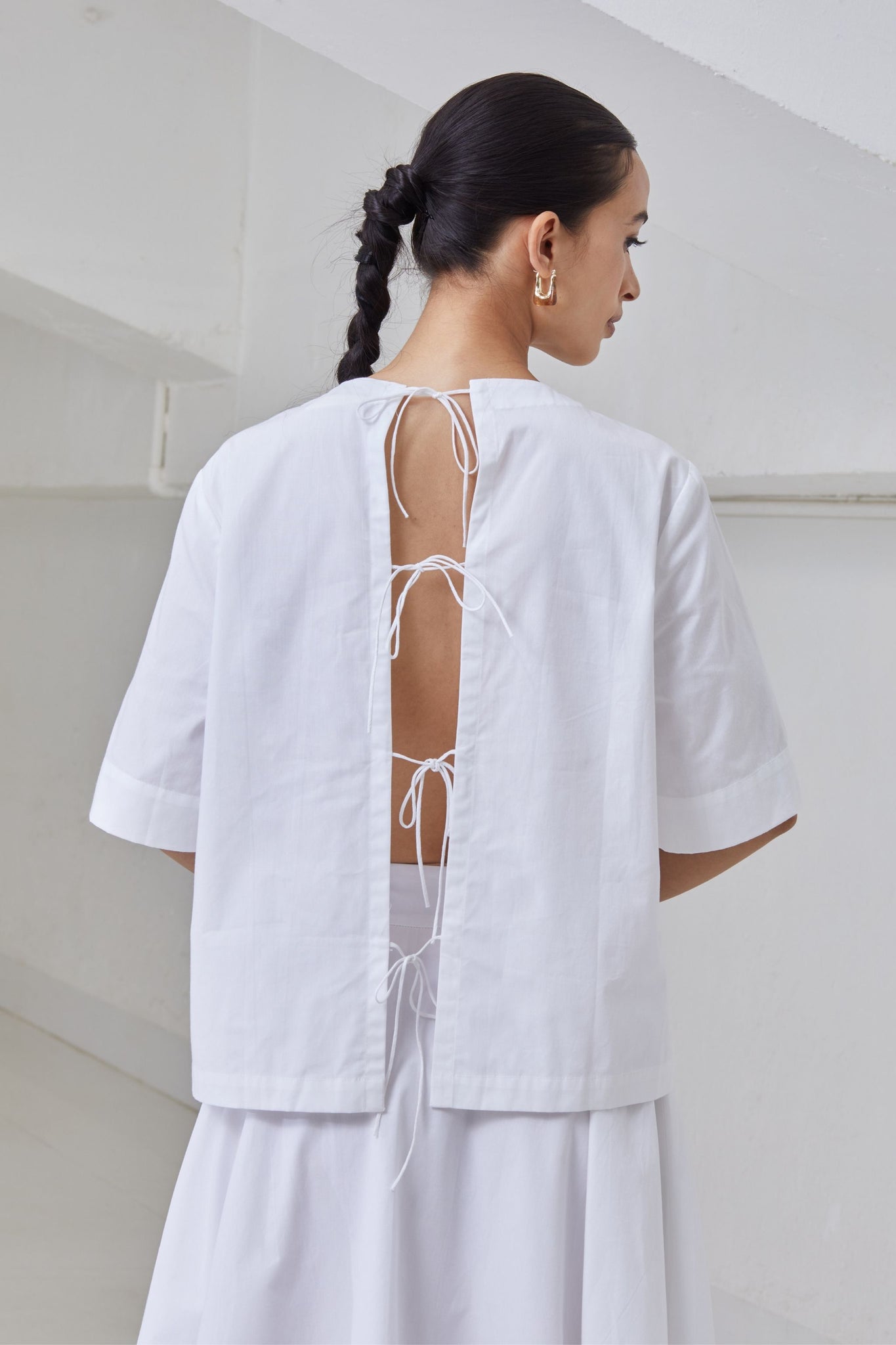 Boxy top with a close round neck. Open back with tie fasteners. Drop shoulder extends into elbow grazing sleeve.