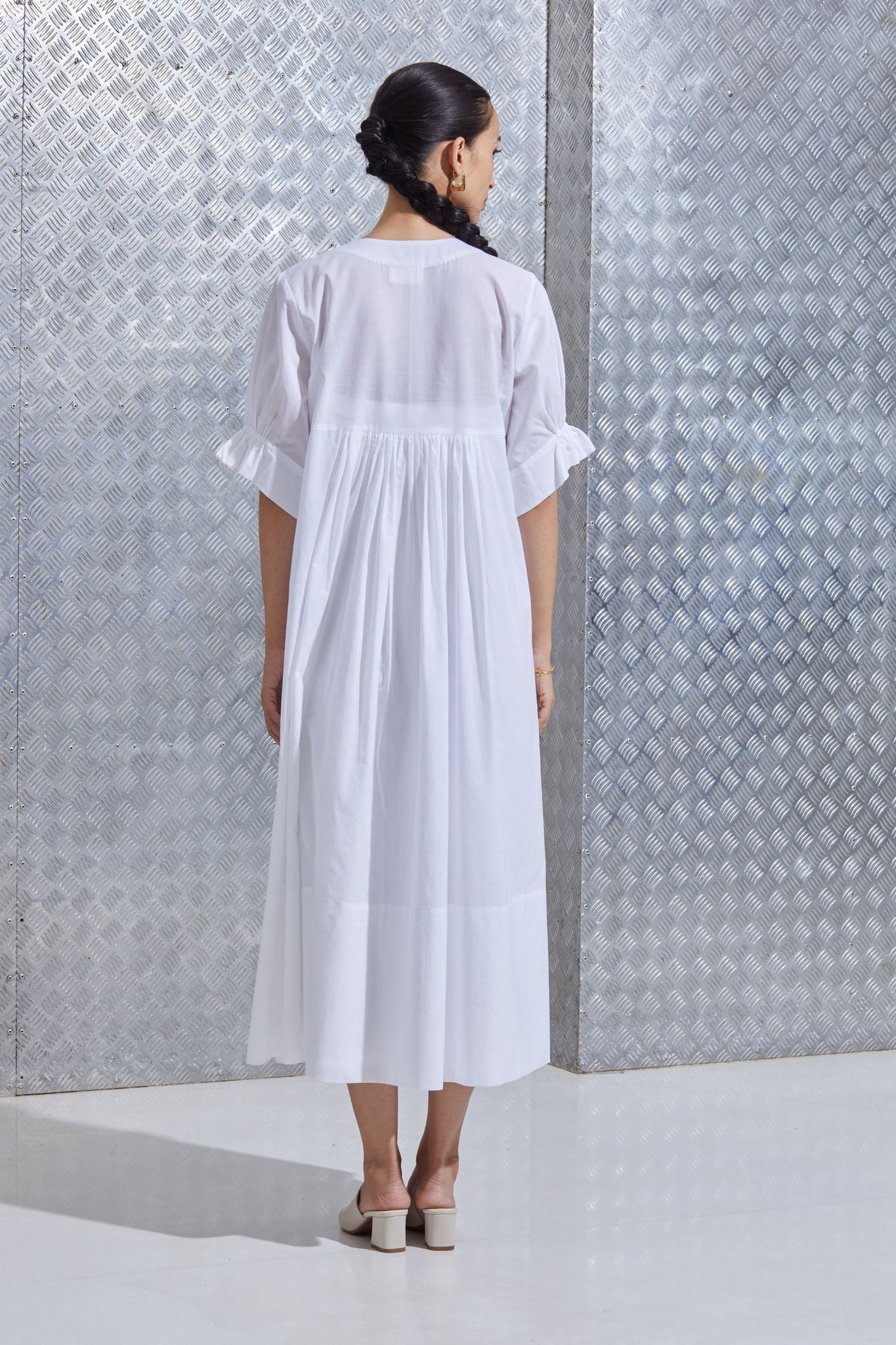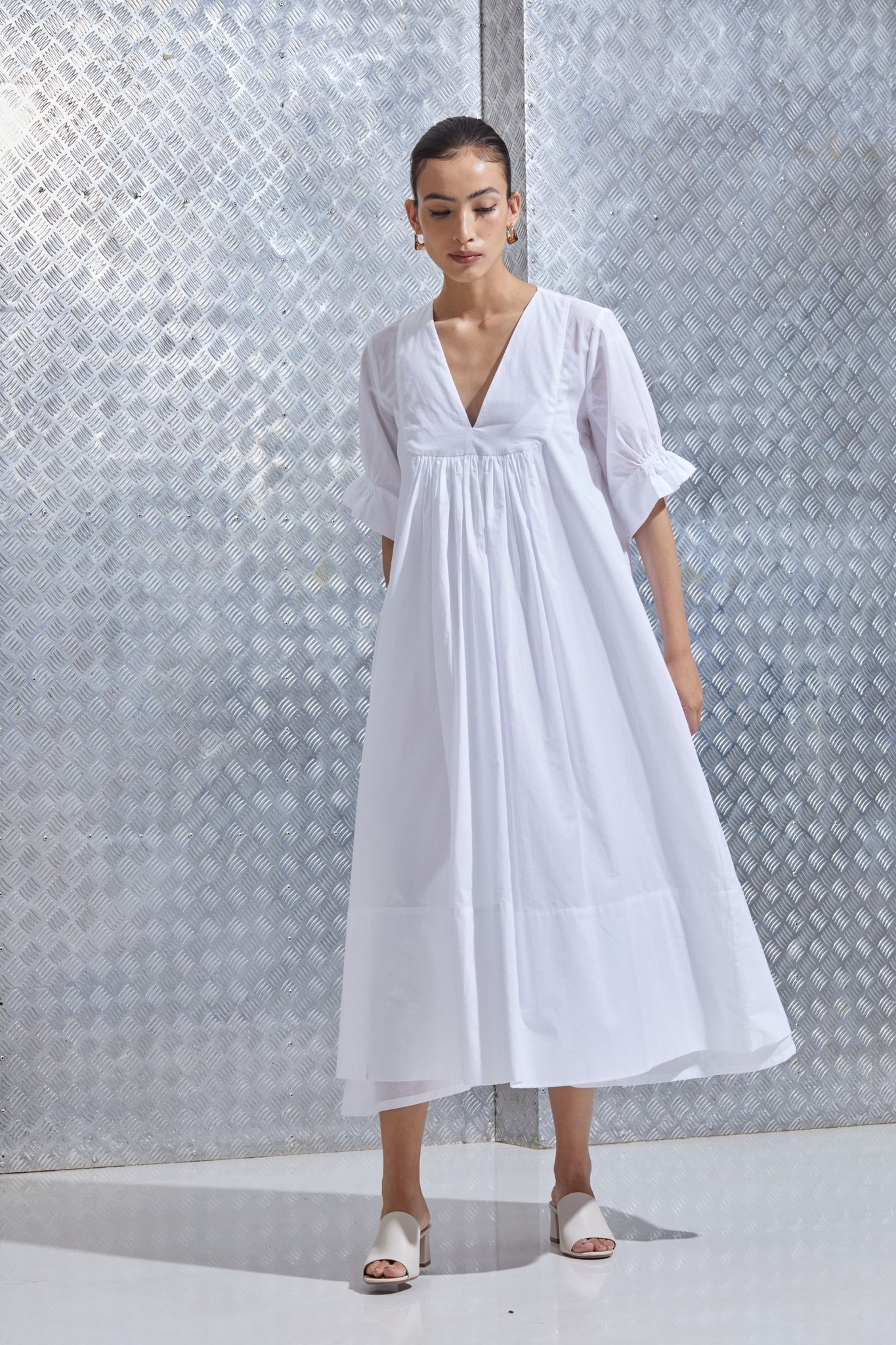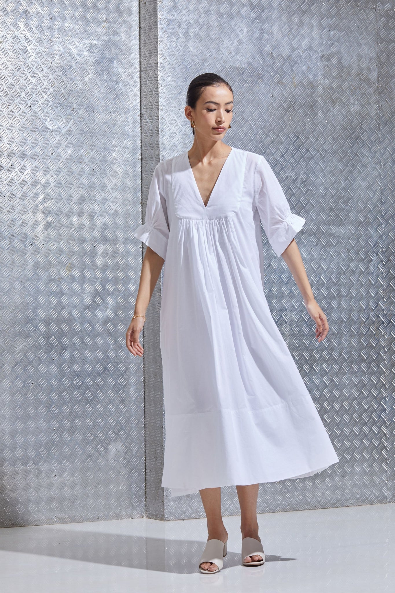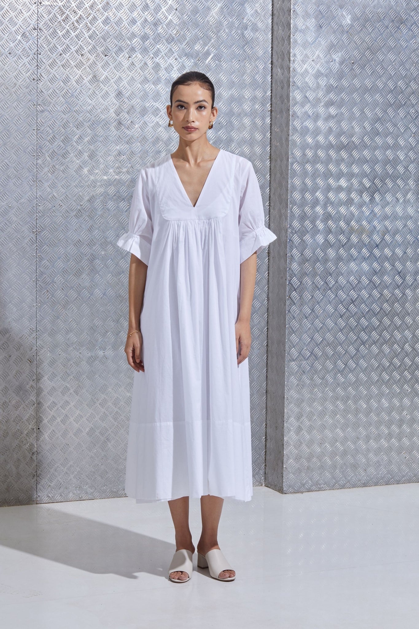 An easy dress in organic cotton. Round yoke with gentle gathers. V-neck. Set-in sleeve finished with an elasticated cuff. No pockets. This dress includes a slip.