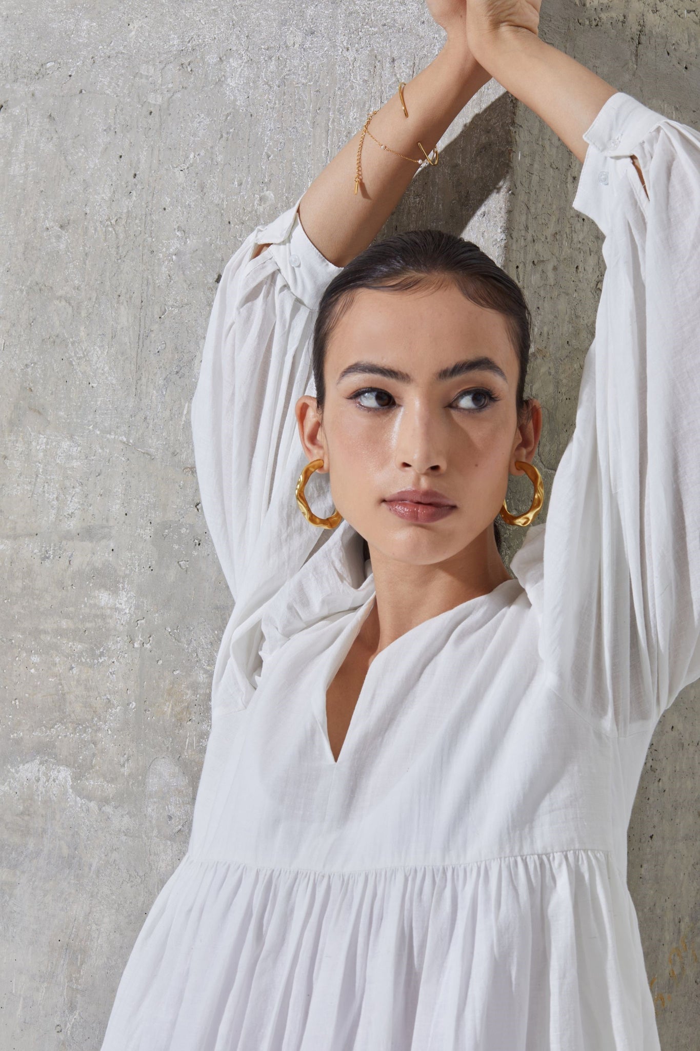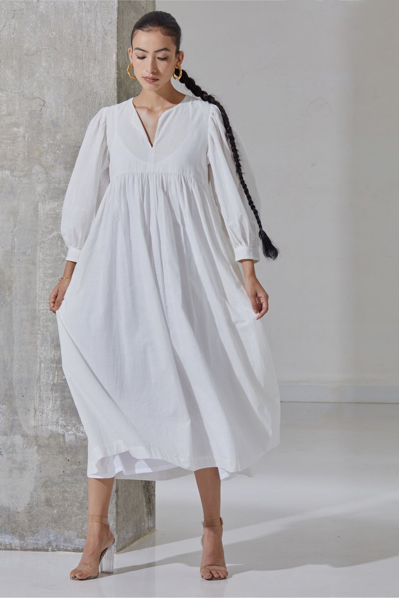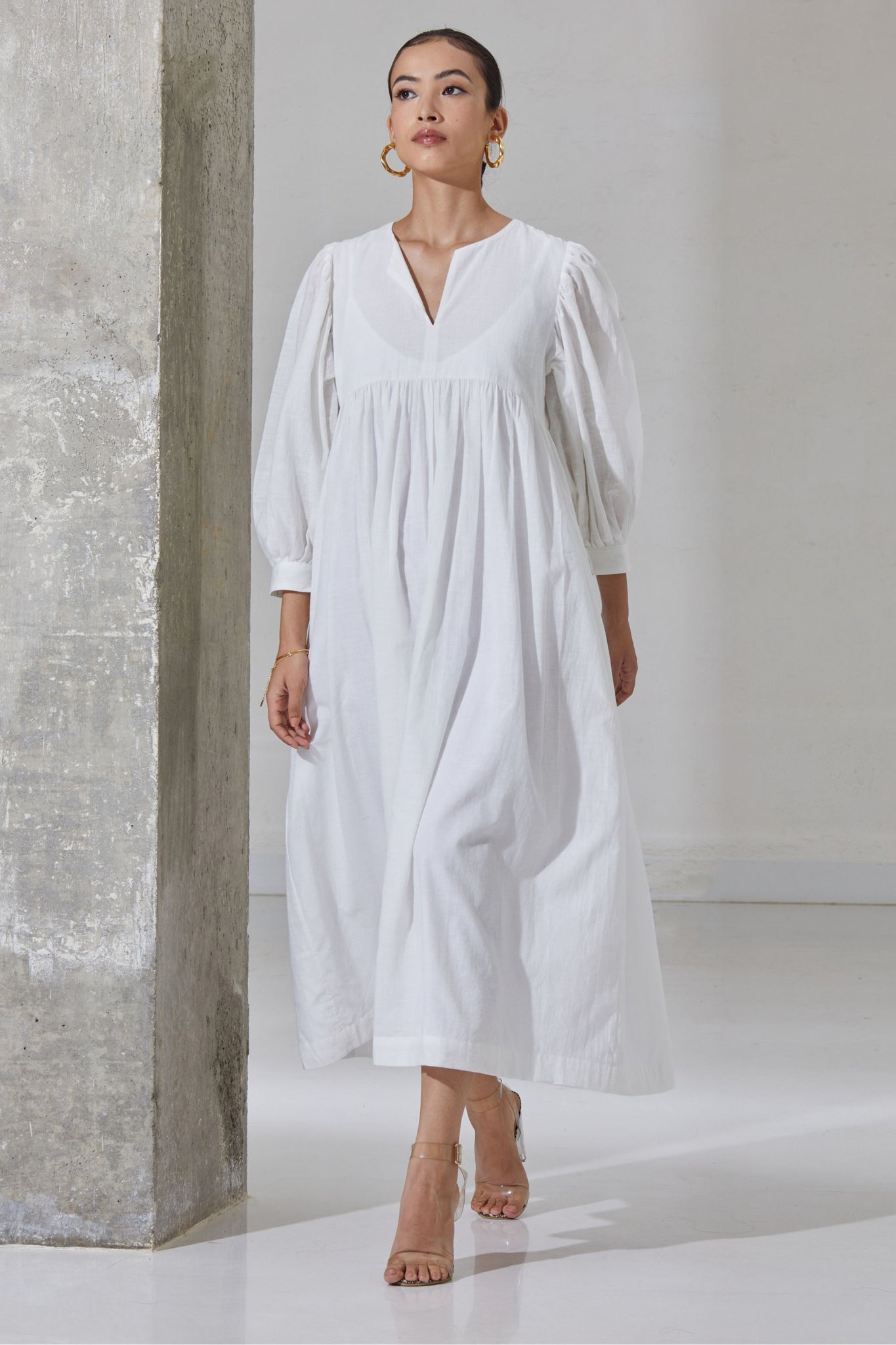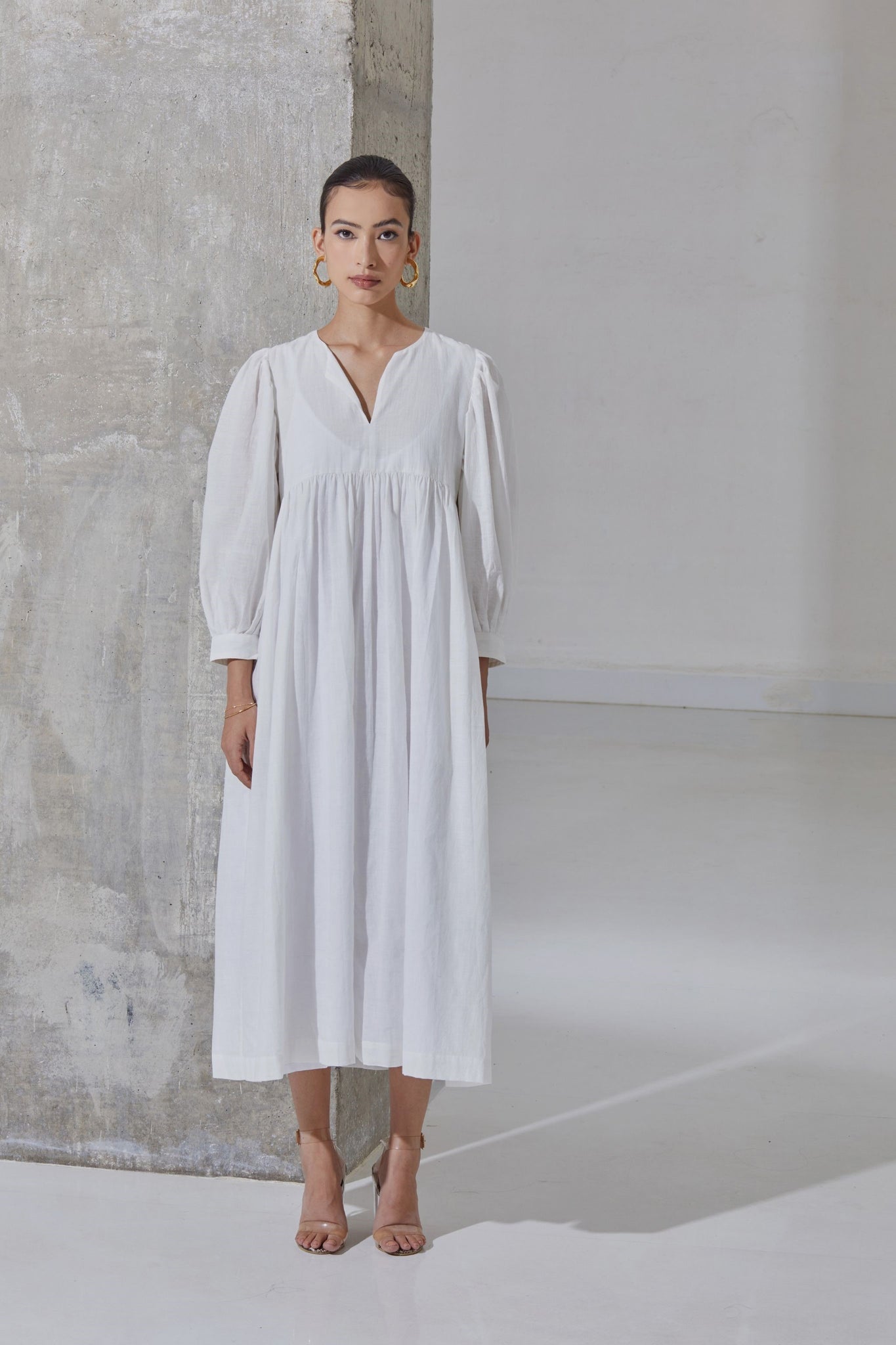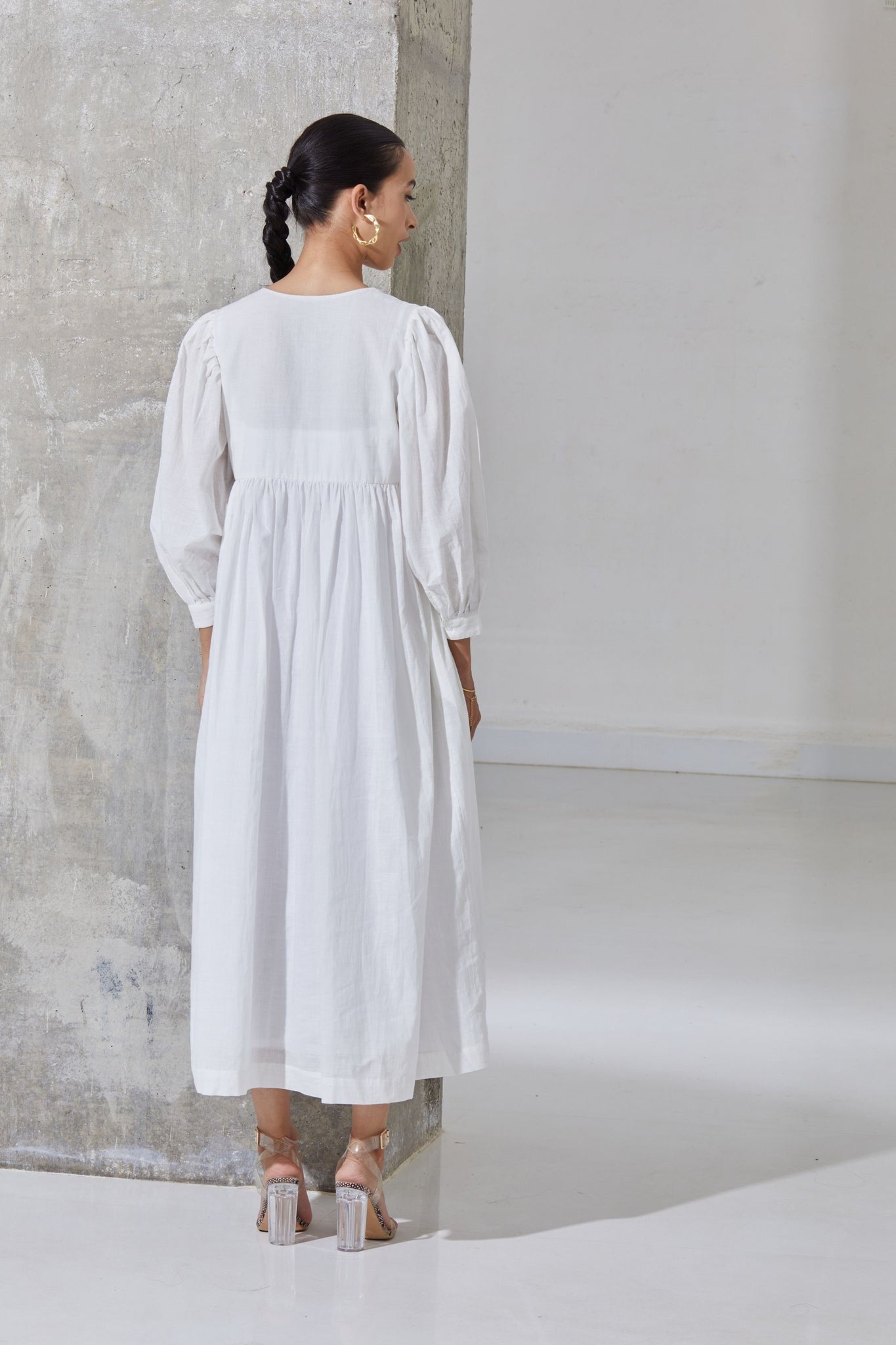 Crafted from luxurious handwoven cotton. Round neckline with needle slit. Three quarter length sleeves. Midi length. Inseam pockets. Unlined.