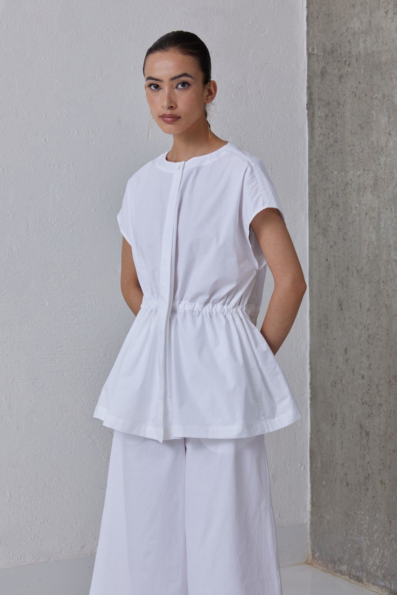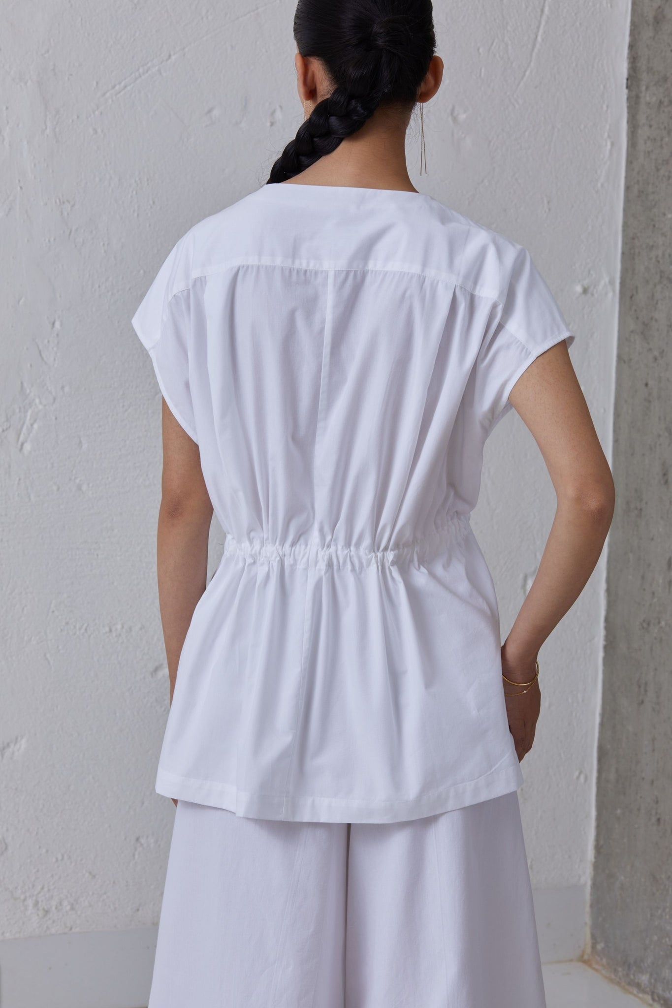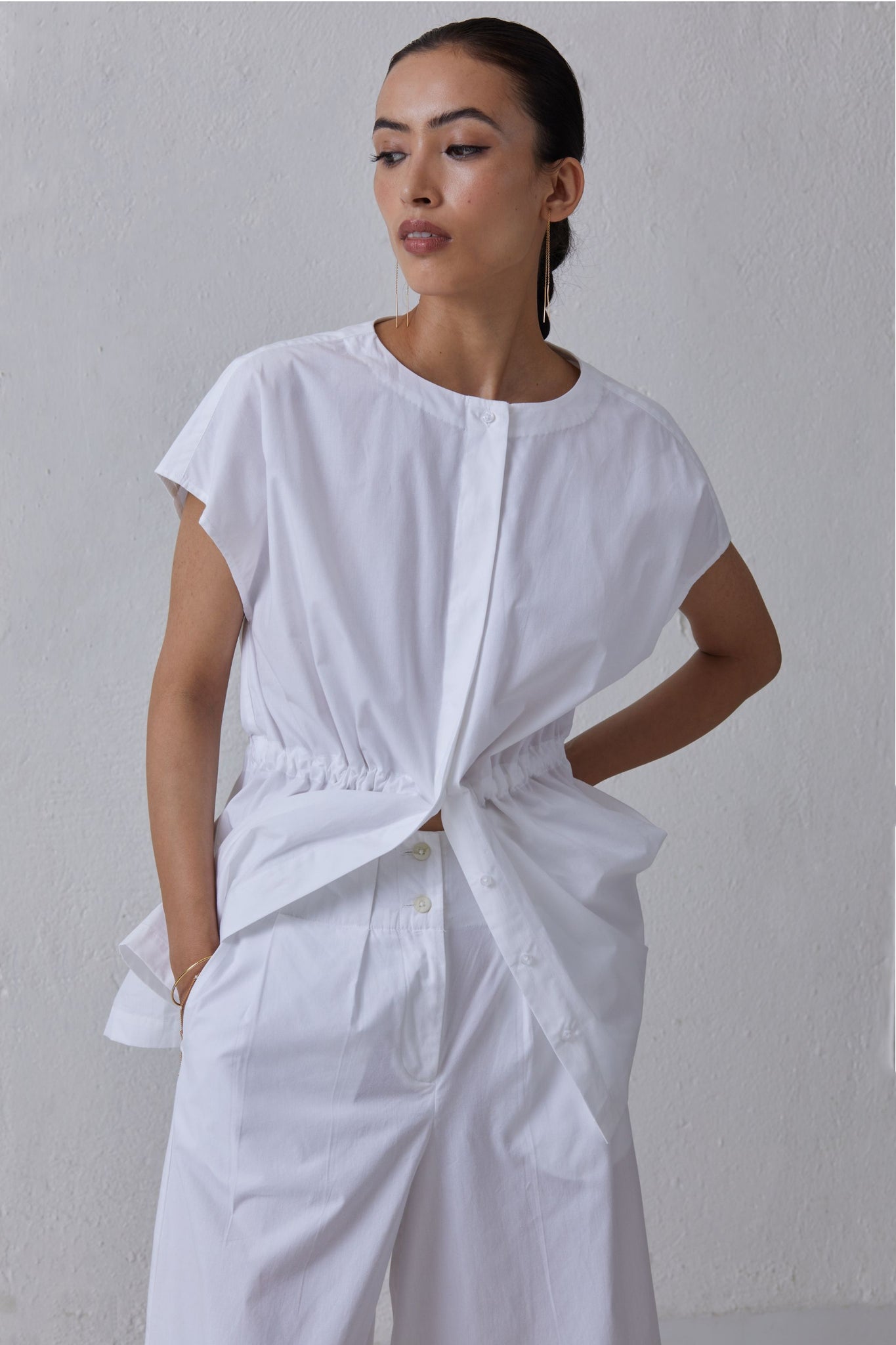 Button down top in organic cotton. Inner adjustable drawstring for desired cinch at waist. Concealed placket. Subtle drop shoulder.