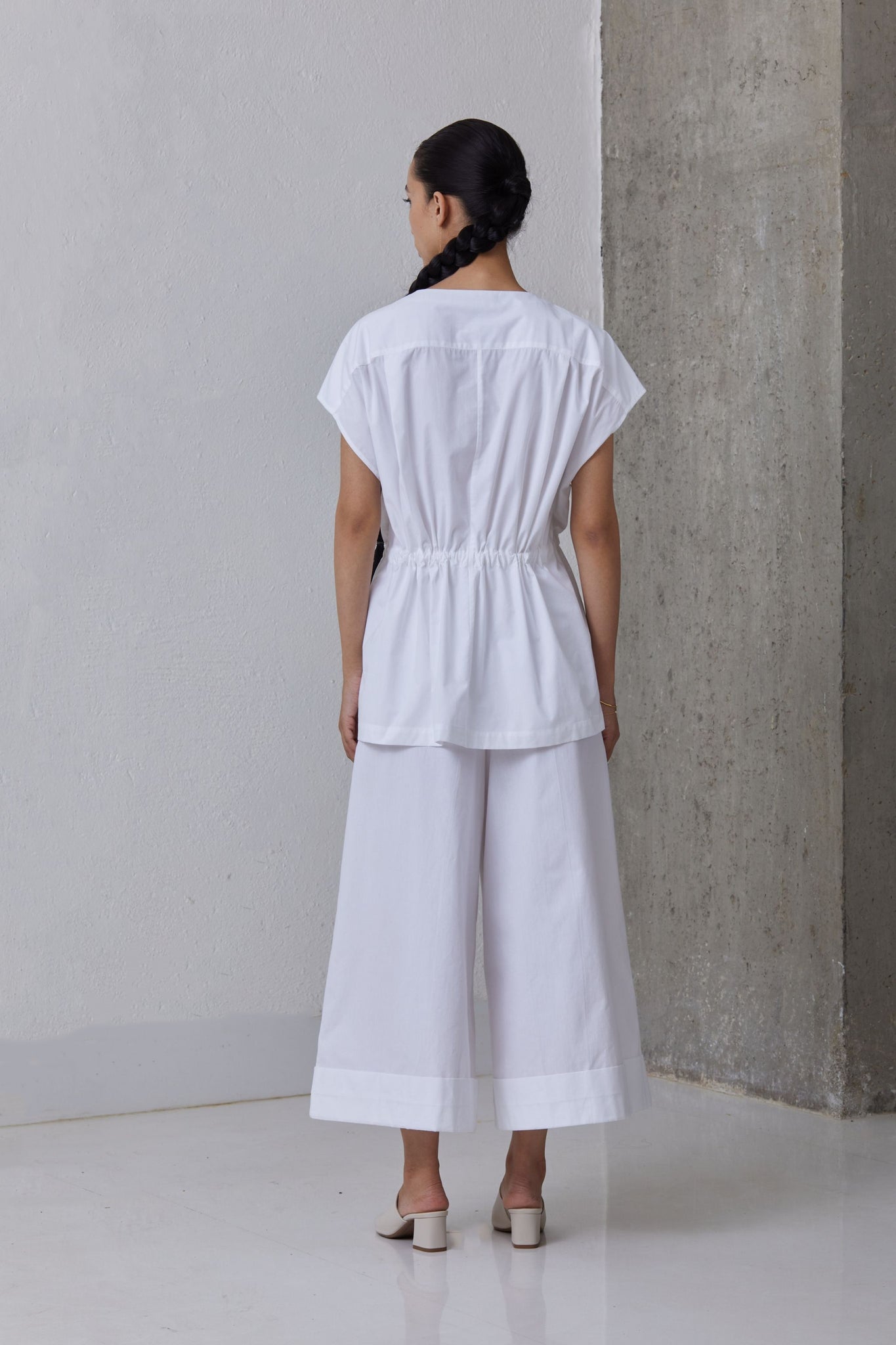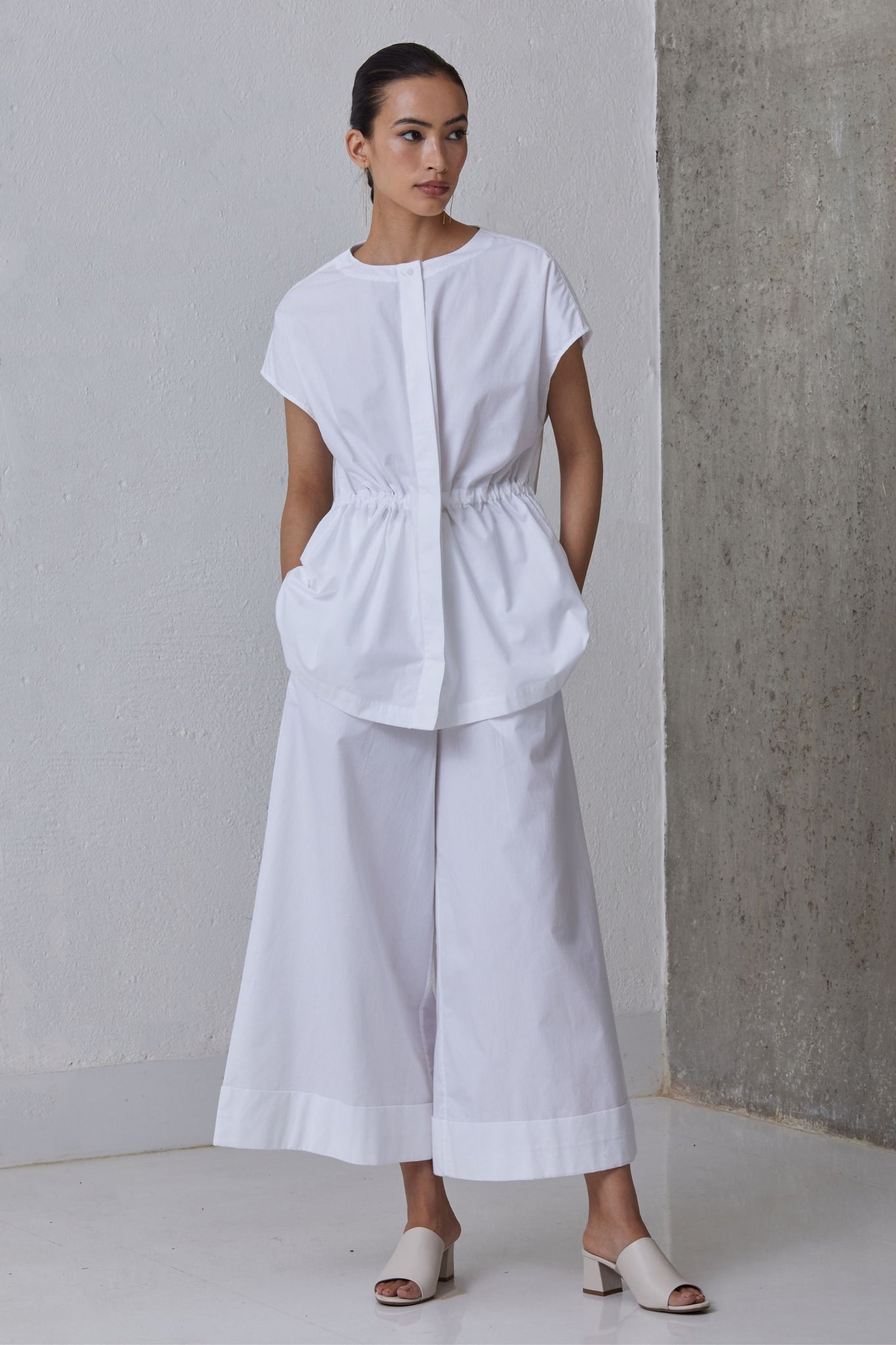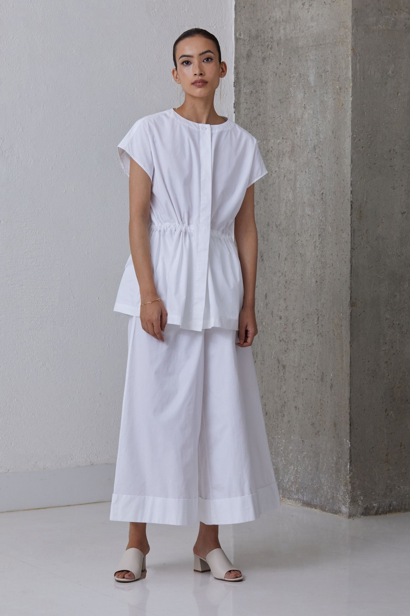 Button down top in organic cotton. Inner adjustable drawstring for desired cinch at waist. Concealed placket. Subtle drop shoulder.