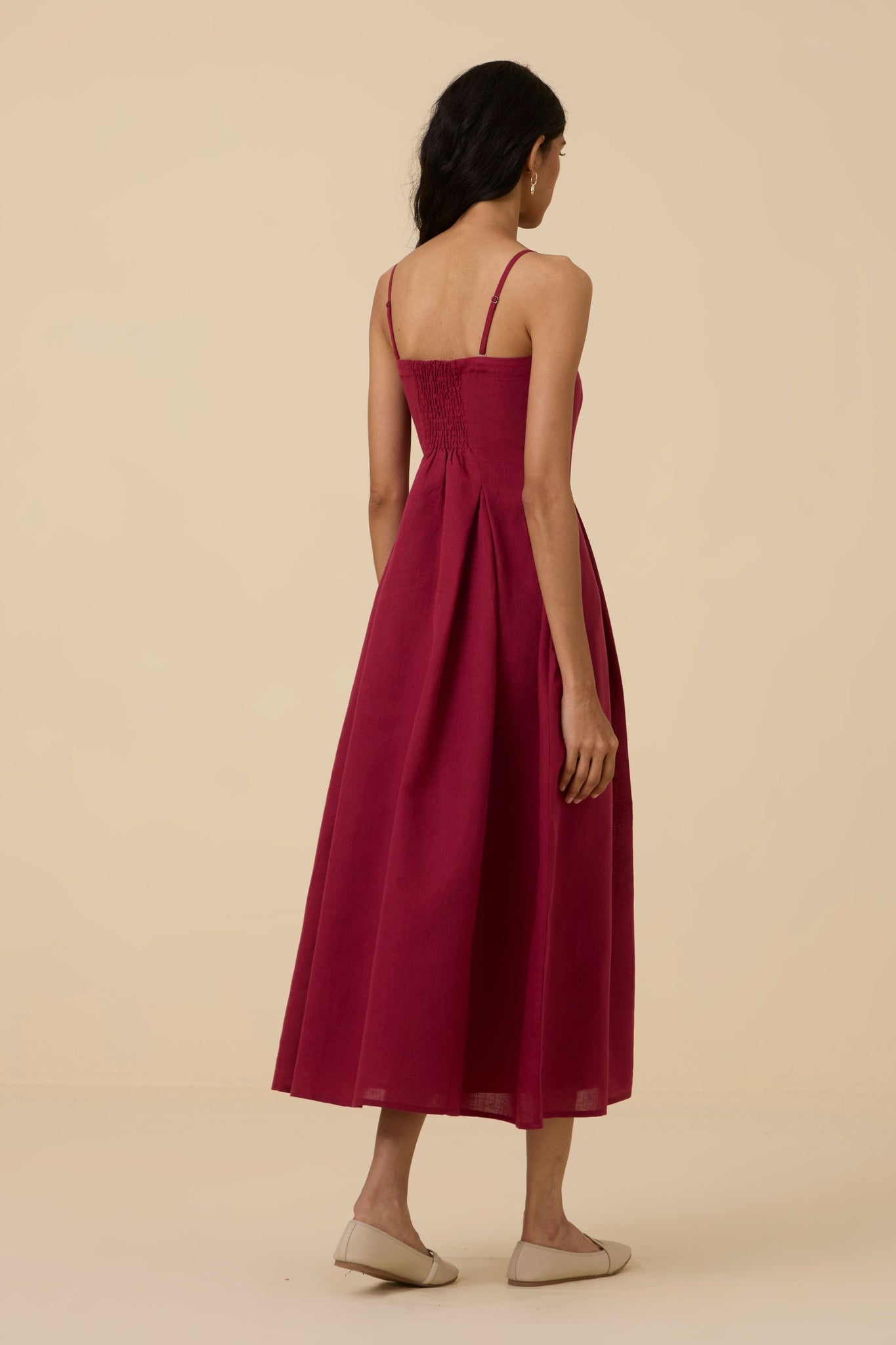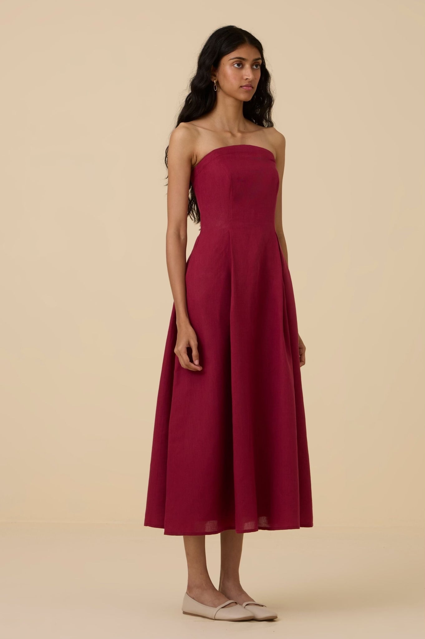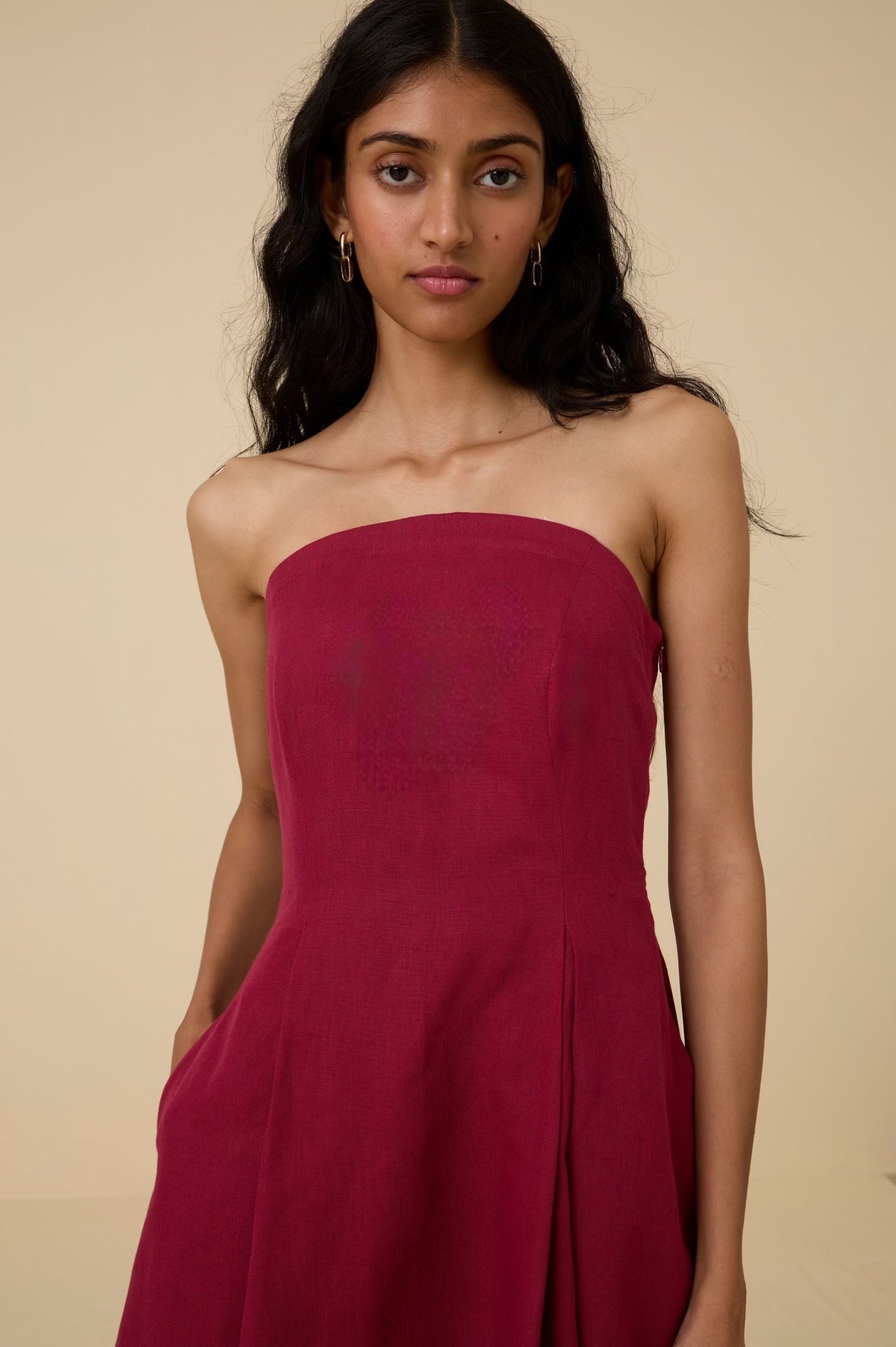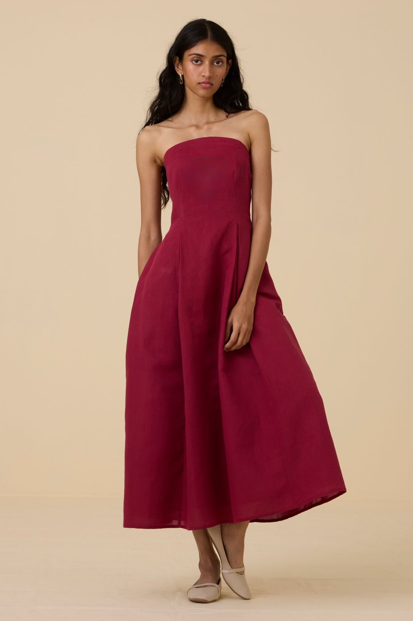 A midi tube dress in linen cotton with a arched neckline. Features darts and smocking on the back for a perfect fit. Comes with a removable and adjustable strap. In-seam pockets. Fully lined. Side zipper fastening.