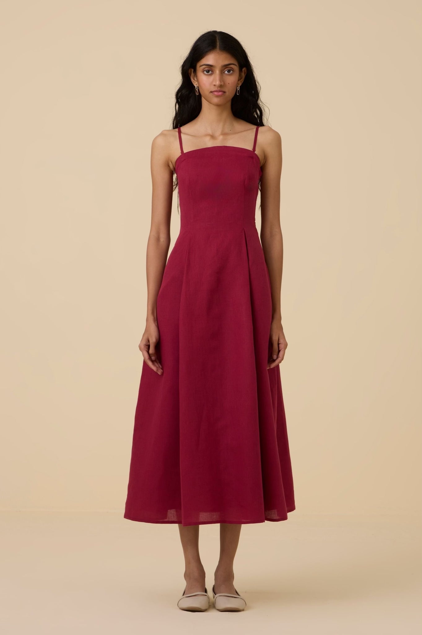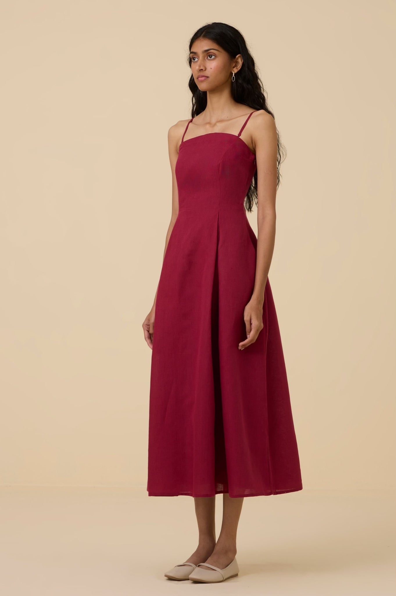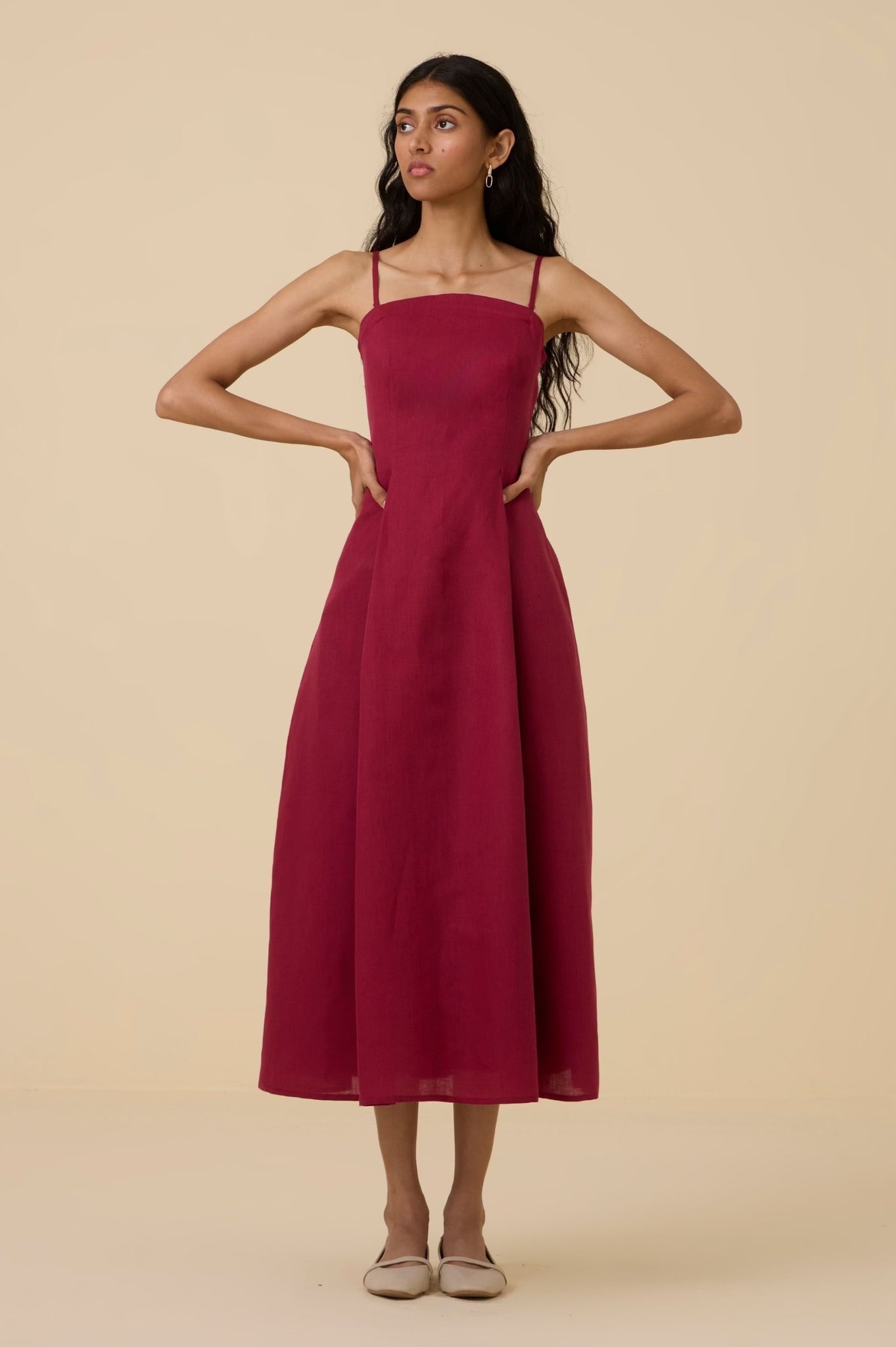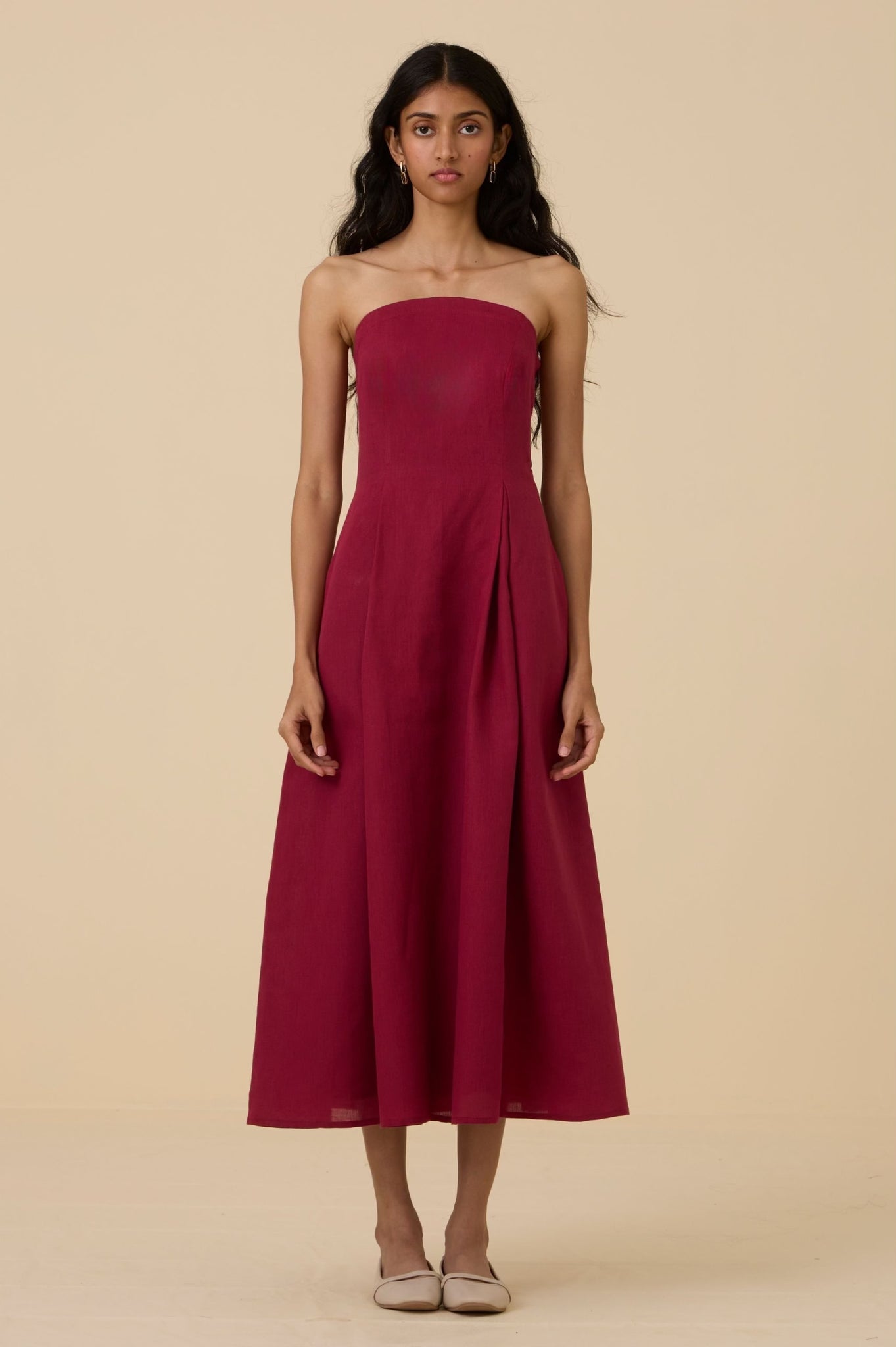 A midi tube dress in linen cotton with a arched neckline. Features darts and smocking on the back for a perfect fit. Comes with a removable and adjustable strap. In-seam pockets. Fully lined. Side zipper fastening.
