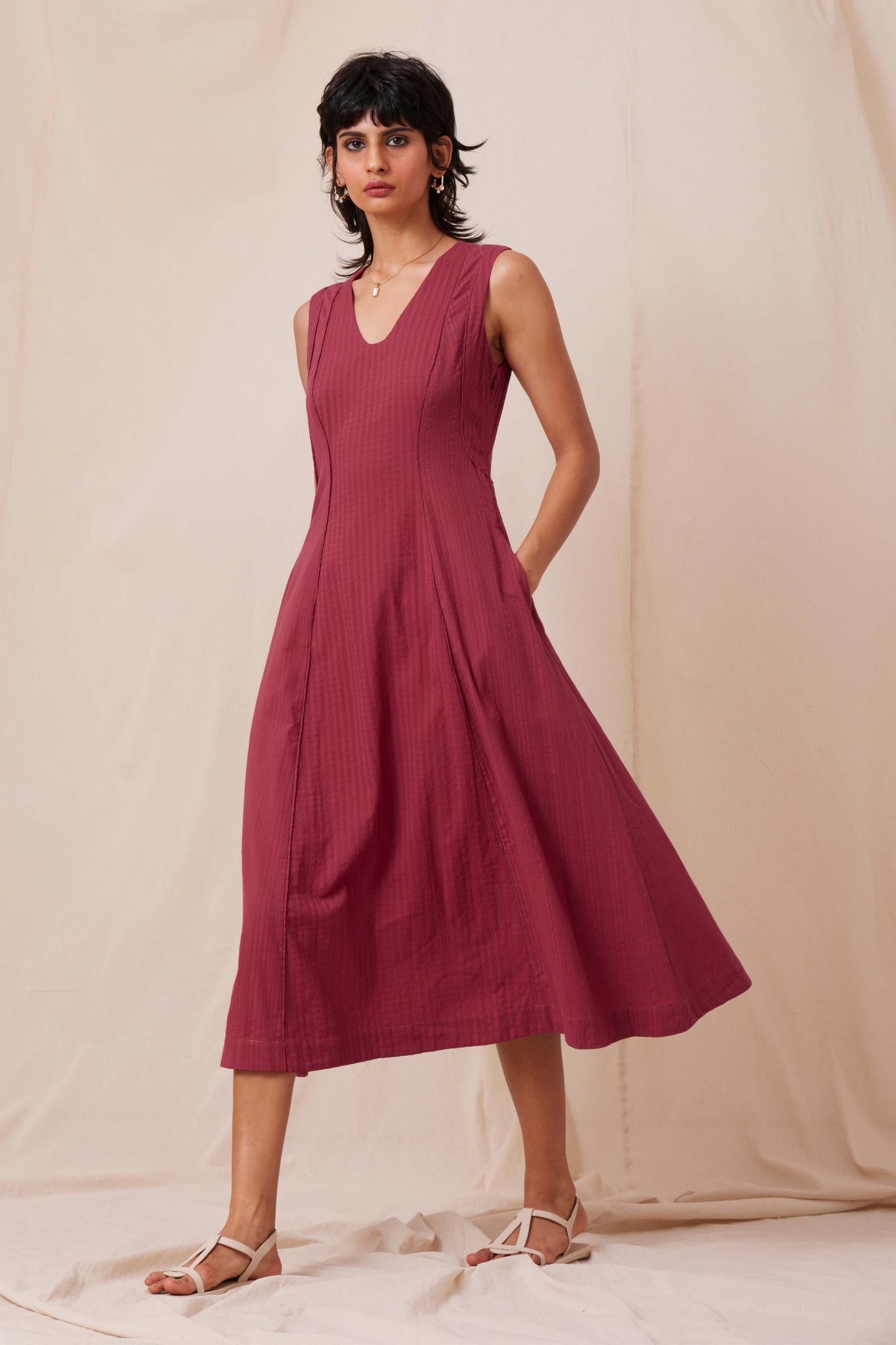 Intricately tailored for a fresh take on fit and flare. Soft V-neckline. Flattering paneling with piping detail. Inseam pockets. Side zip fastening. This dress is fully lined.