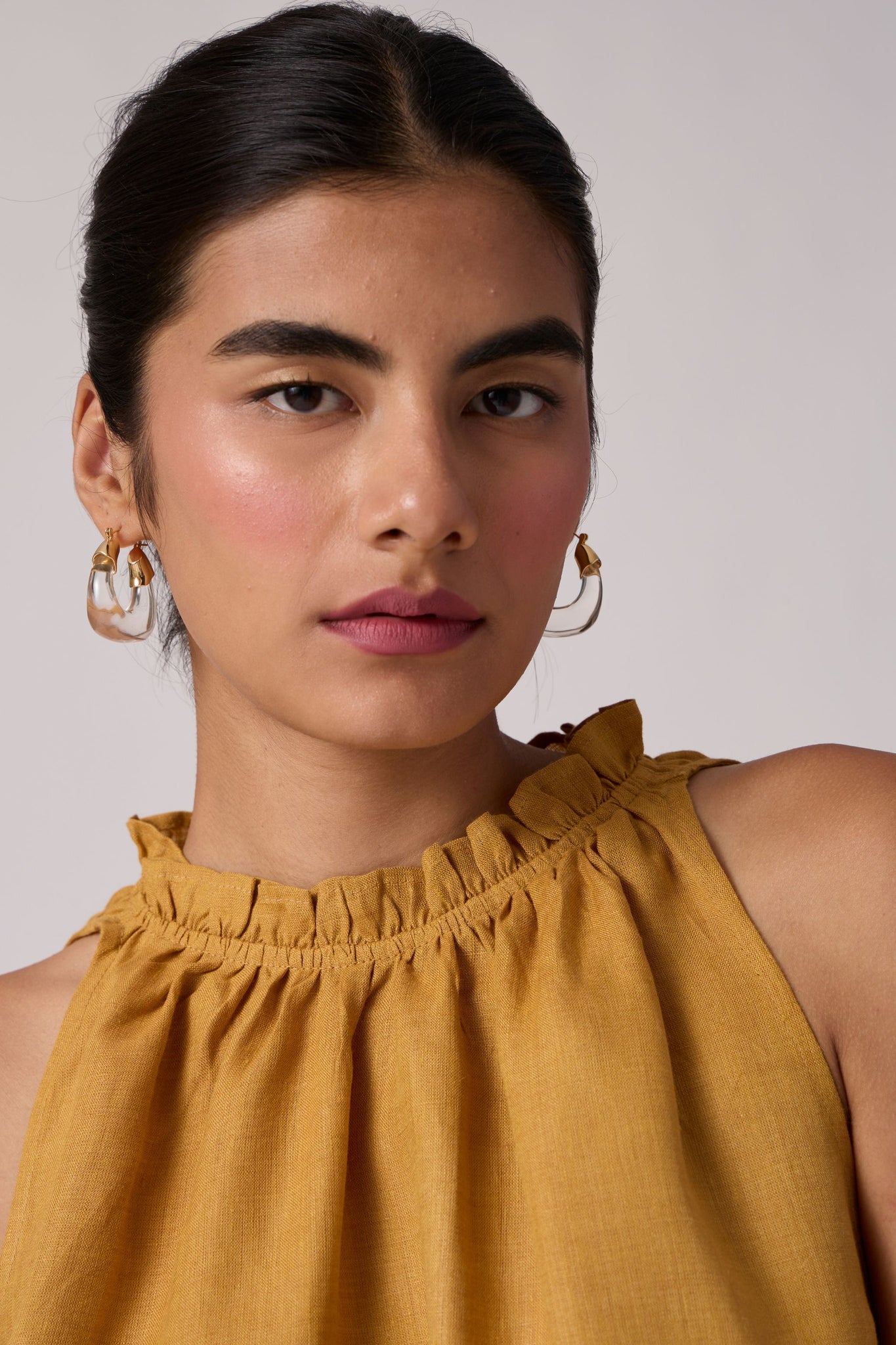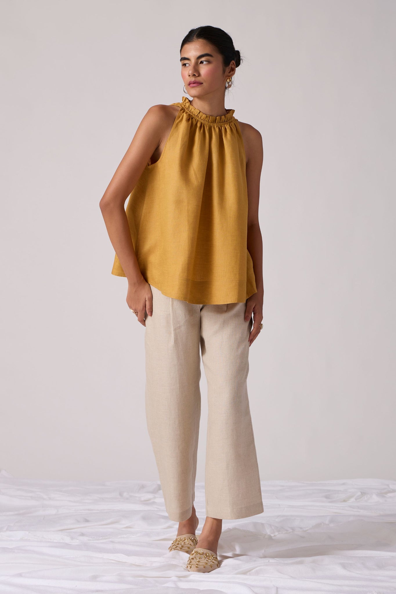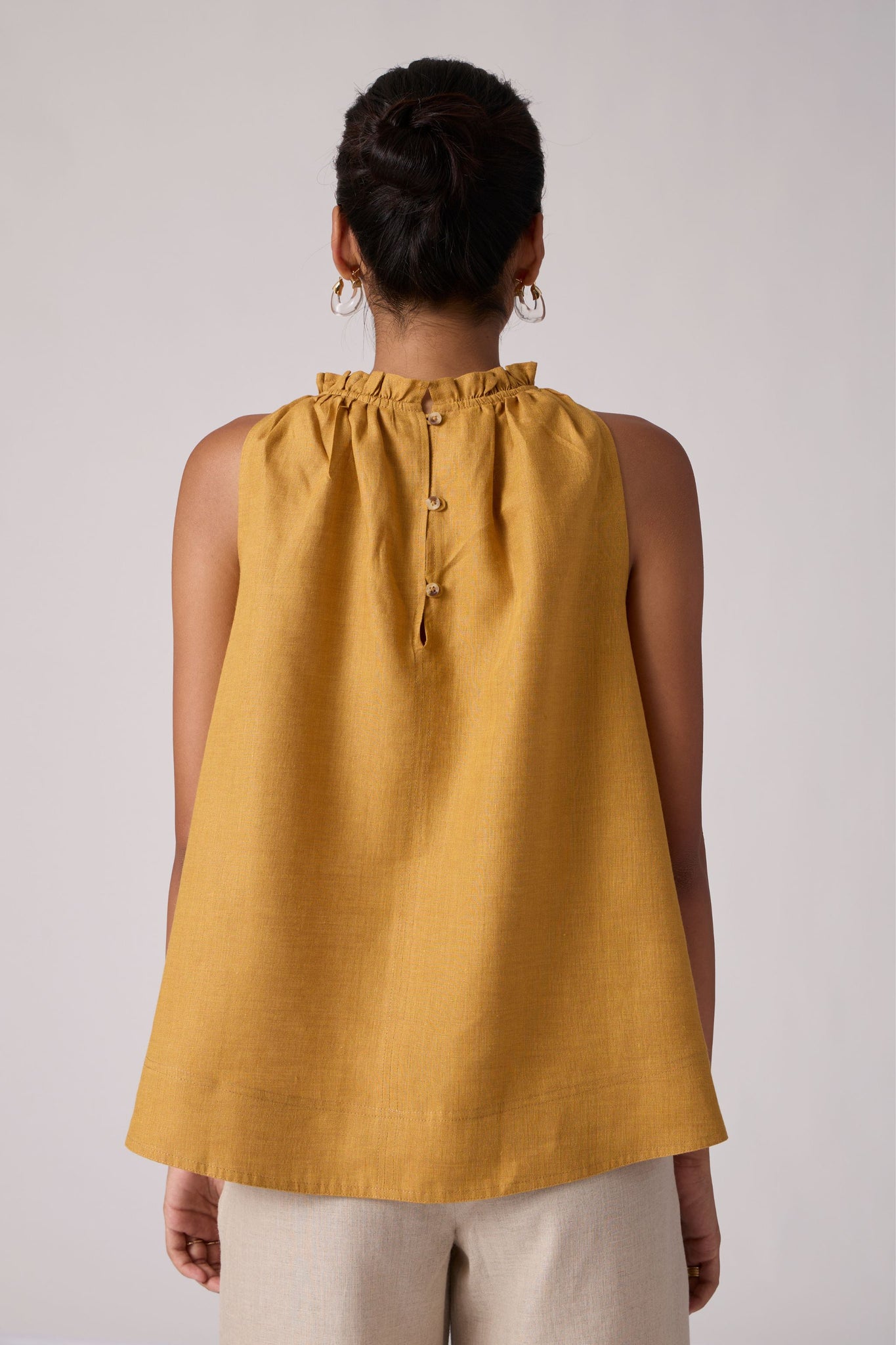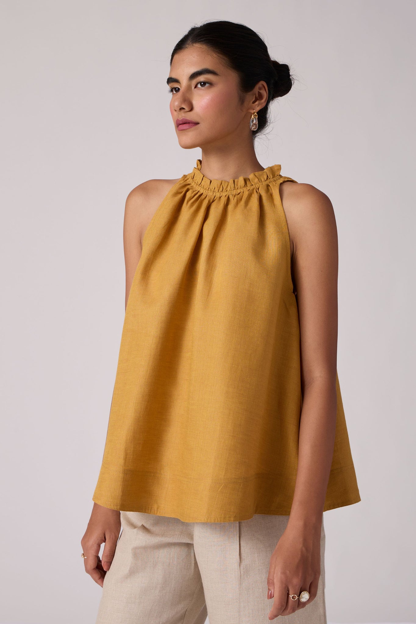 A chic sleeveless halter neck top crafted from organic linen. Dainty ruffle details adorn the neckline. Convenient loop button fastening on the back.