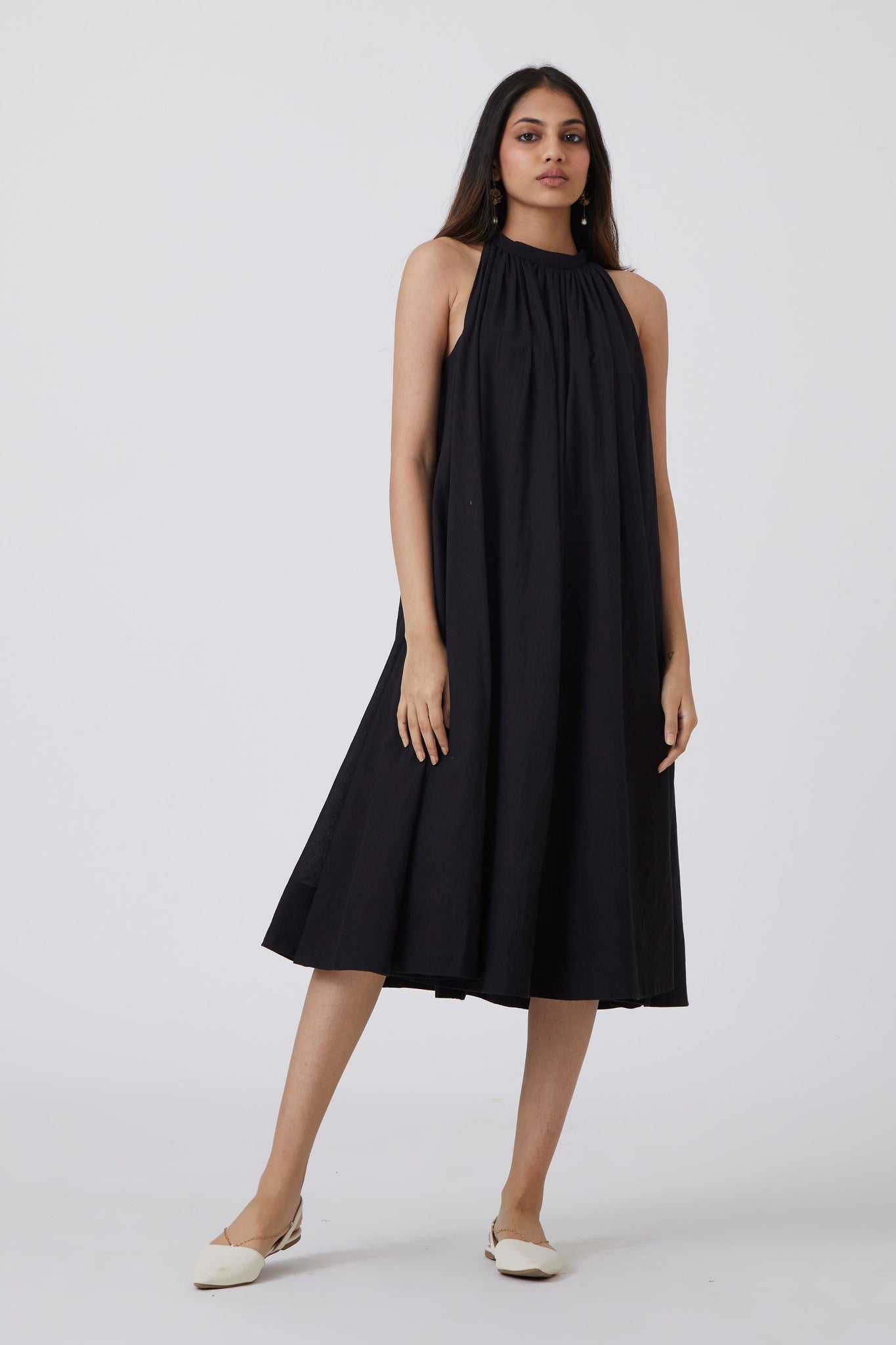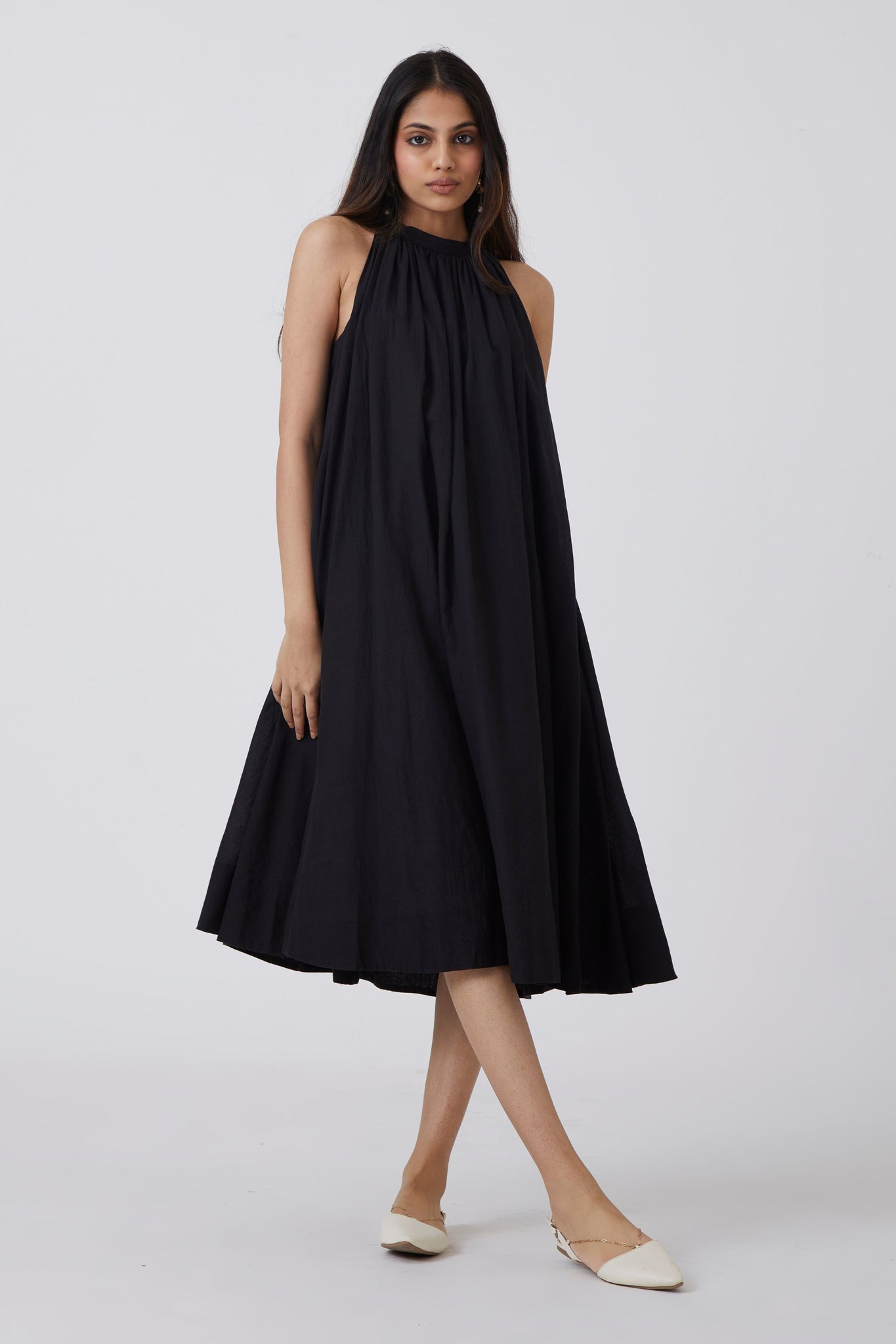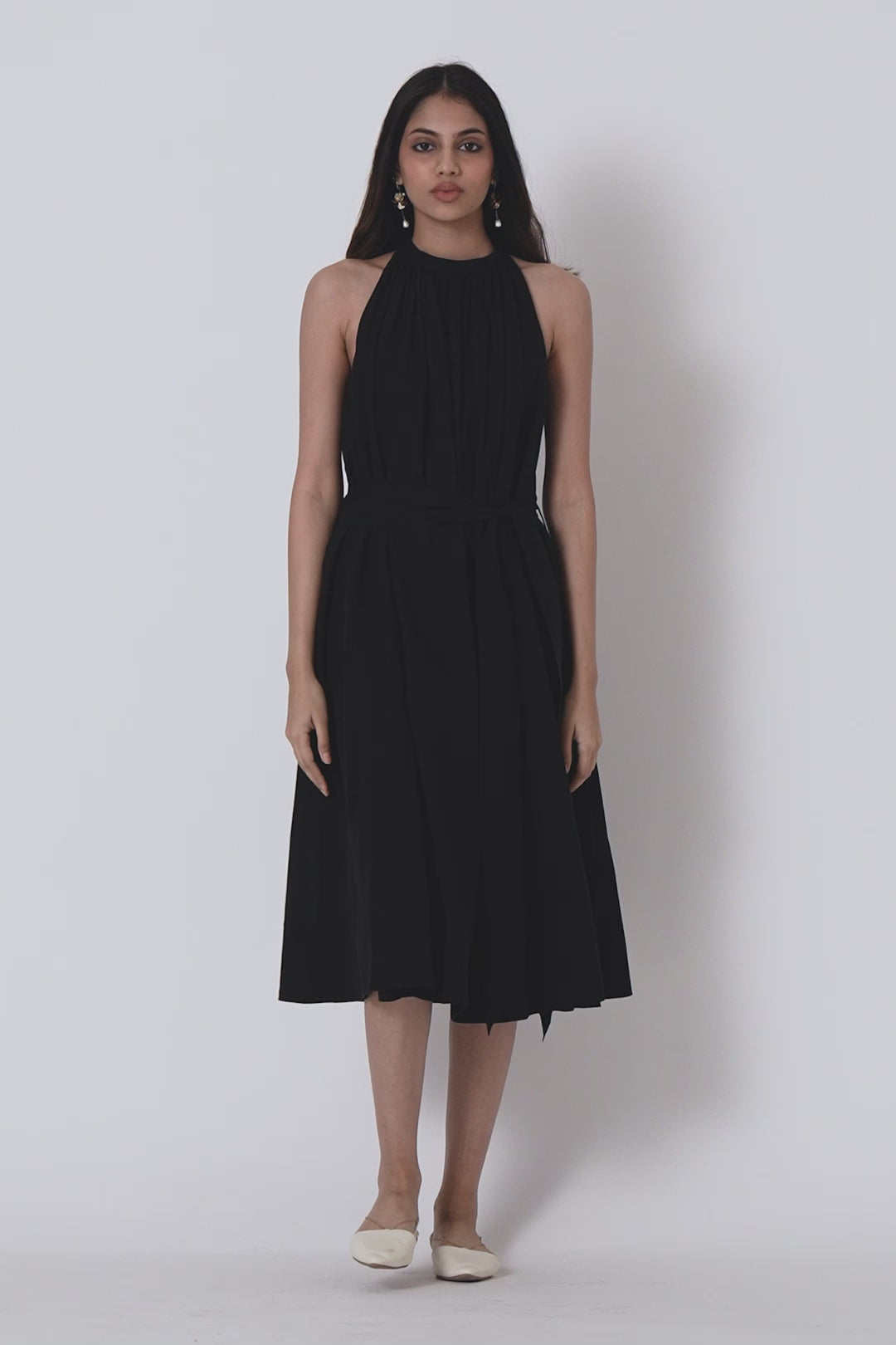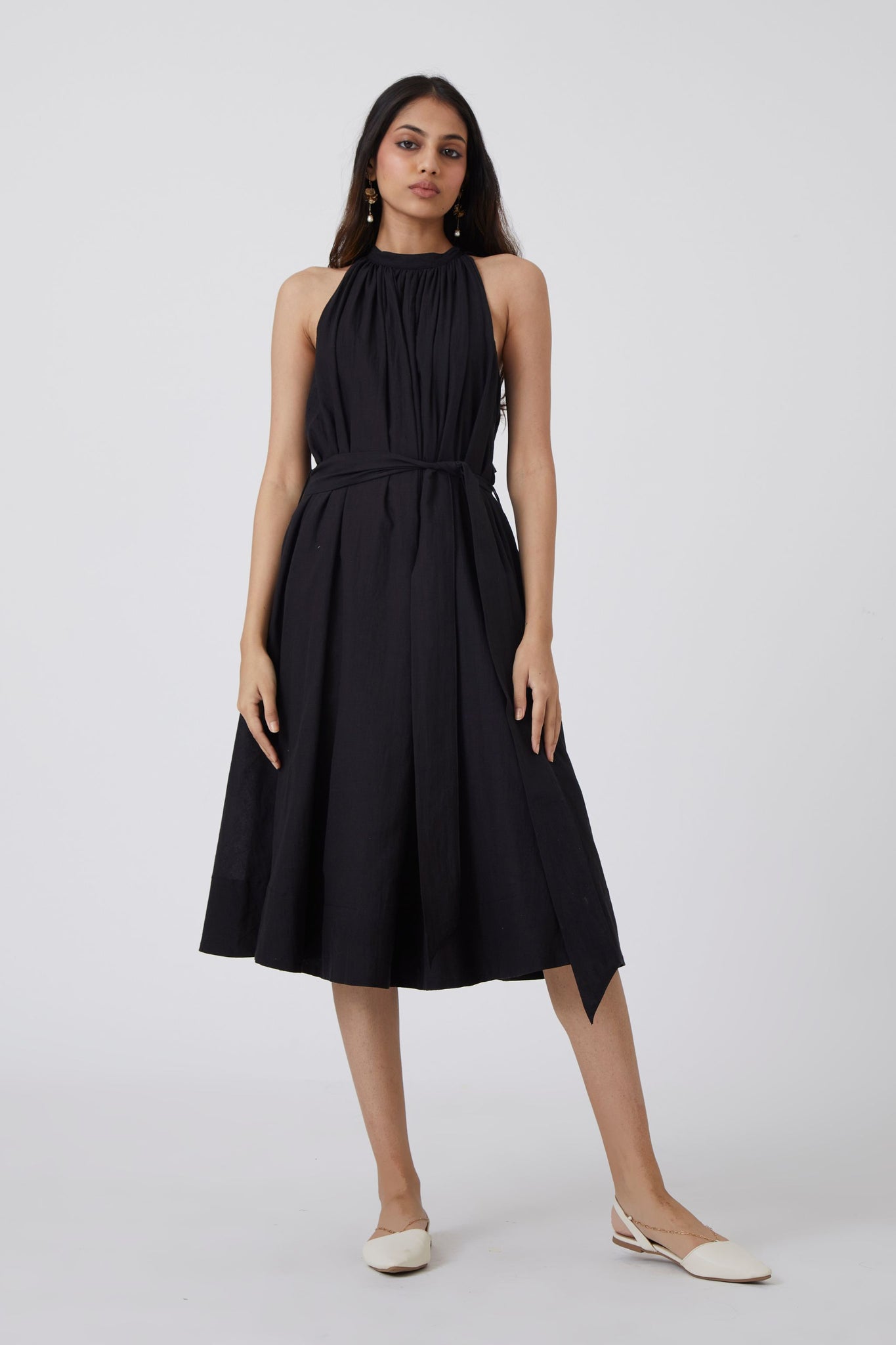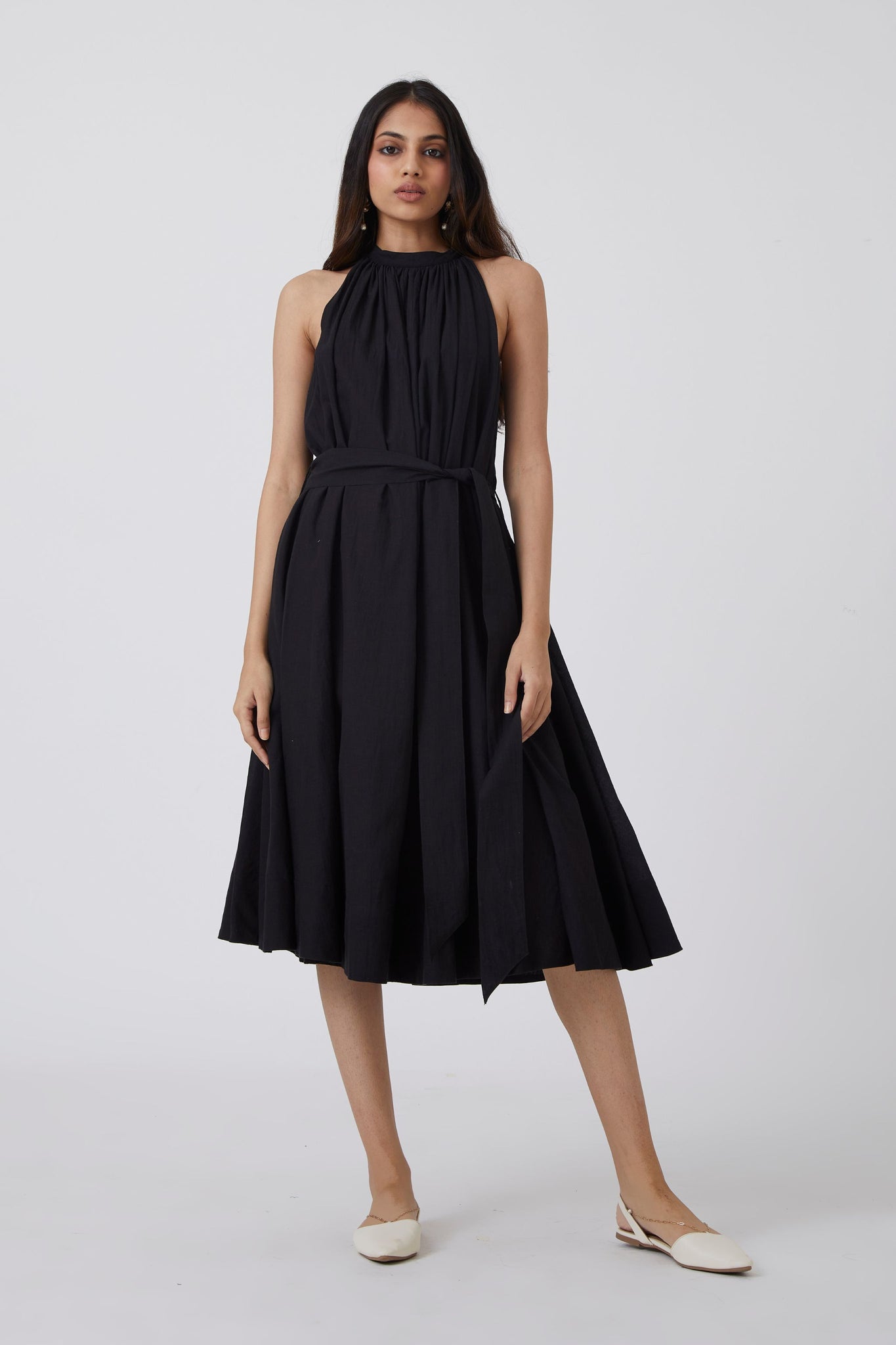A delicate midi dress for urban gypsies. Shoulder revealing sleeves that end into a bow tie behind. Soft gathers at the neck. In-seam pockets. The dress comes with an optional fabric belt.