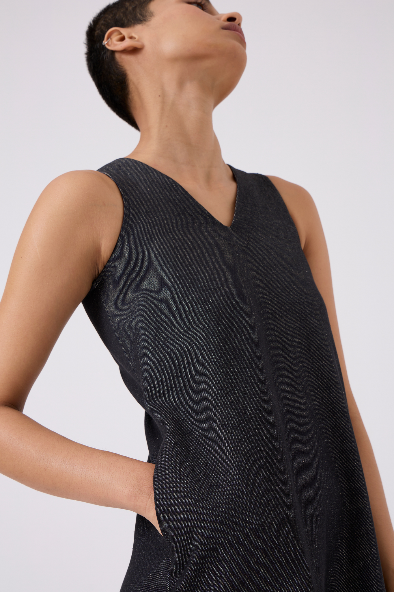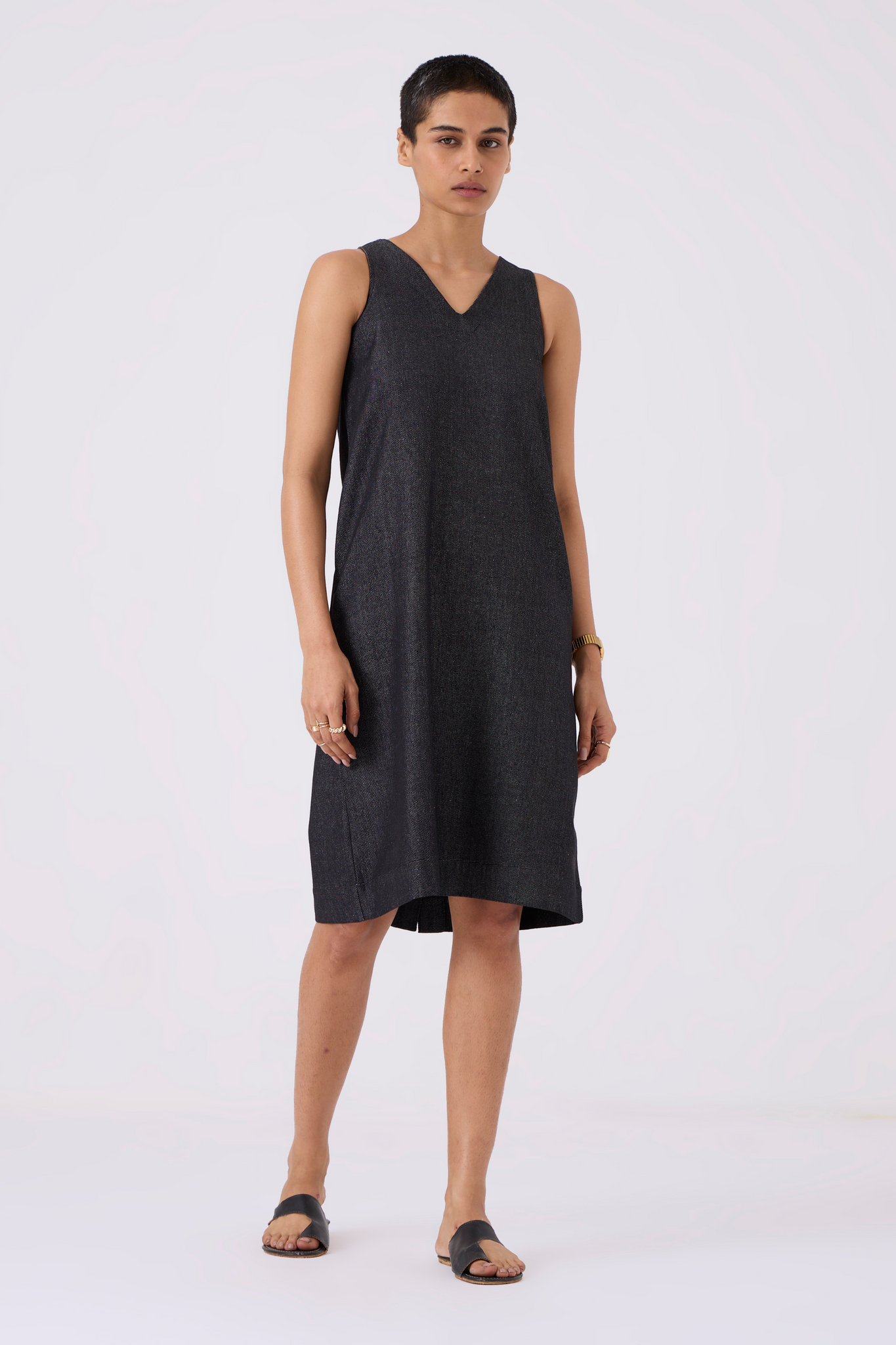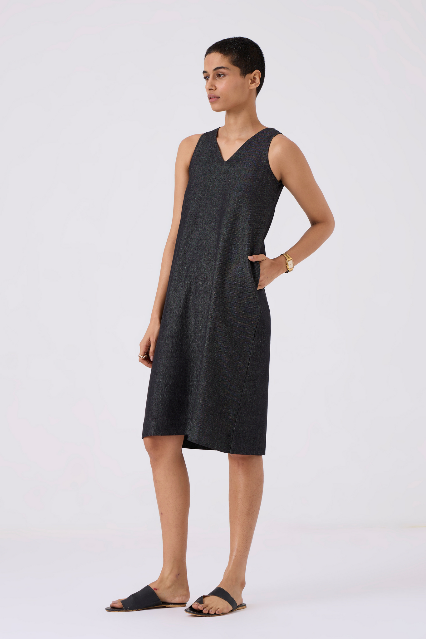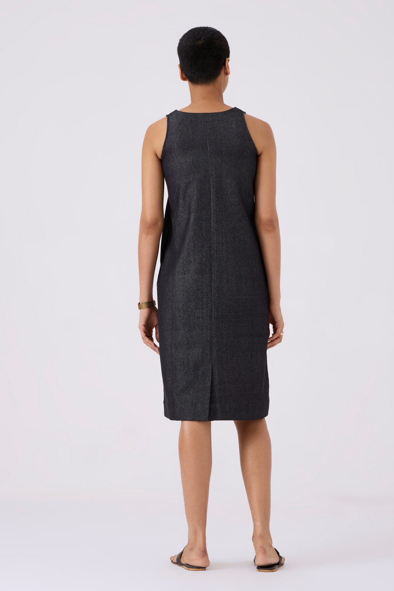 Sleek sleeveless shift dress designed for comfort and style. Back slit enhances movement, while in-seam pockets add practicality.