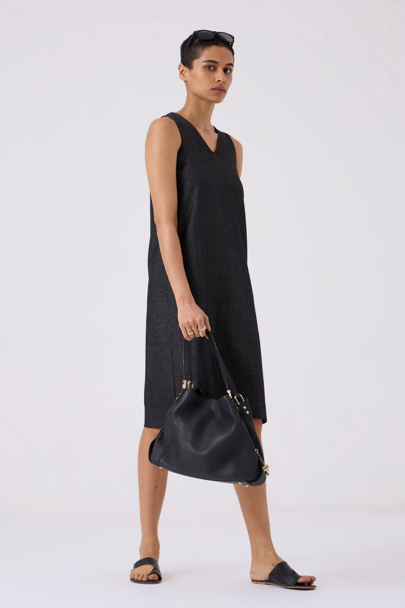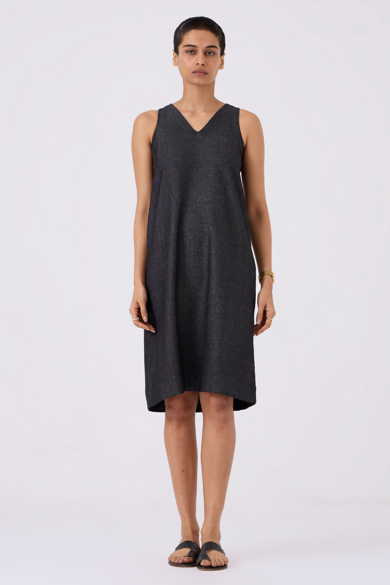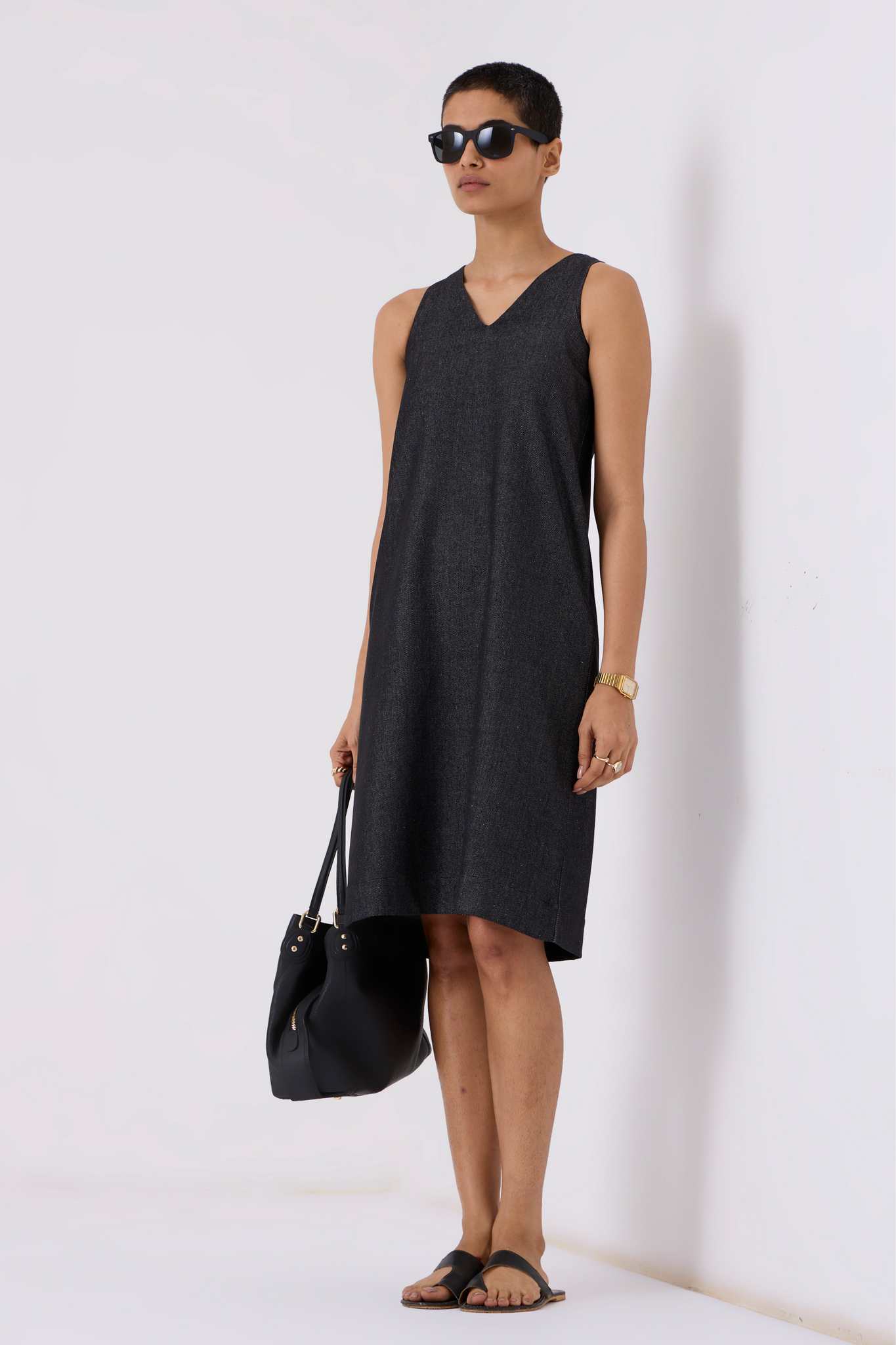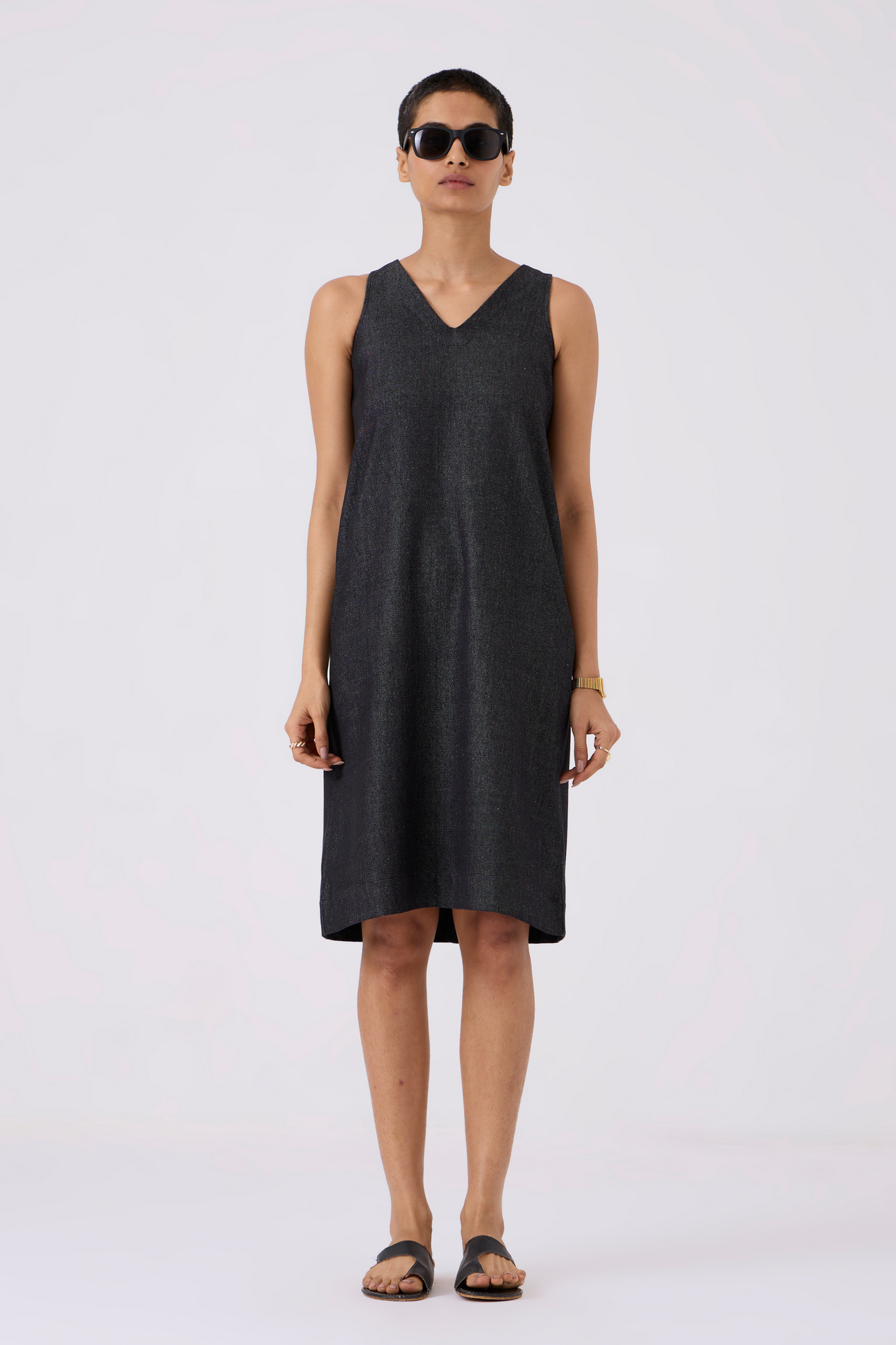 Sleek sleeveless shift dress designed for comfort and style. Back slit enhances movement, while in-seam pockets add practicality.