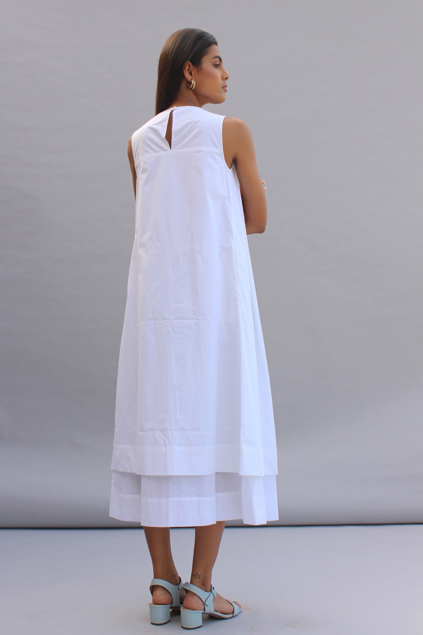 Double layered tunic dress in crisp white. Shoulder box pleats. Single button back opening. Two in-seam pockets. Makes a great travel companion.