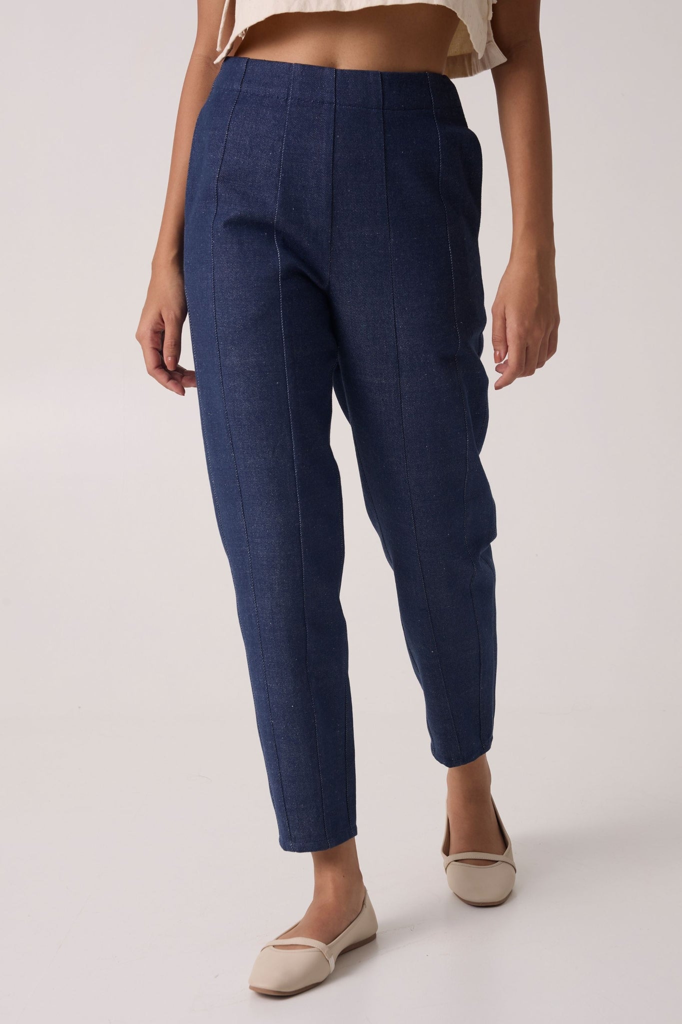 High-rise denim pants with paneling. Inseam pockets and a side zipper fastening.