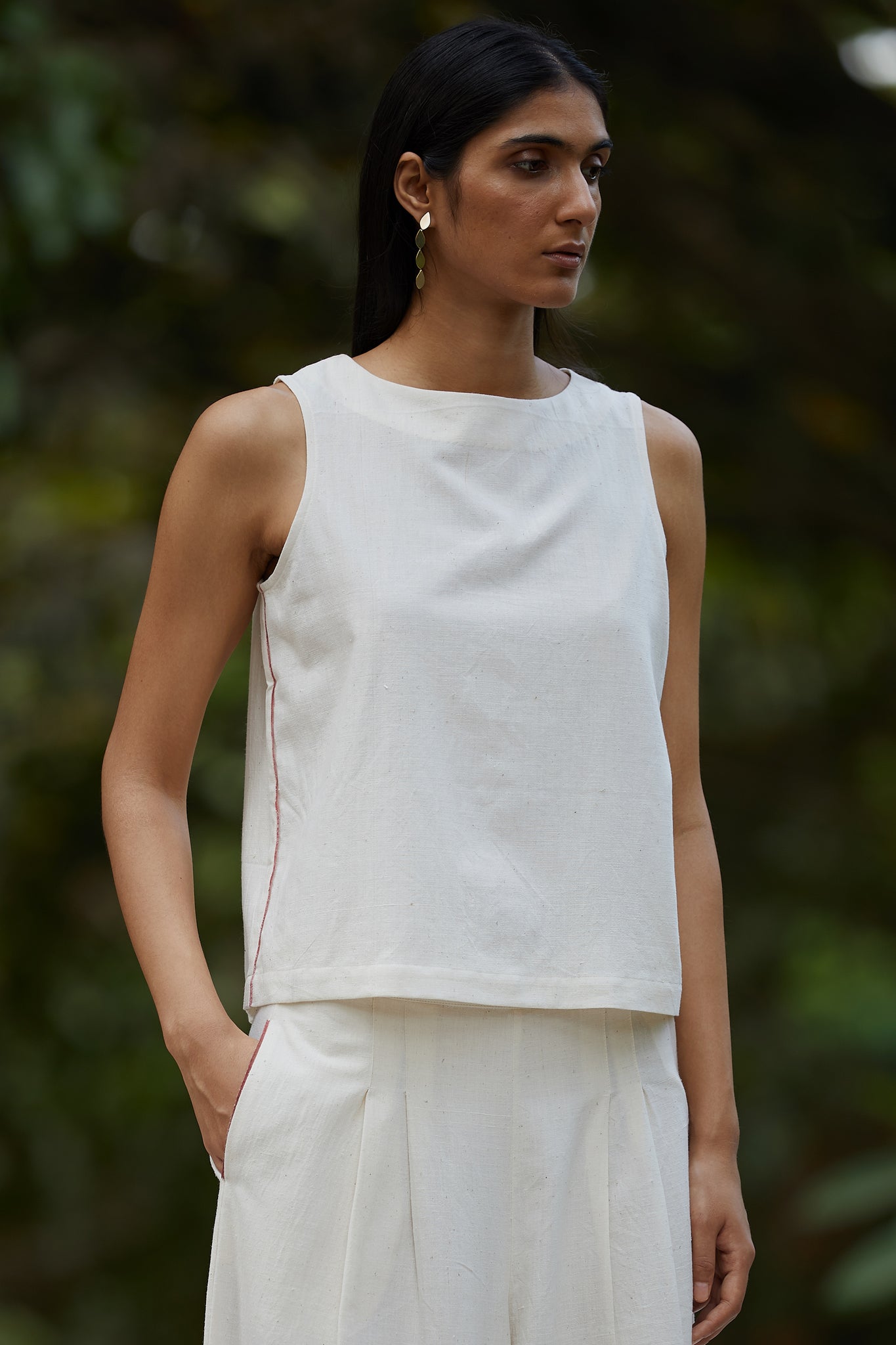 Earthy, no-dye khadi fabric. Sleeveless boxy top. In-cut sleeveless for sun-kissed shoulders. Chic selvedge detail on side. Easy to layer. Shop matching pants here.