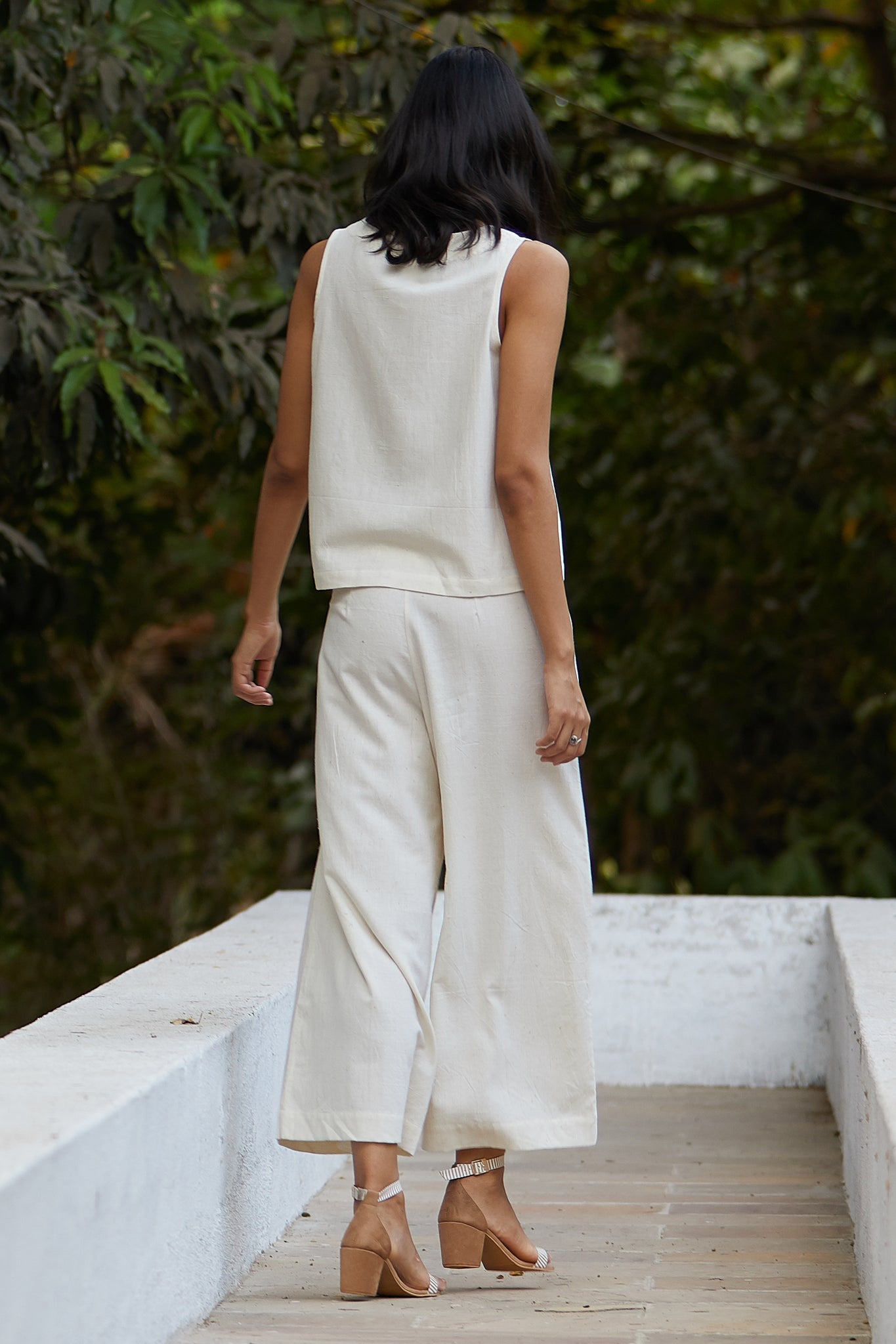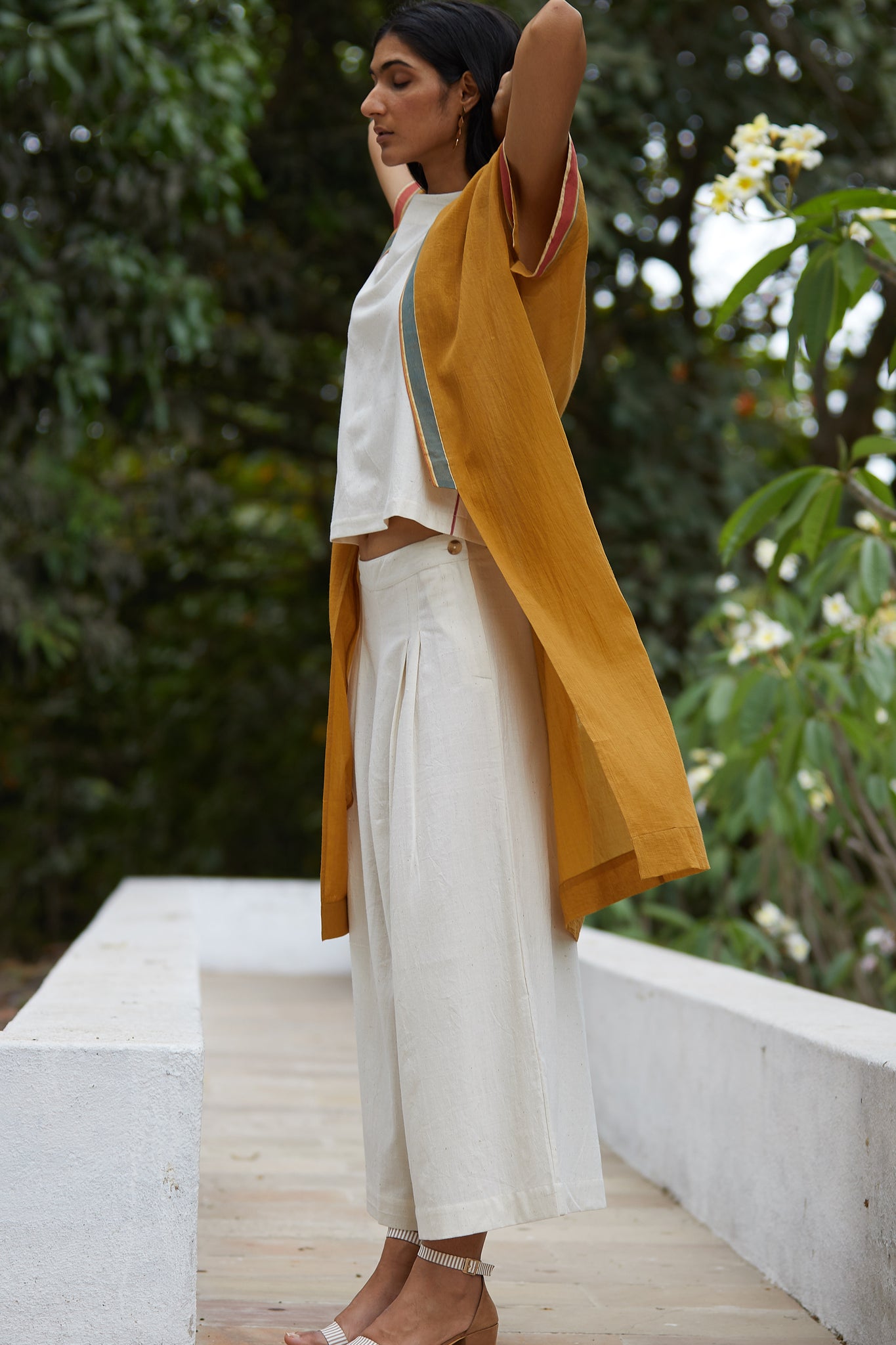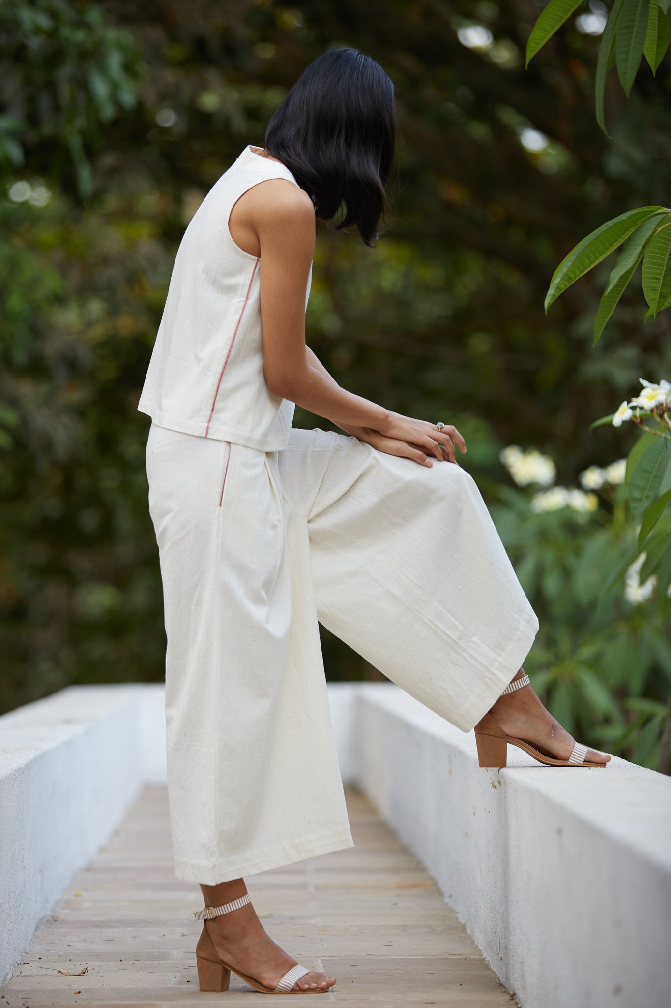 Earthy, no-dye khadi fabric. Mid waist wide leg pants. Twin pleats in the front. In-seam pockets with red selvedge detail. Fitted waistband with single button and zip on the side. Matching top available here.