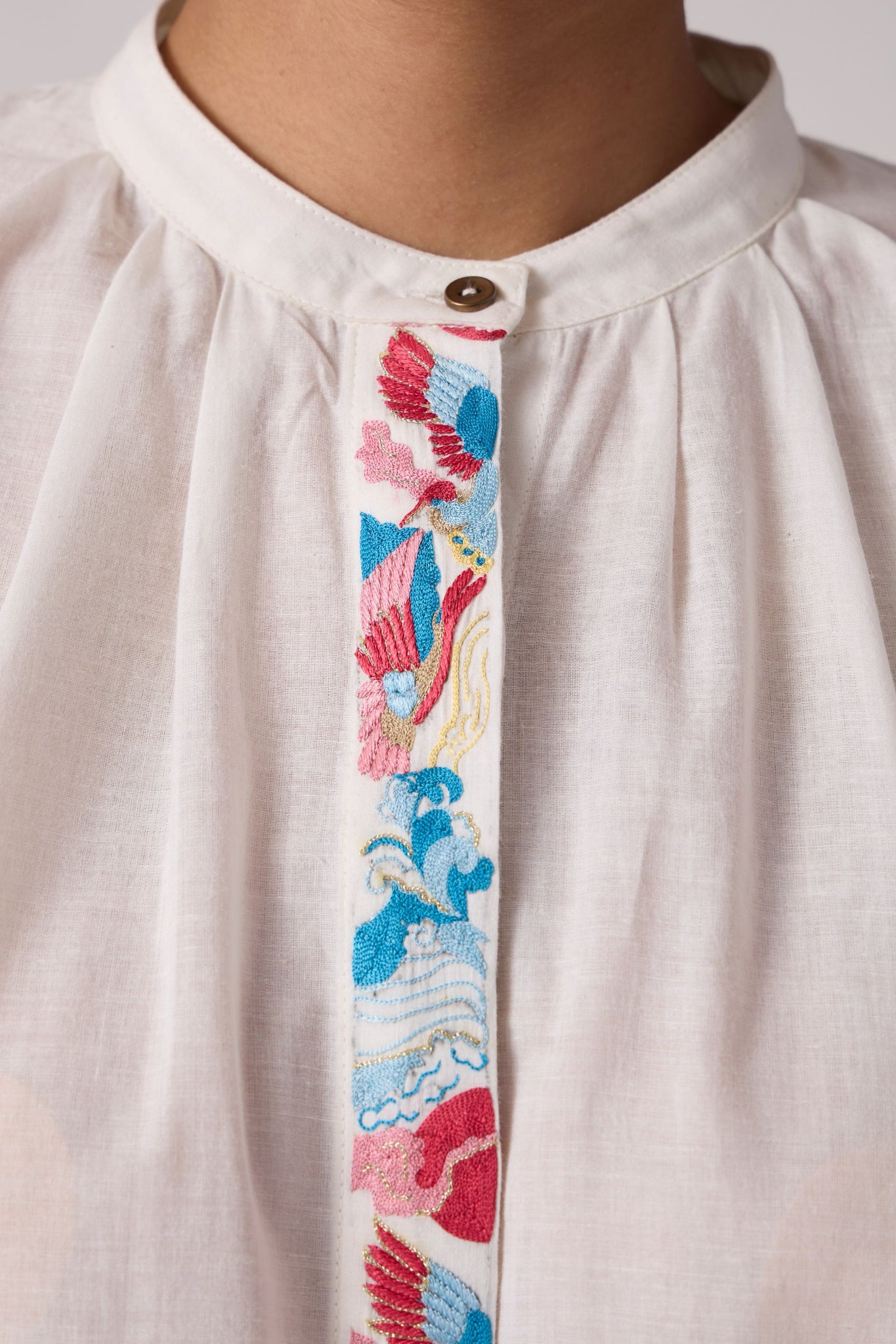 Flared top with a slim band collar. Concealed button placket with a single button revealed at top. Gentle gathers into the front neck. Three quarter length sleeves featuring a wide cuff with three button fastening. Crafted from khadi.