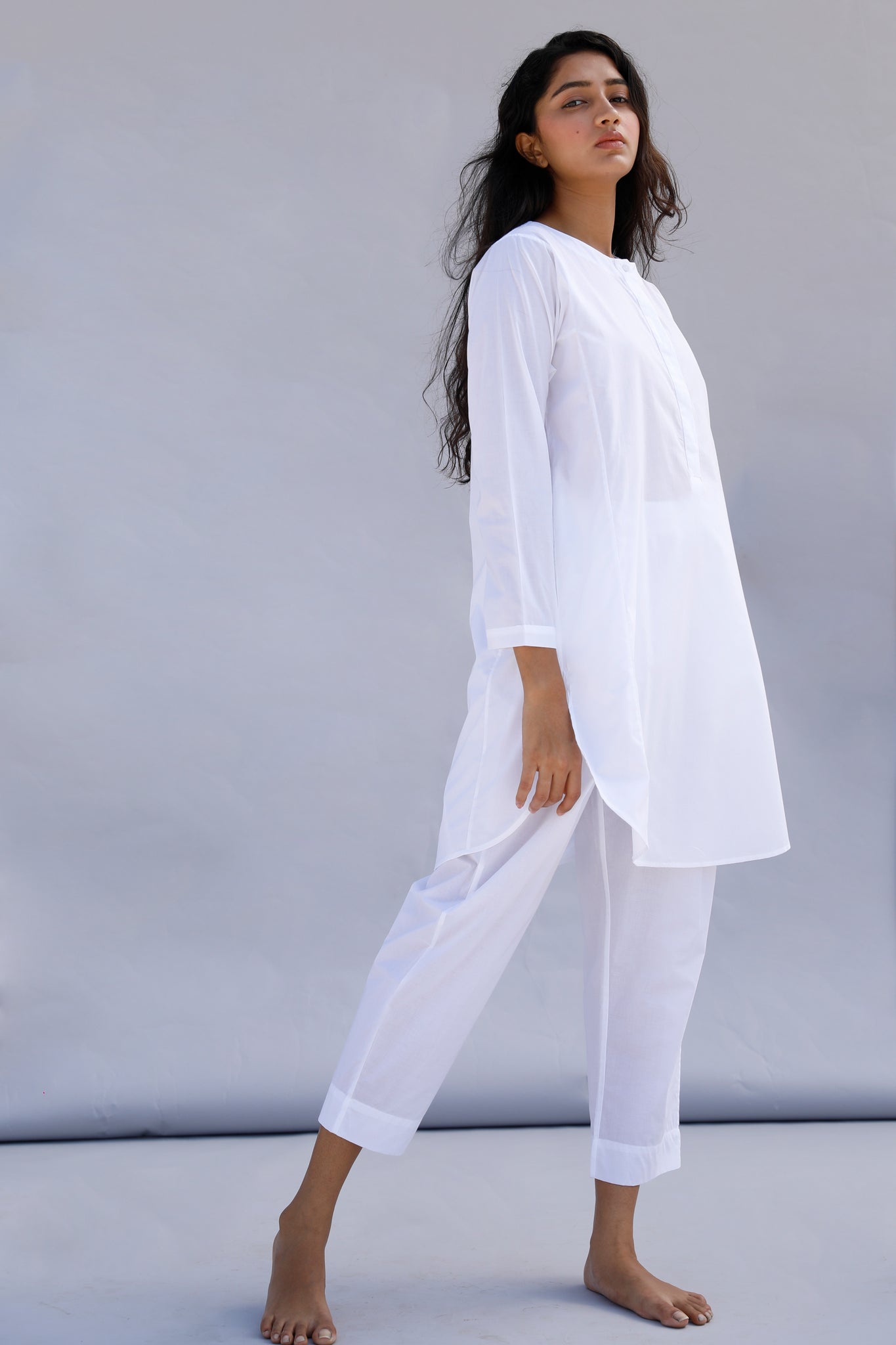 Tunic set in supple cambric. Drop shoulder. Full length sleeves. Close round neck with partial concealed placket. Curved hem with side slits. In seam pockets. Unlined.