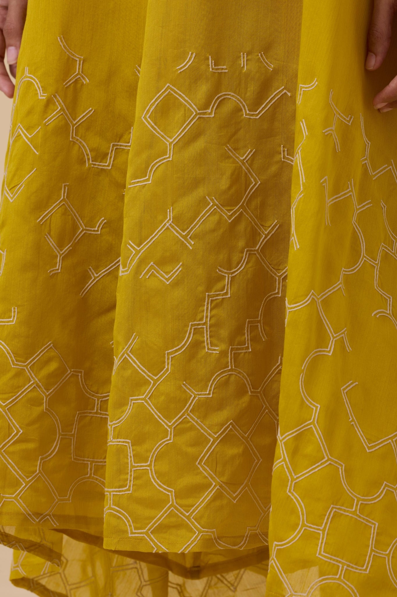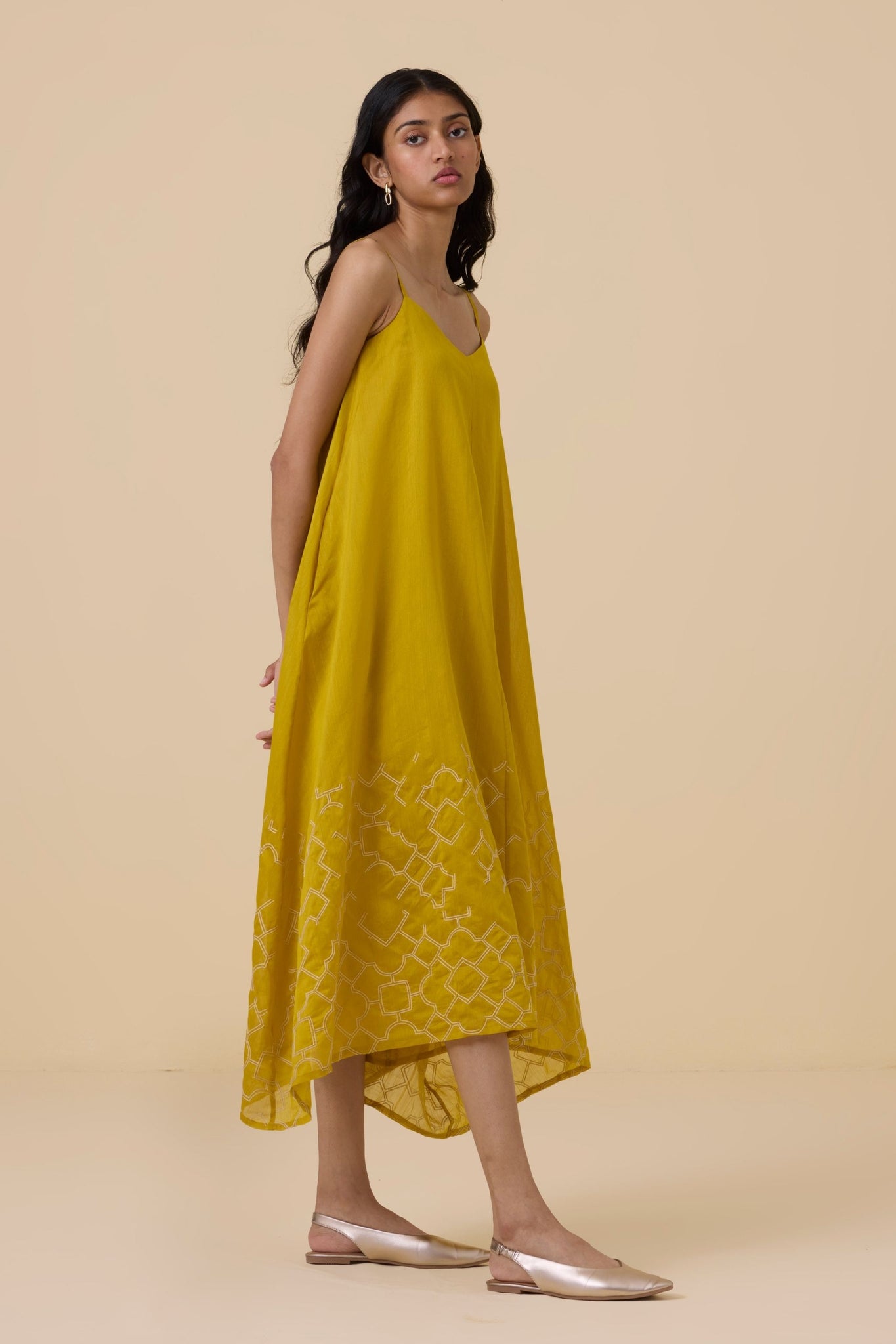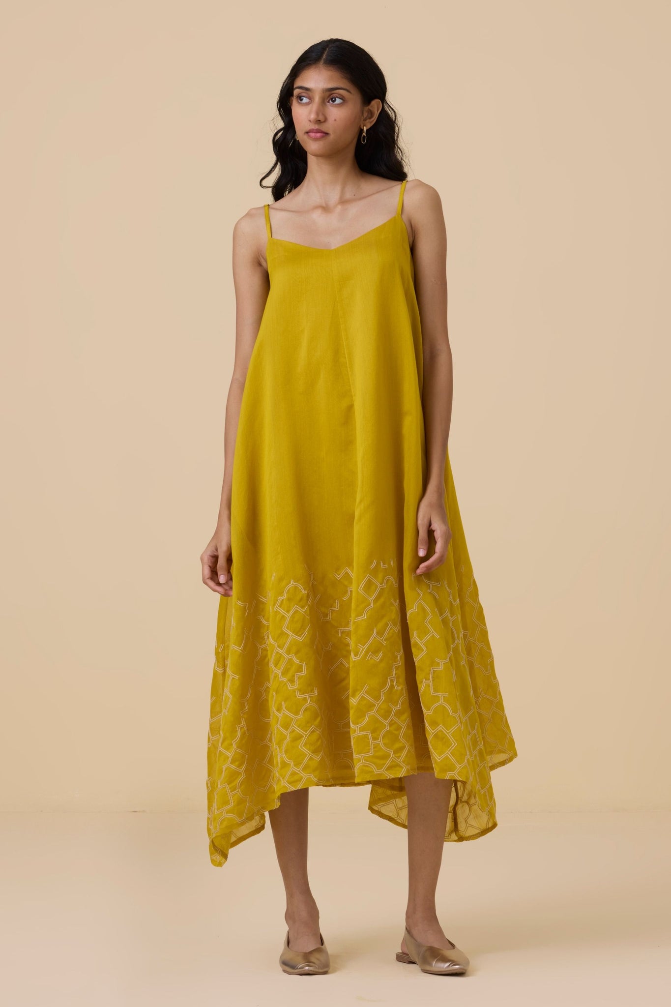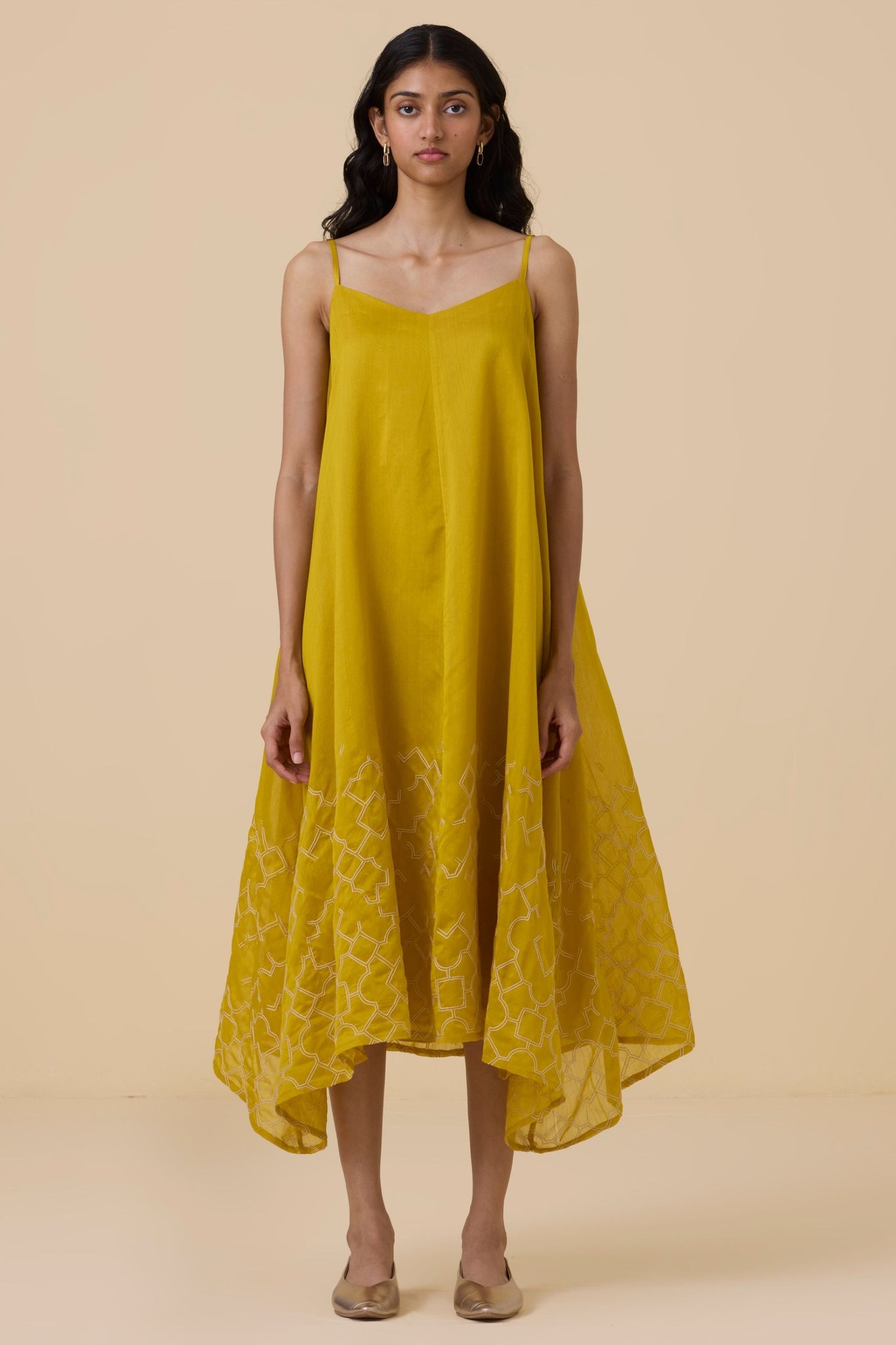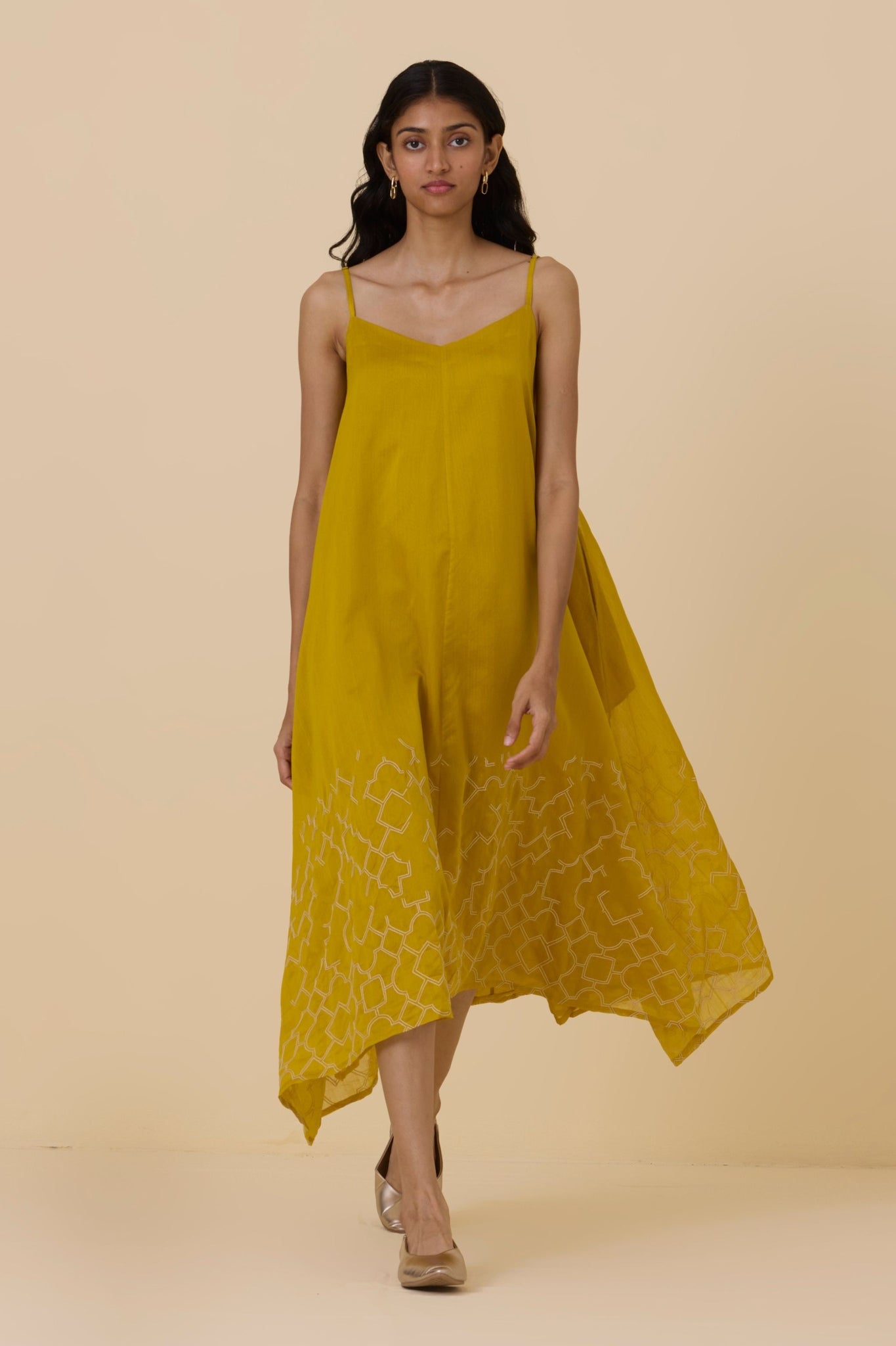 Hand embroidered maxi dress with handkerchief hem. Crafted from chanderi. Adjustable straps. In-seam pockets. This dress is fully lined.