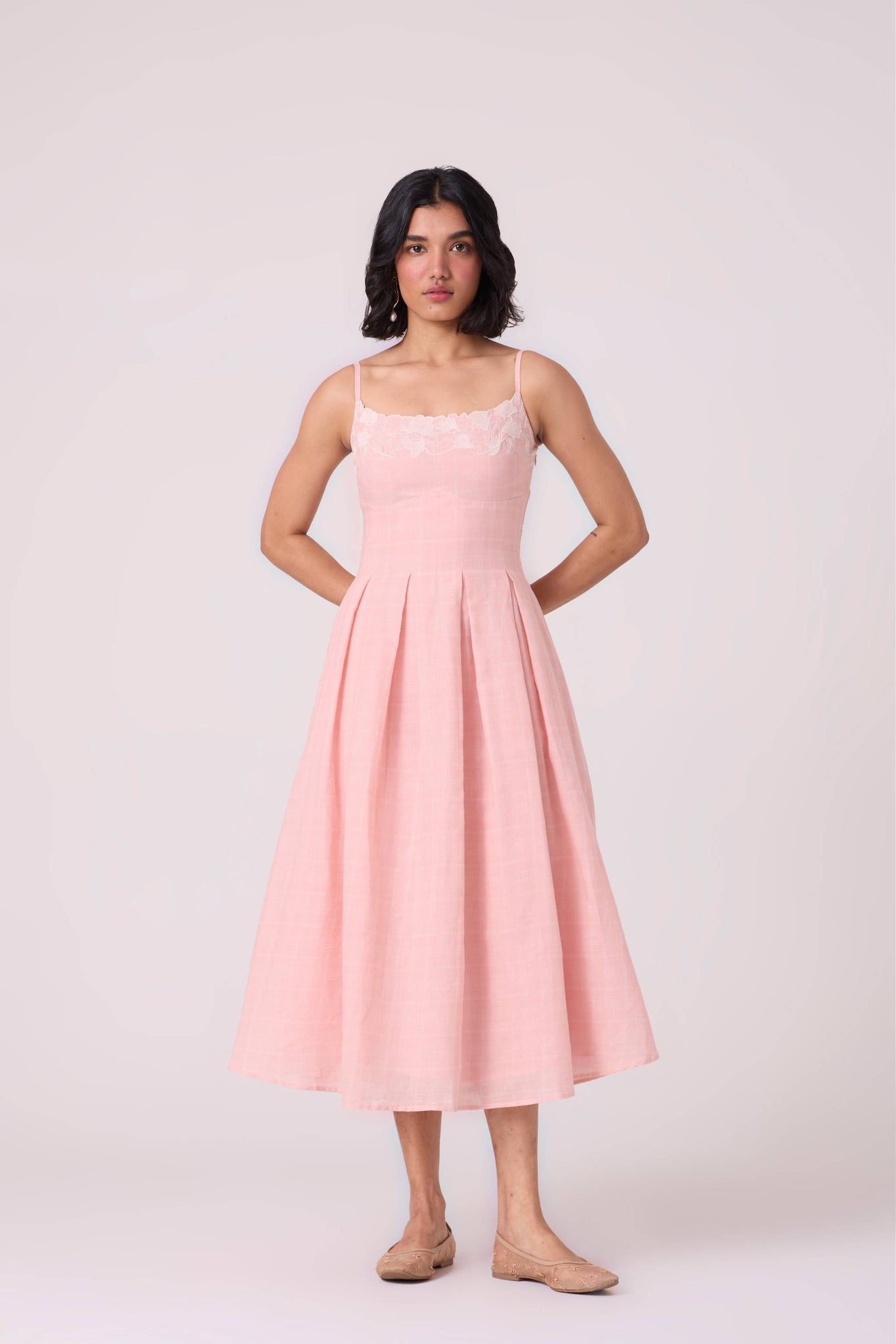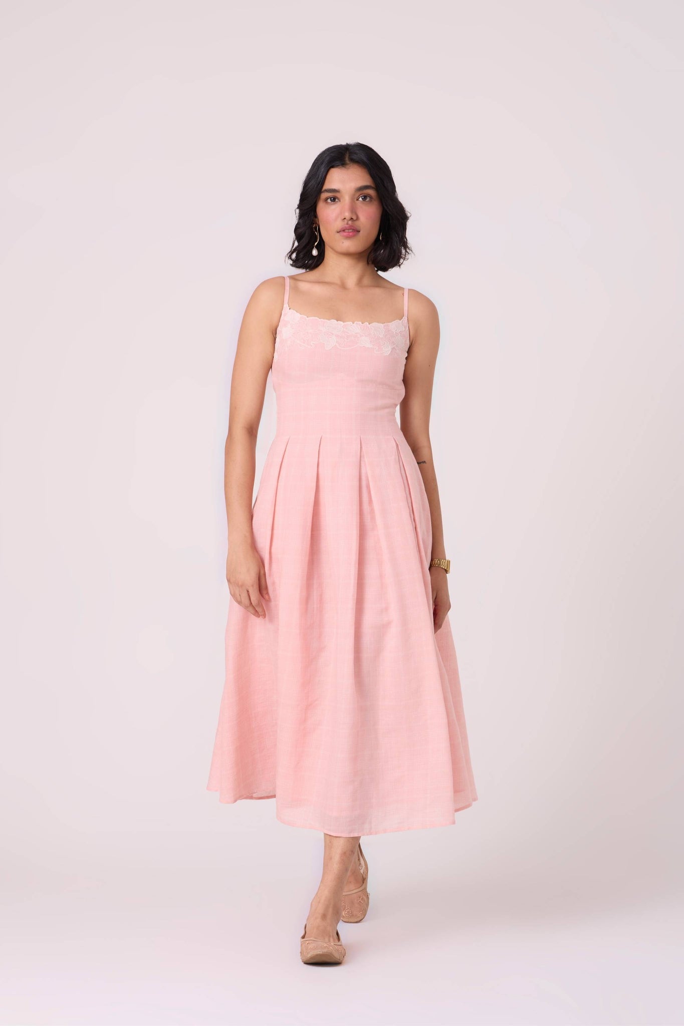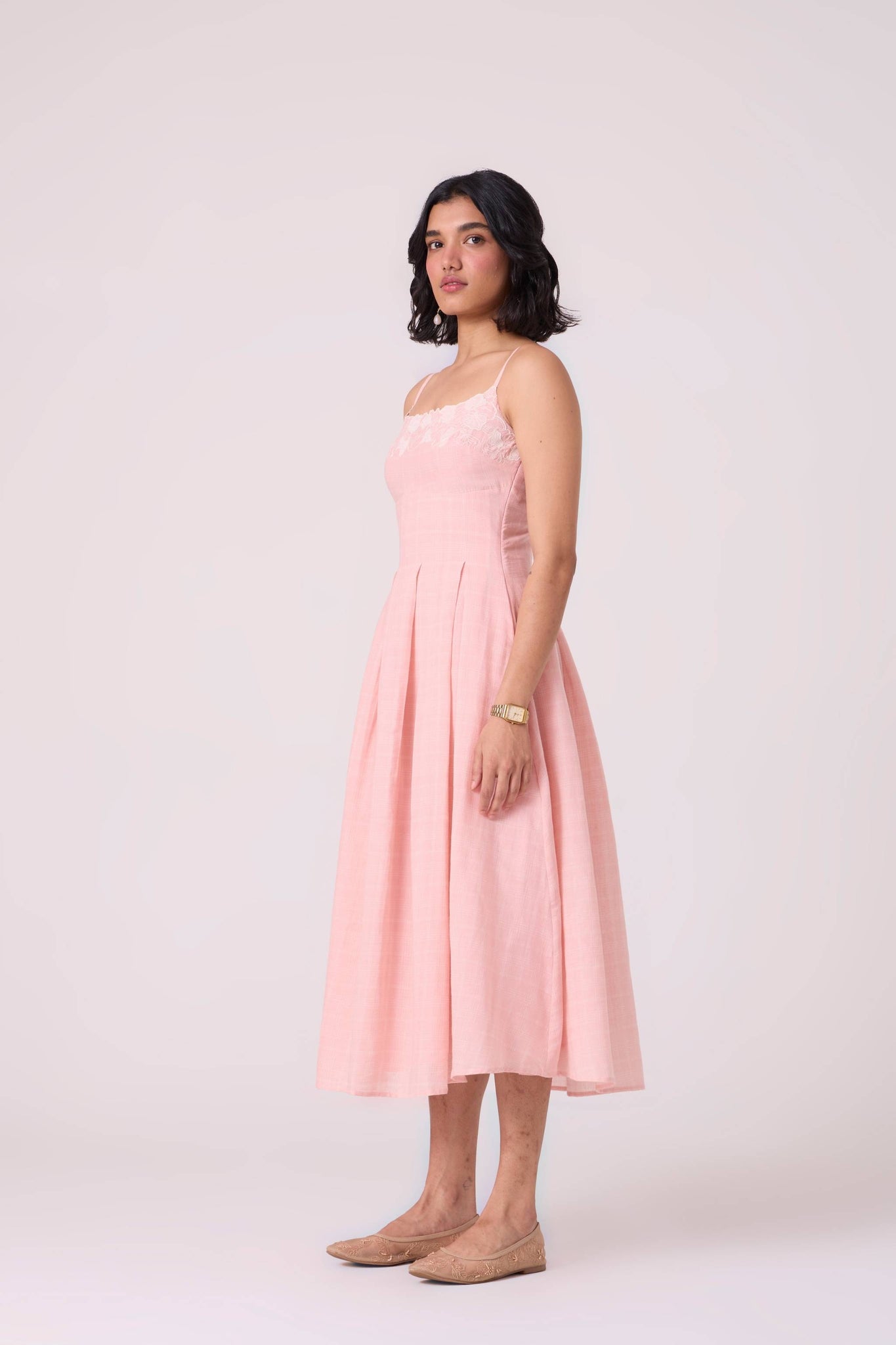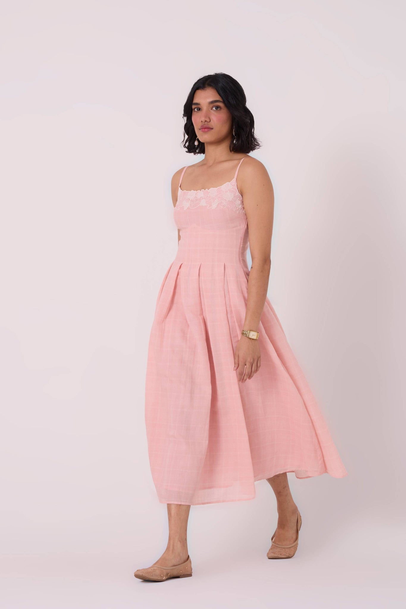 A midi dress crafted from handwoven cotton checks with a wide neckline featuring hand embroidery and cutwork. Adjustable straps and a side zipper fastening add versatility, while inseam pockets and full lining ensure both style and comfort.
