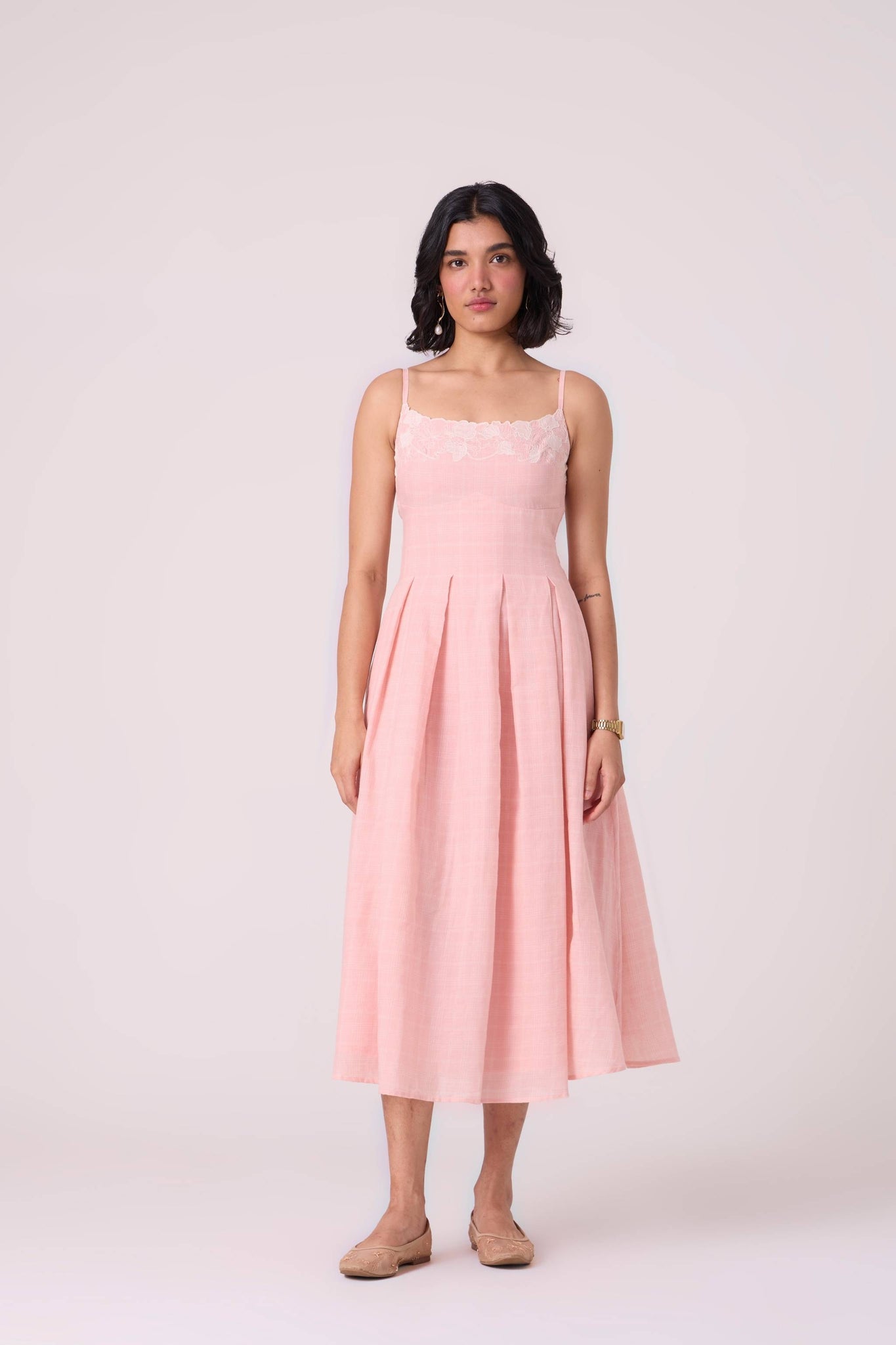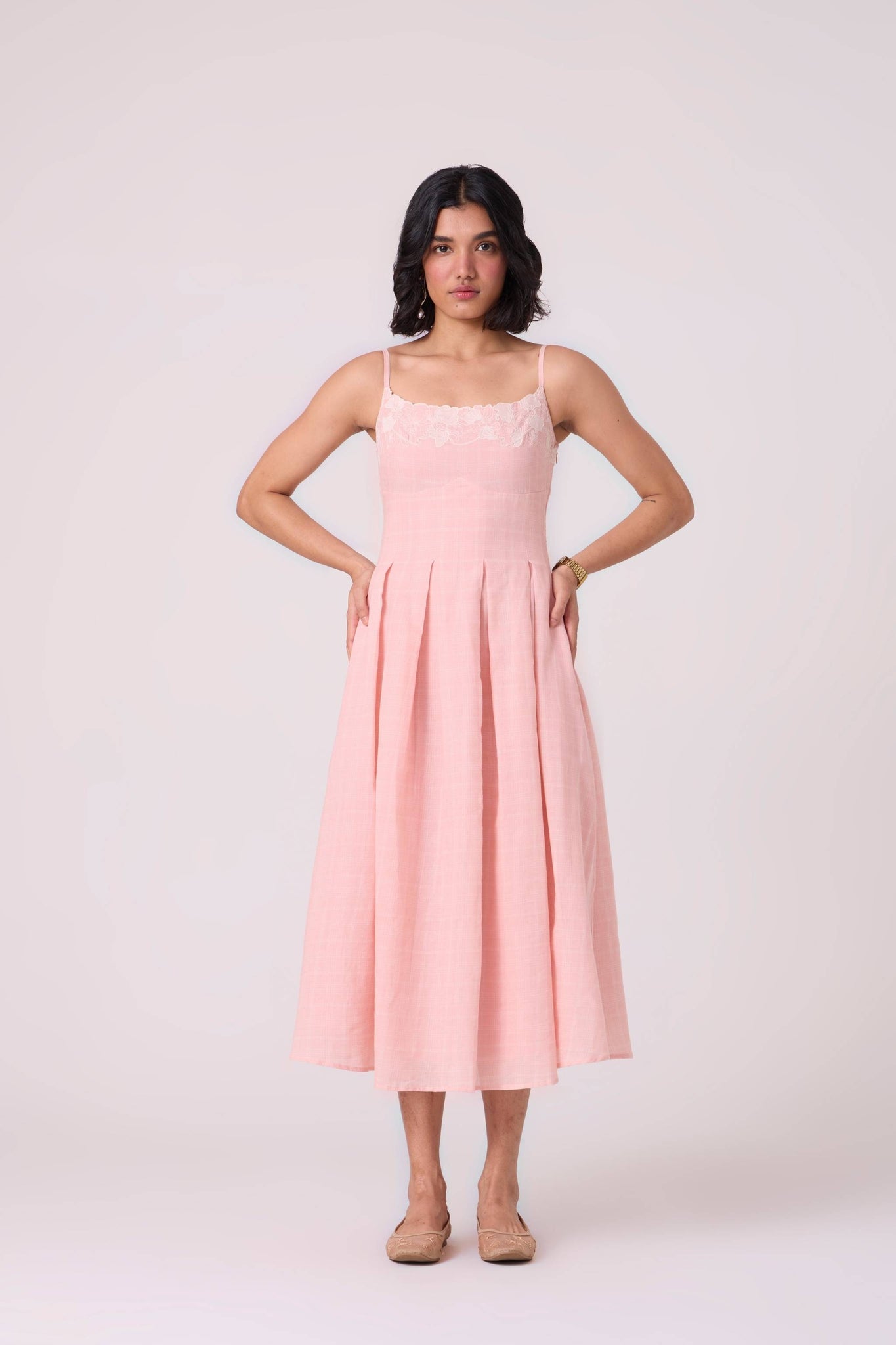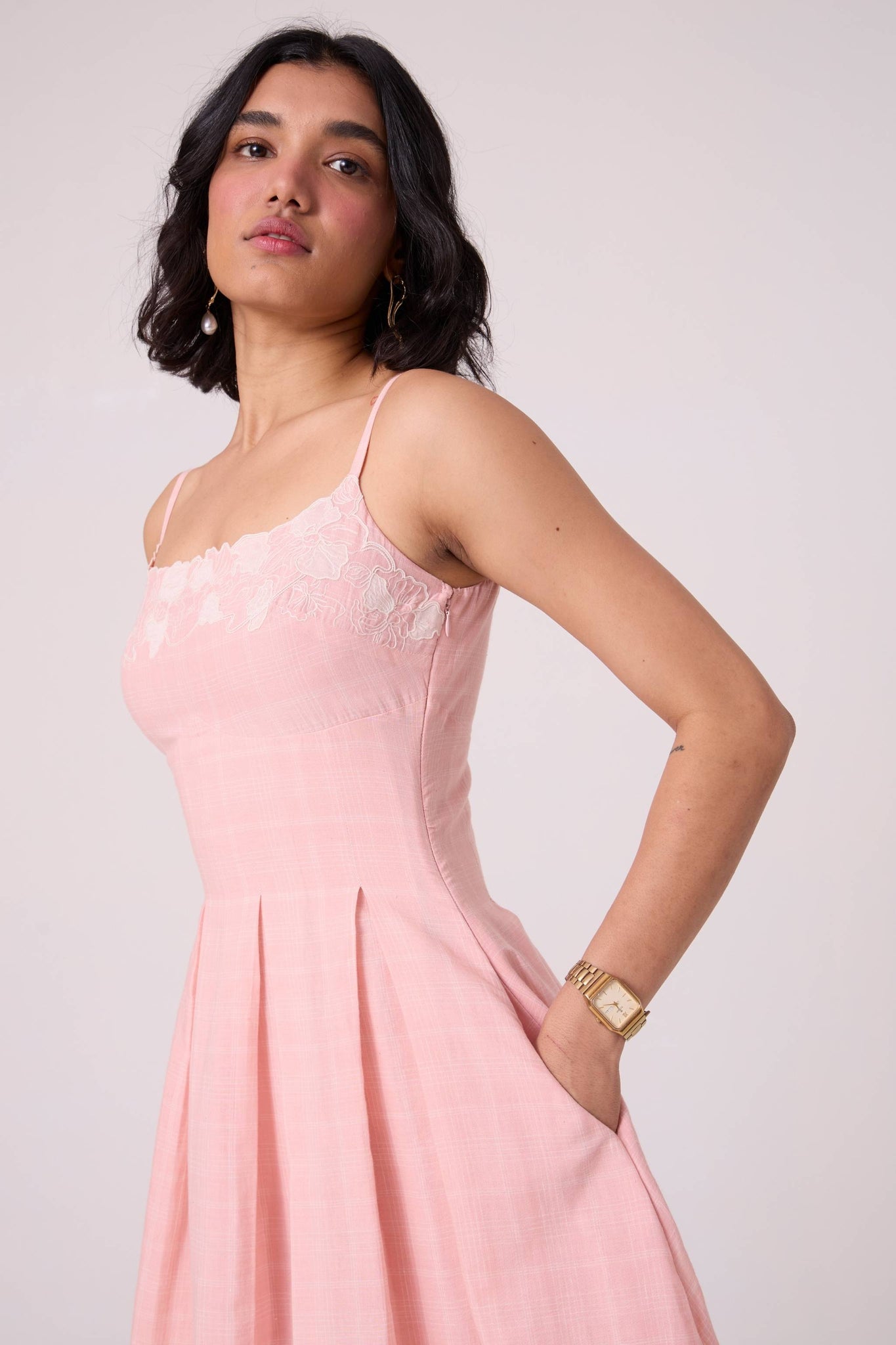 A midi dress crafted from handwoven cotton checks with a wide neckline featuring hand embroidery and cutwork. Adjustable straps and a side zipper fastening add versatility, while inseam pockets and full lining ensure both style and comfort.