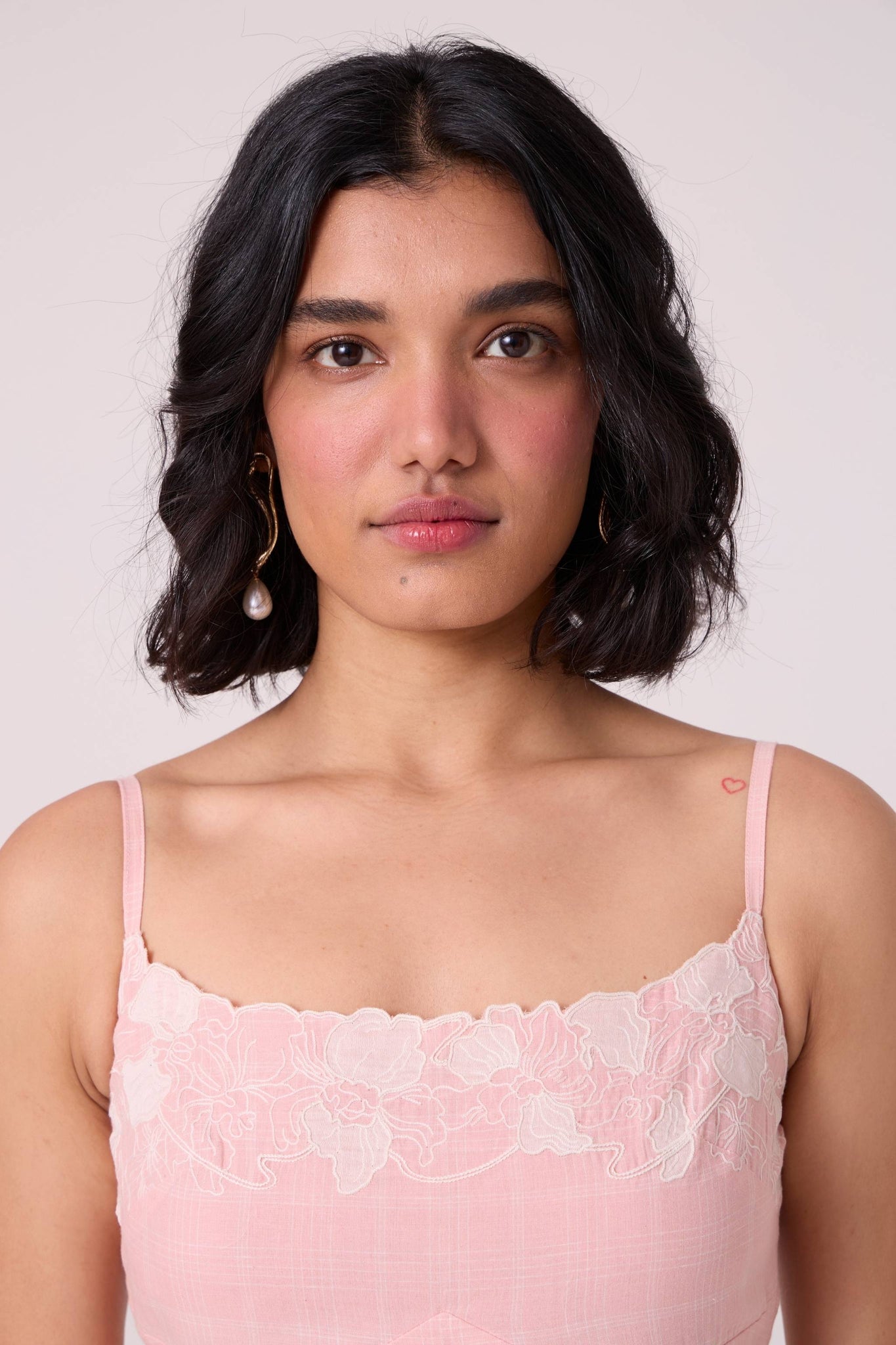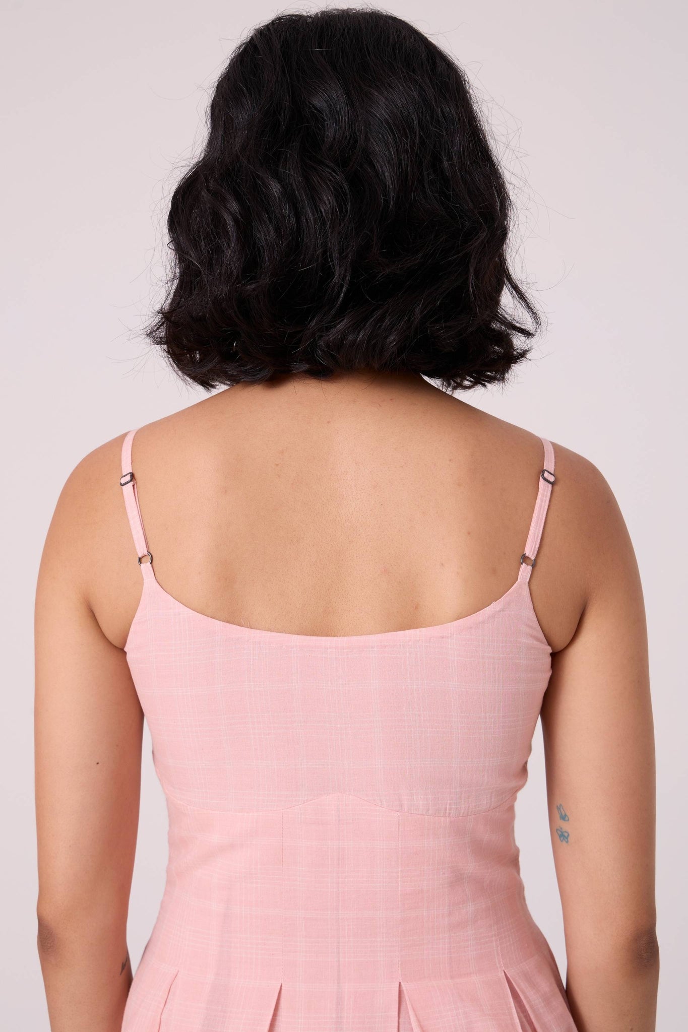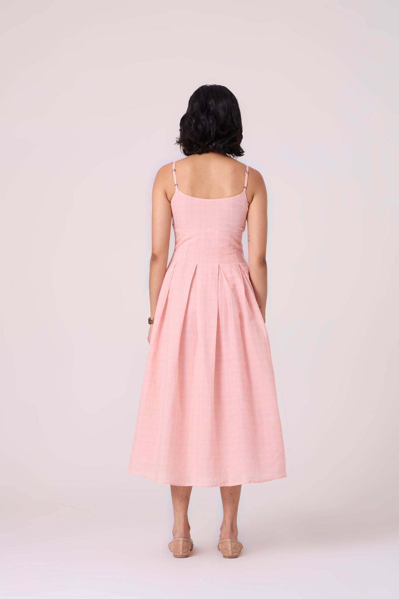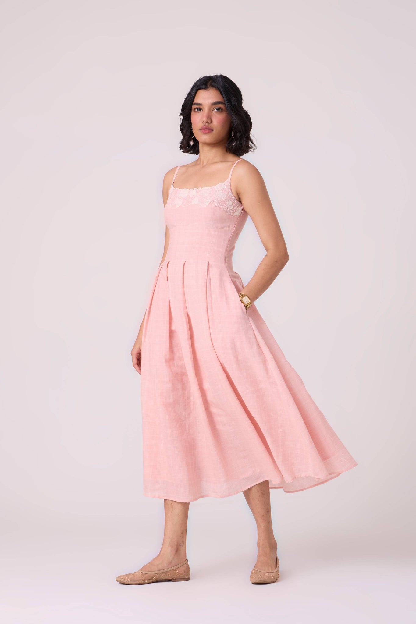 A midi dress crafted from handwoven cotton checks with a wide neckline featuring hand embroidery and cutwork. Adjustable straps and a side zipper fastening add versatility, while inseam pockets and full lining ensure both style and comfort.