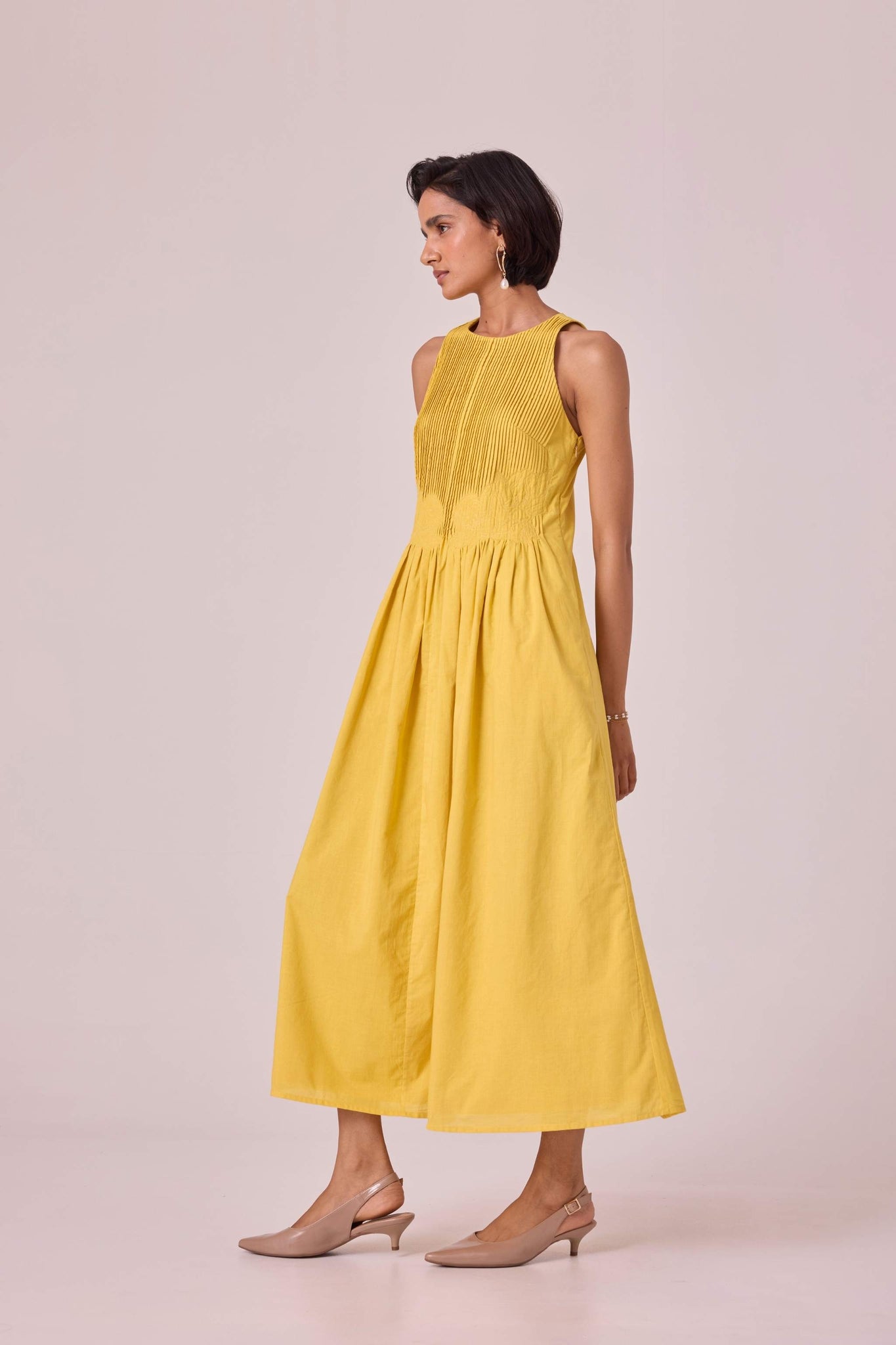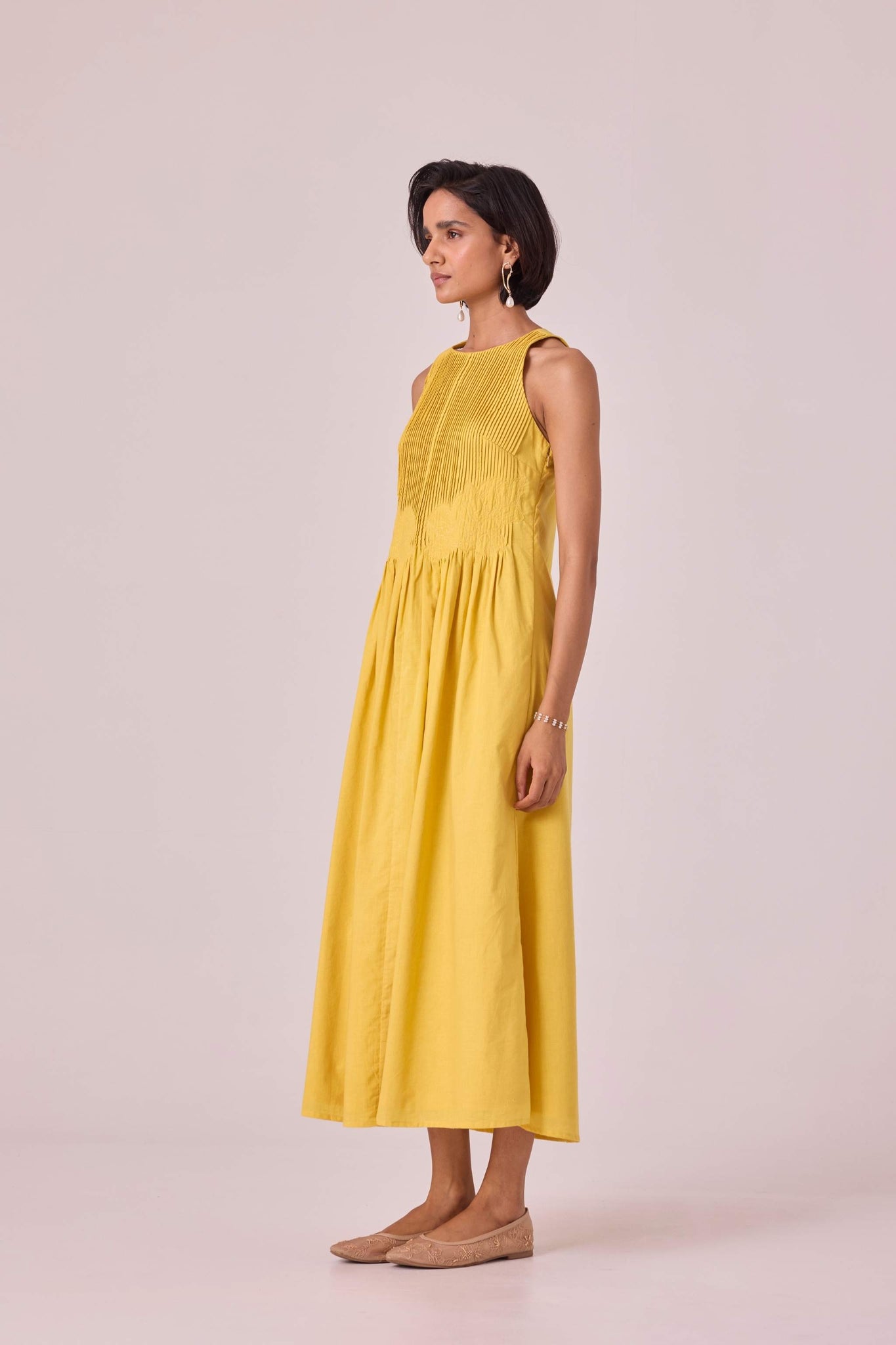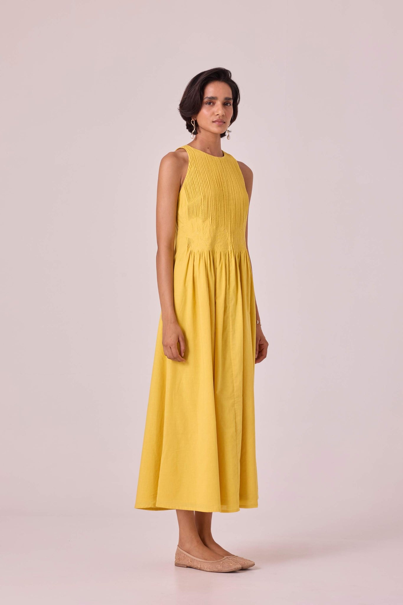 Gathered waist sleeveless dress with fine pintuck bodice. Waist gathers for gentle movement. Single rouleau button at the back.  Side zip for ease.