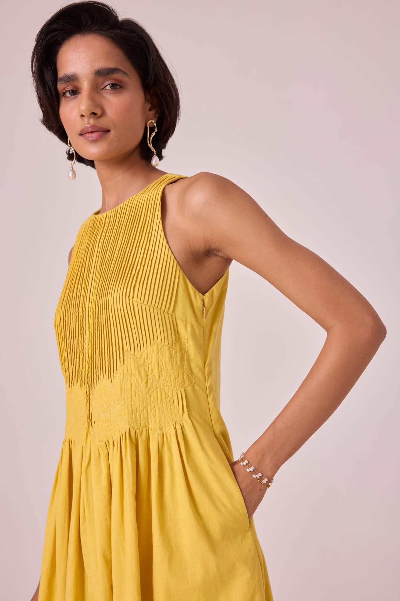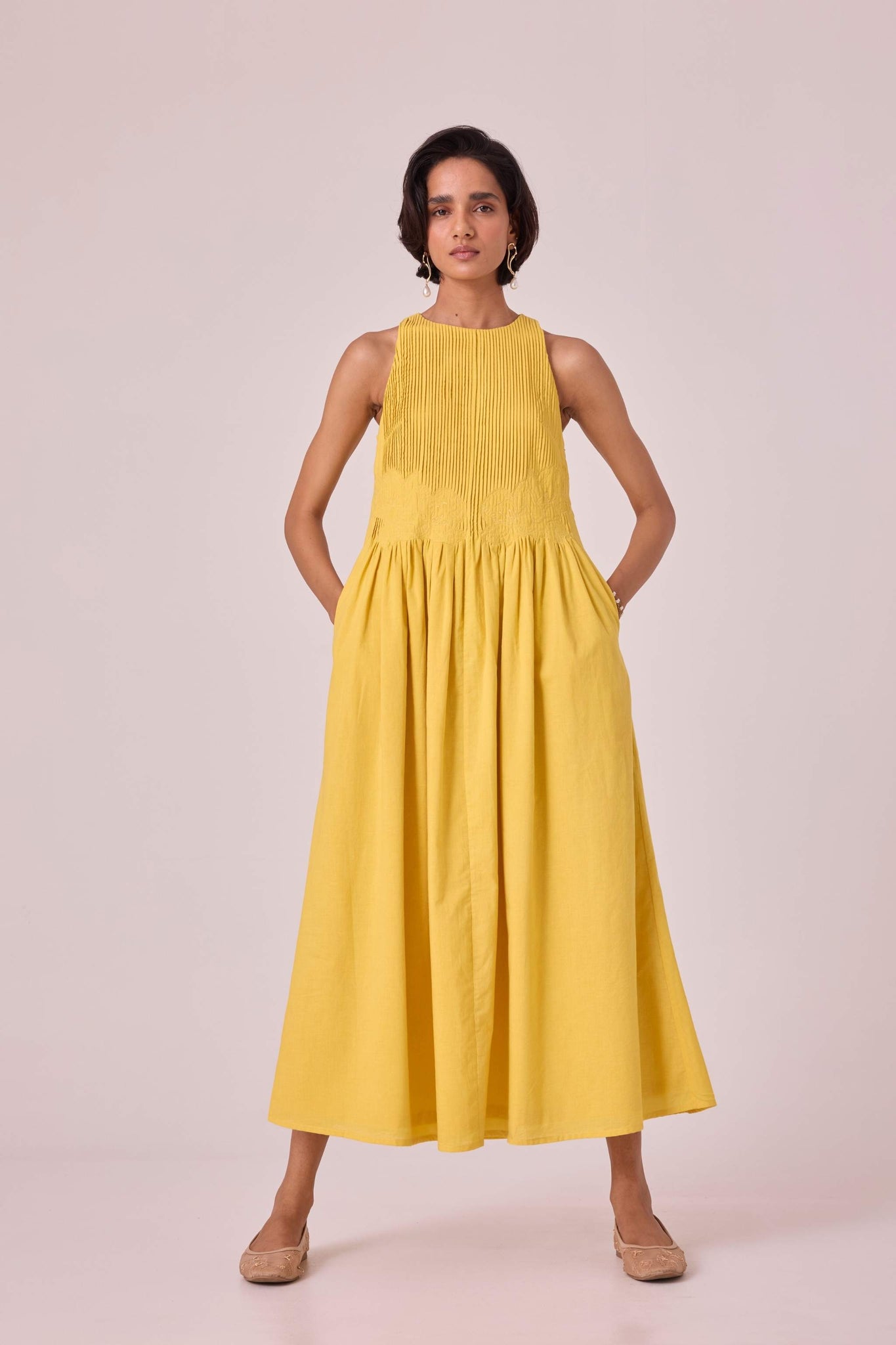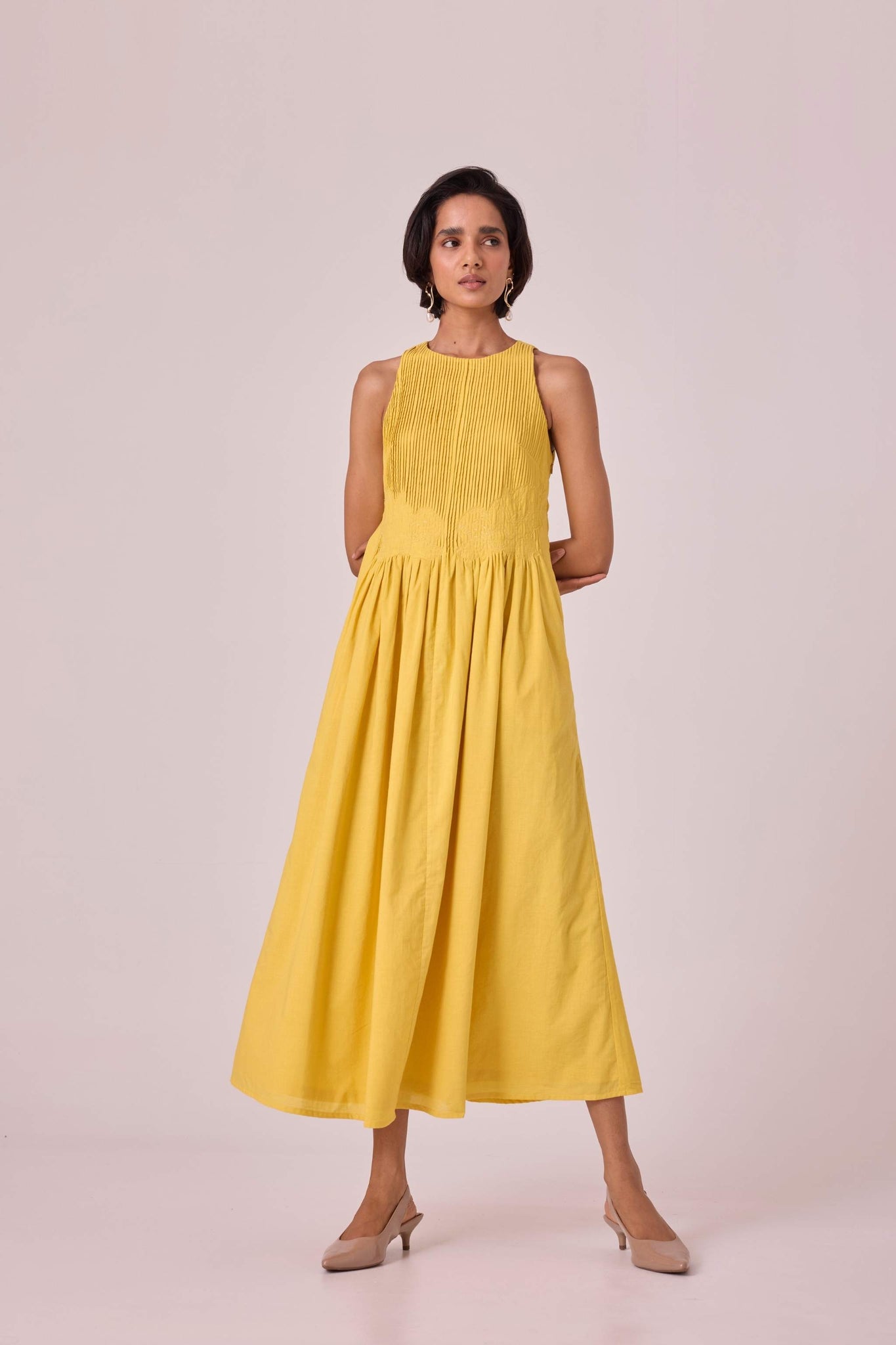 Gathered waist sleeveless dress with fine pintuck bodice. Waist gathers for gentle movement. Single rouleau button at the back.  Side zip for ease.