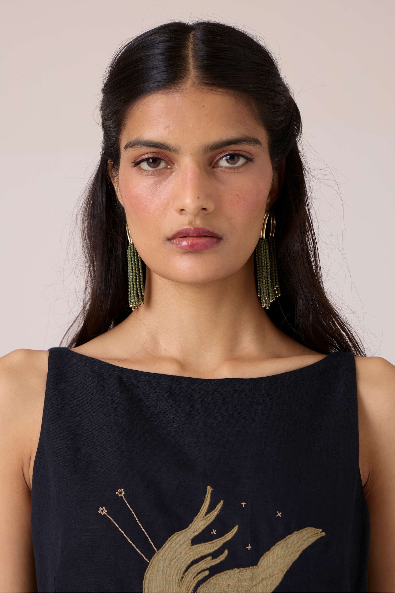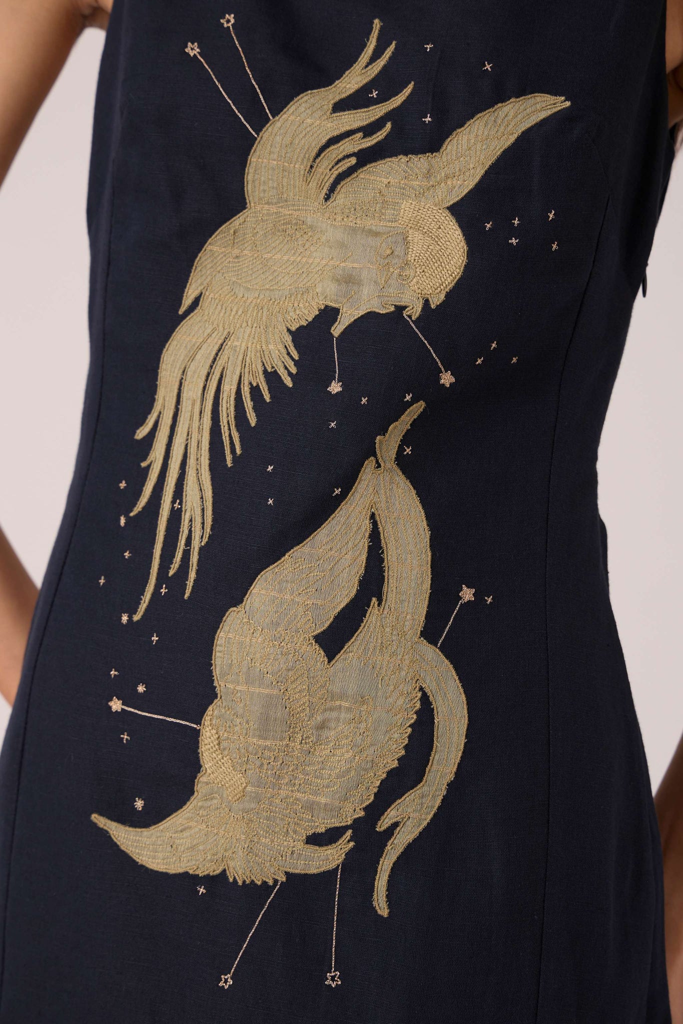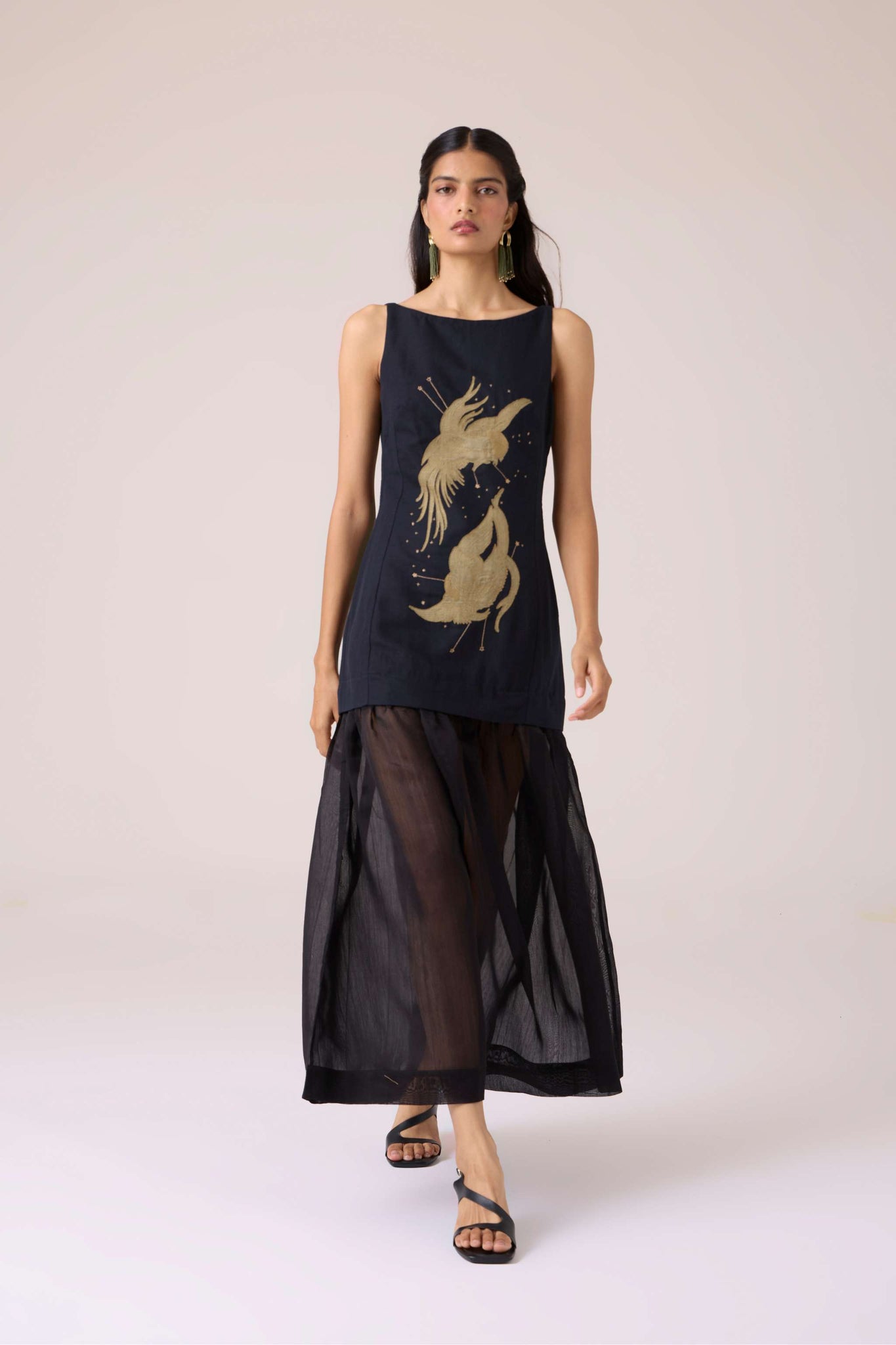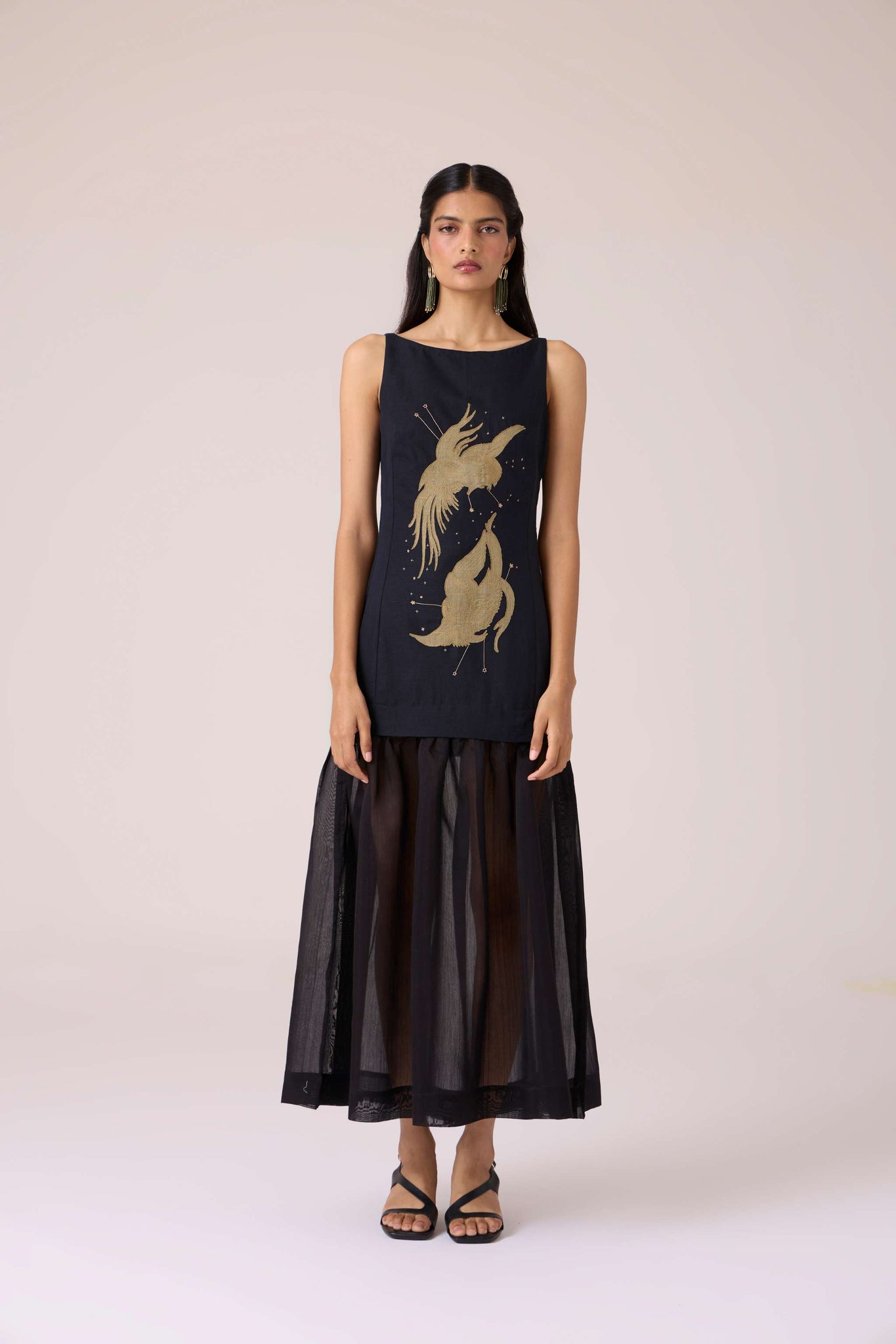 An interplay of opacity and light. A fitted embroidered bodice flows into a sheer pleated layer, creating dimension with every step.