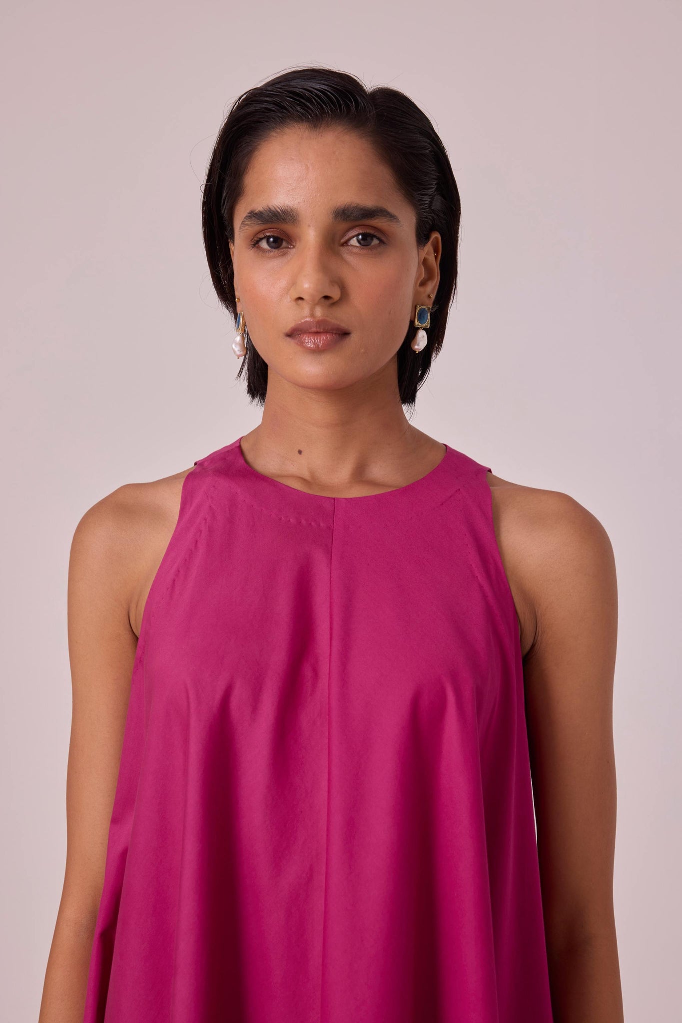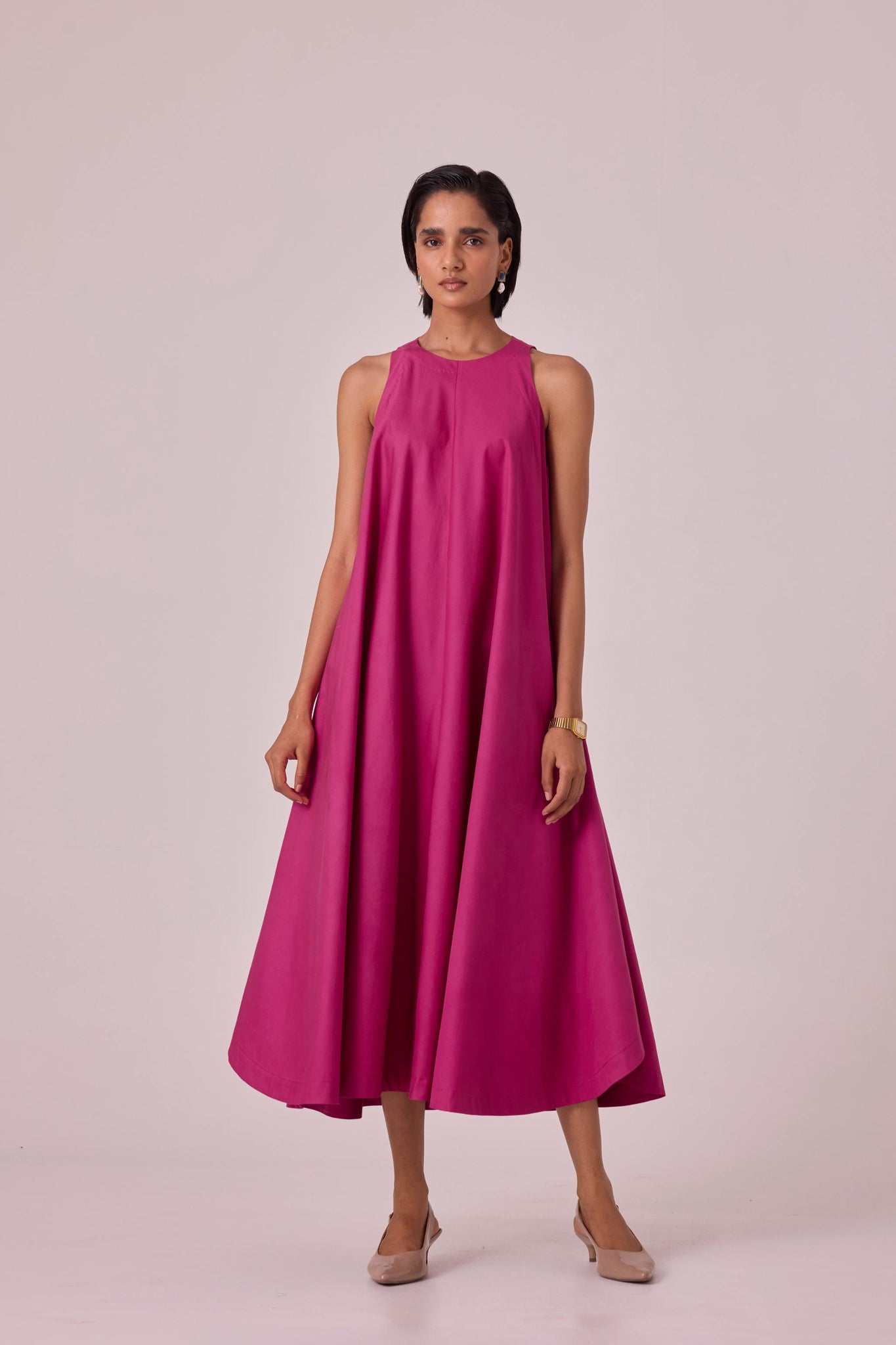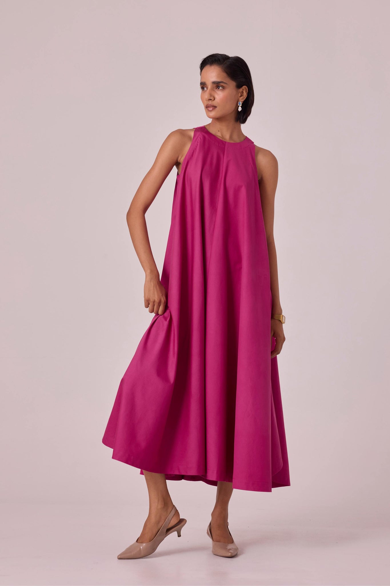 Midi dress with bounteous flare featuring a slight high low hem. Modern high neckline with cutaway shoulders. Pairs well with a belt too. Inseam pockets.