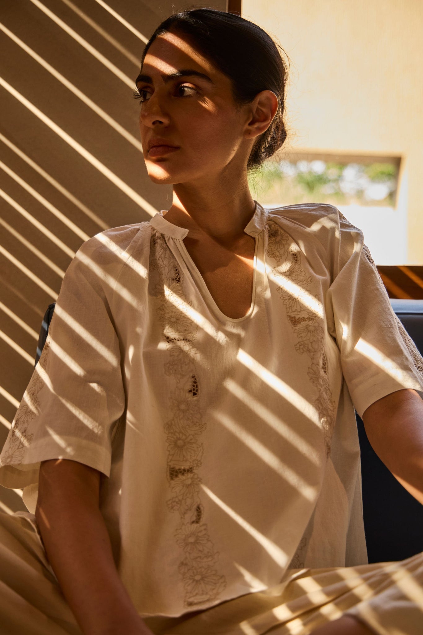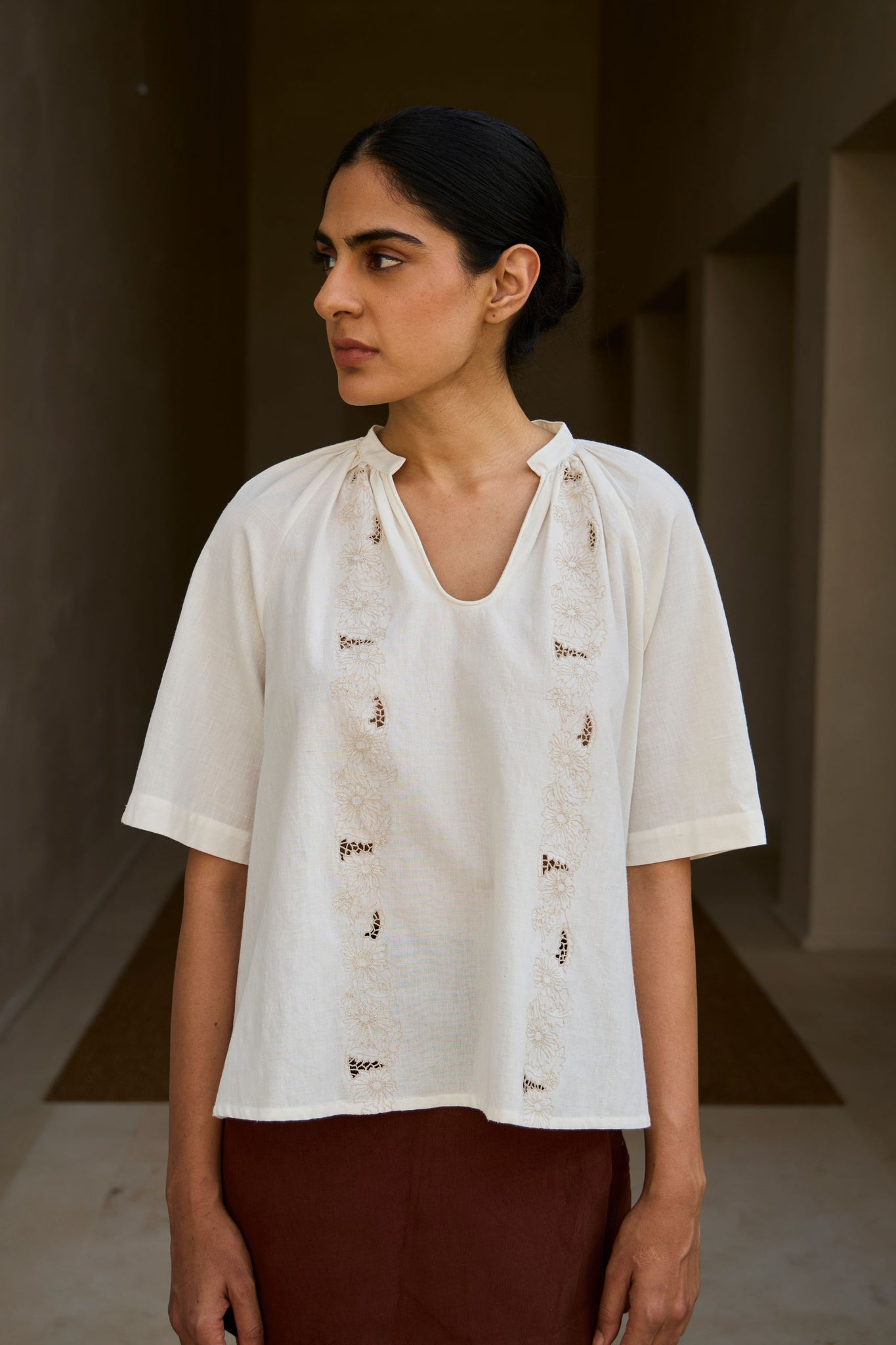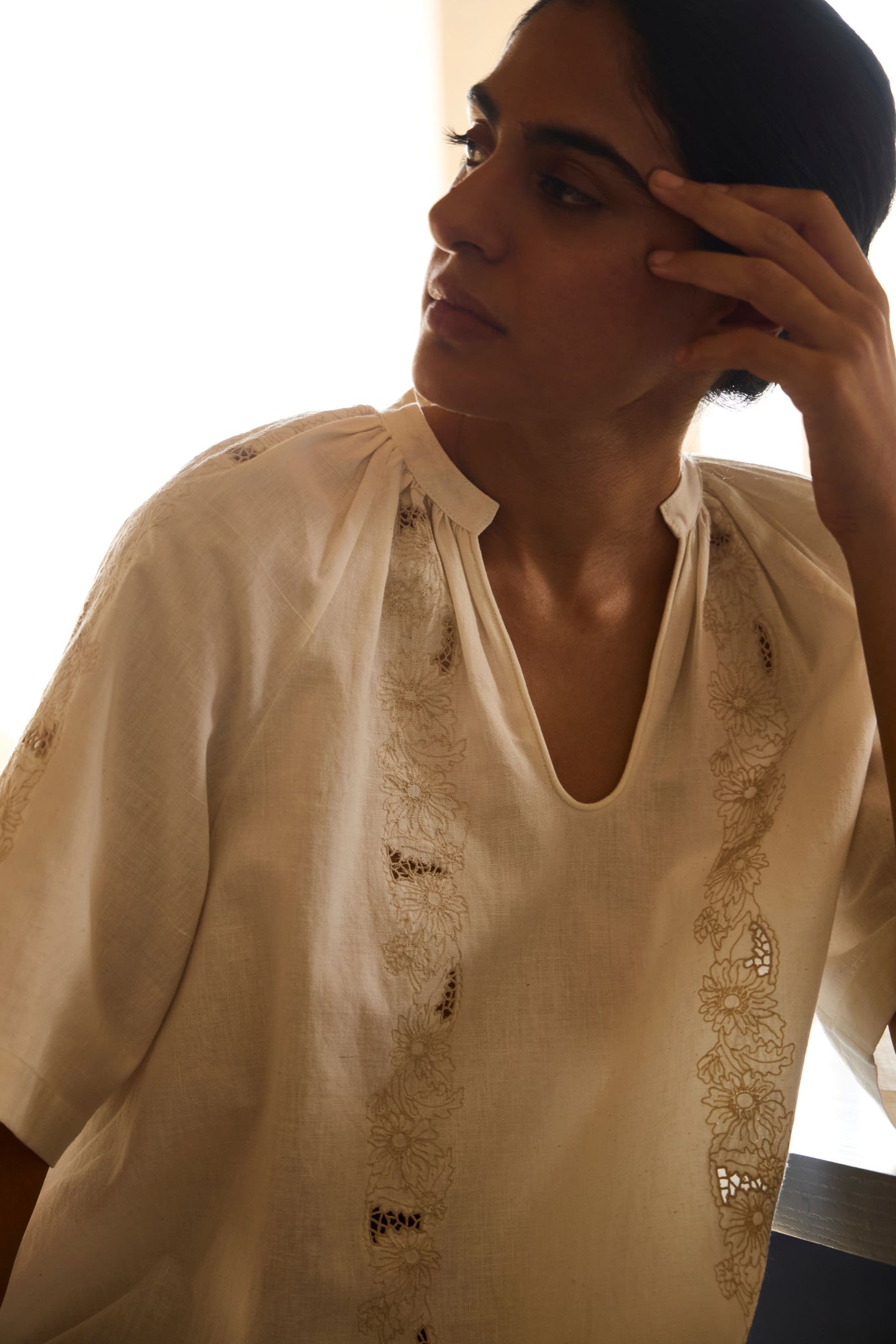 Breezy blouse in handspun and handwoven cotton. Soft gathers at the neckline and sleeves. Delicately embroidered panels crafted by artisans in our studio.
