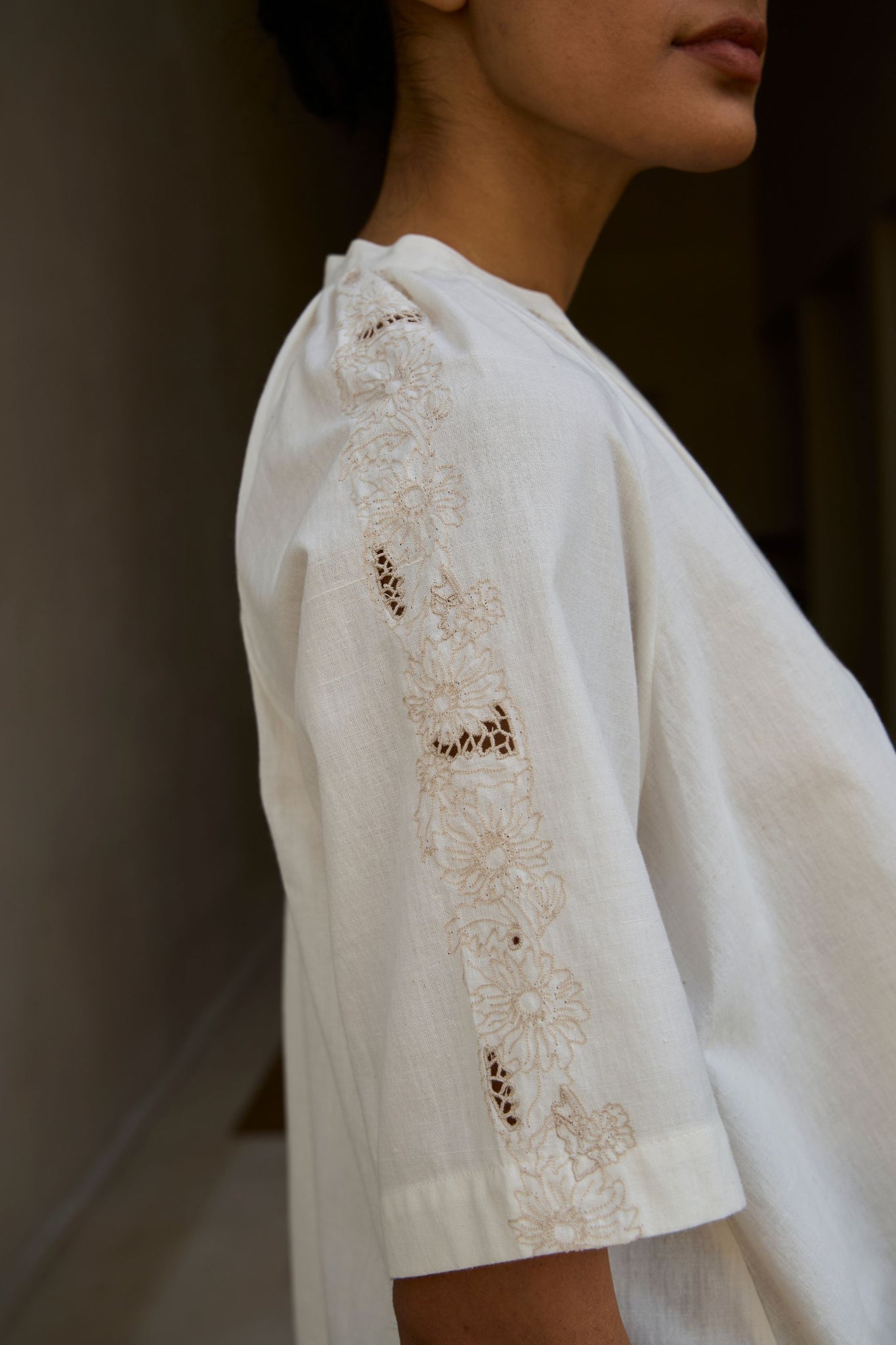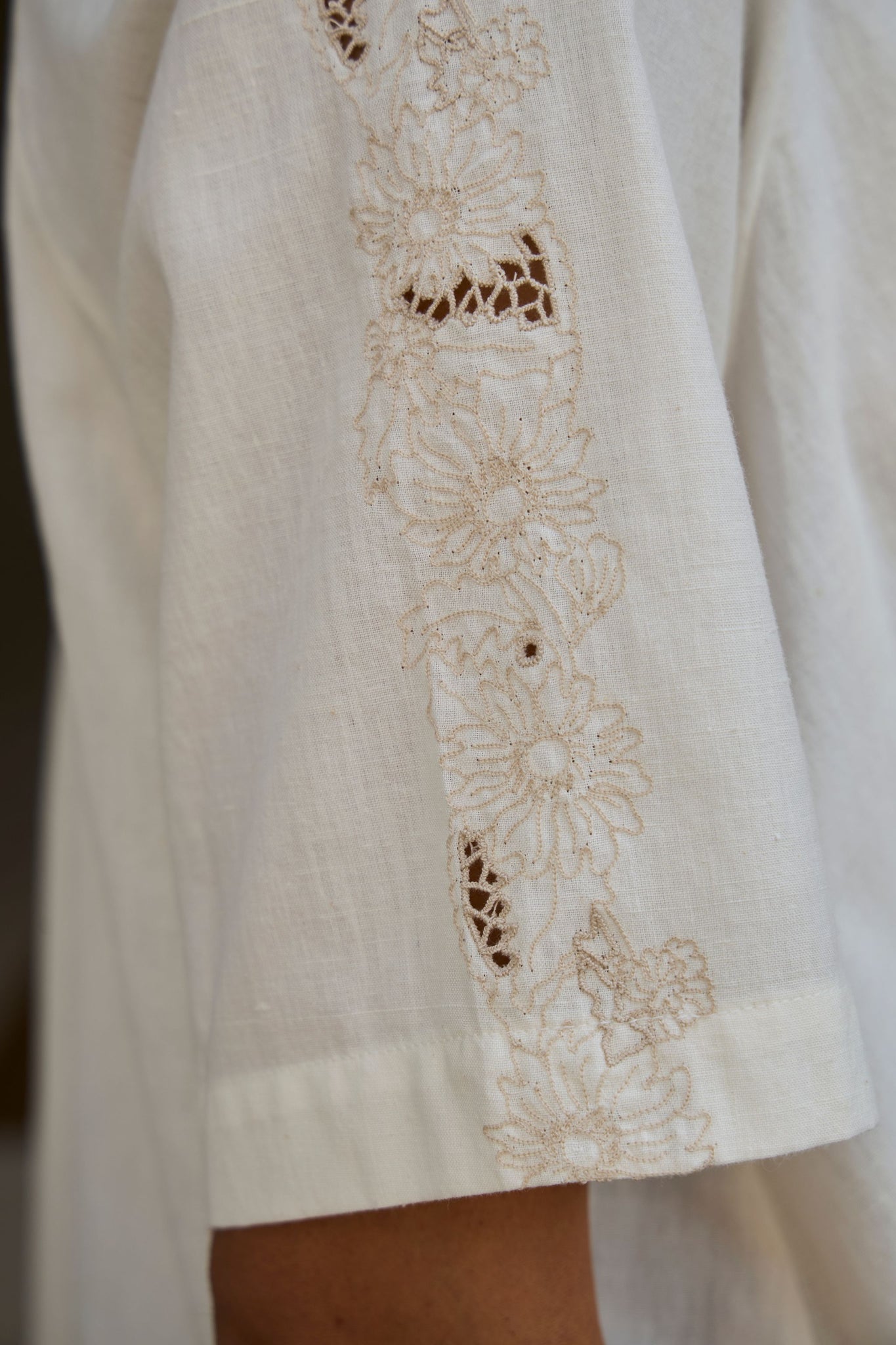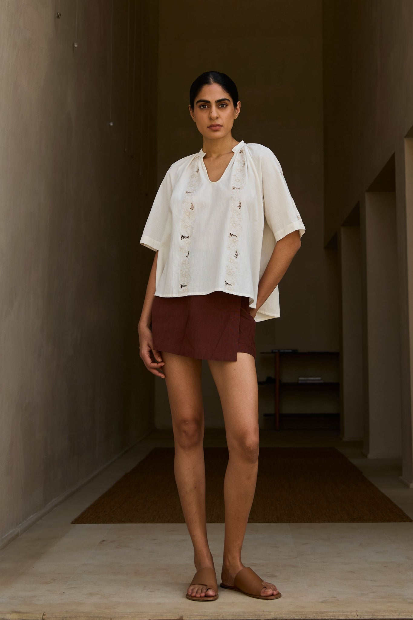 Breezy blouse in handspun and handwoven cotton. Soft gathers at the neckline and sleeves. Delicately embroidered panels crafted by artisans in our studio.