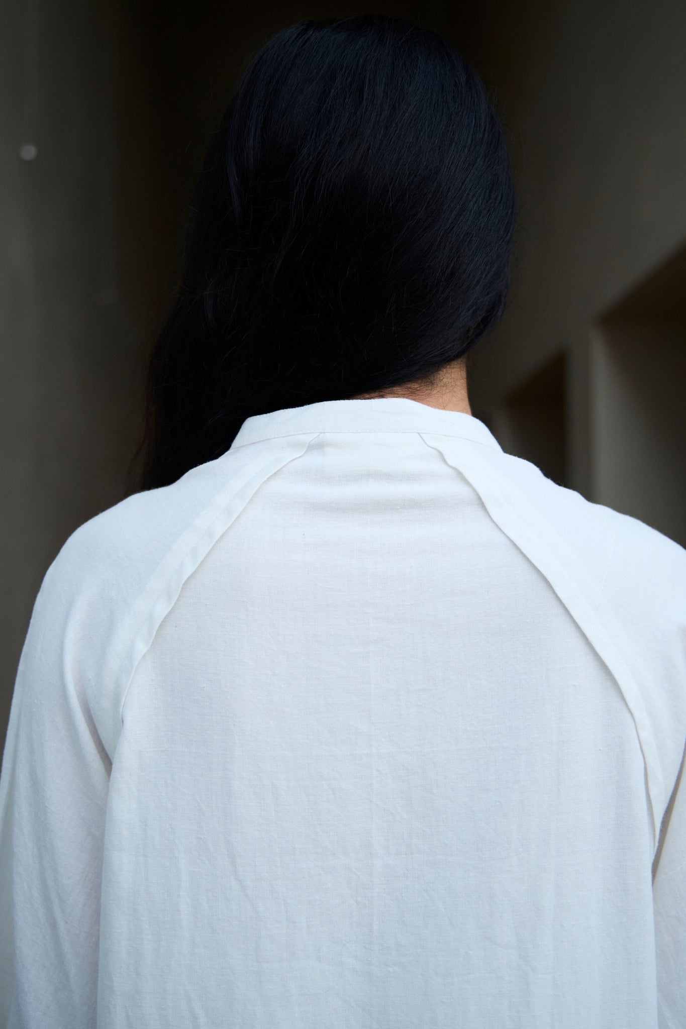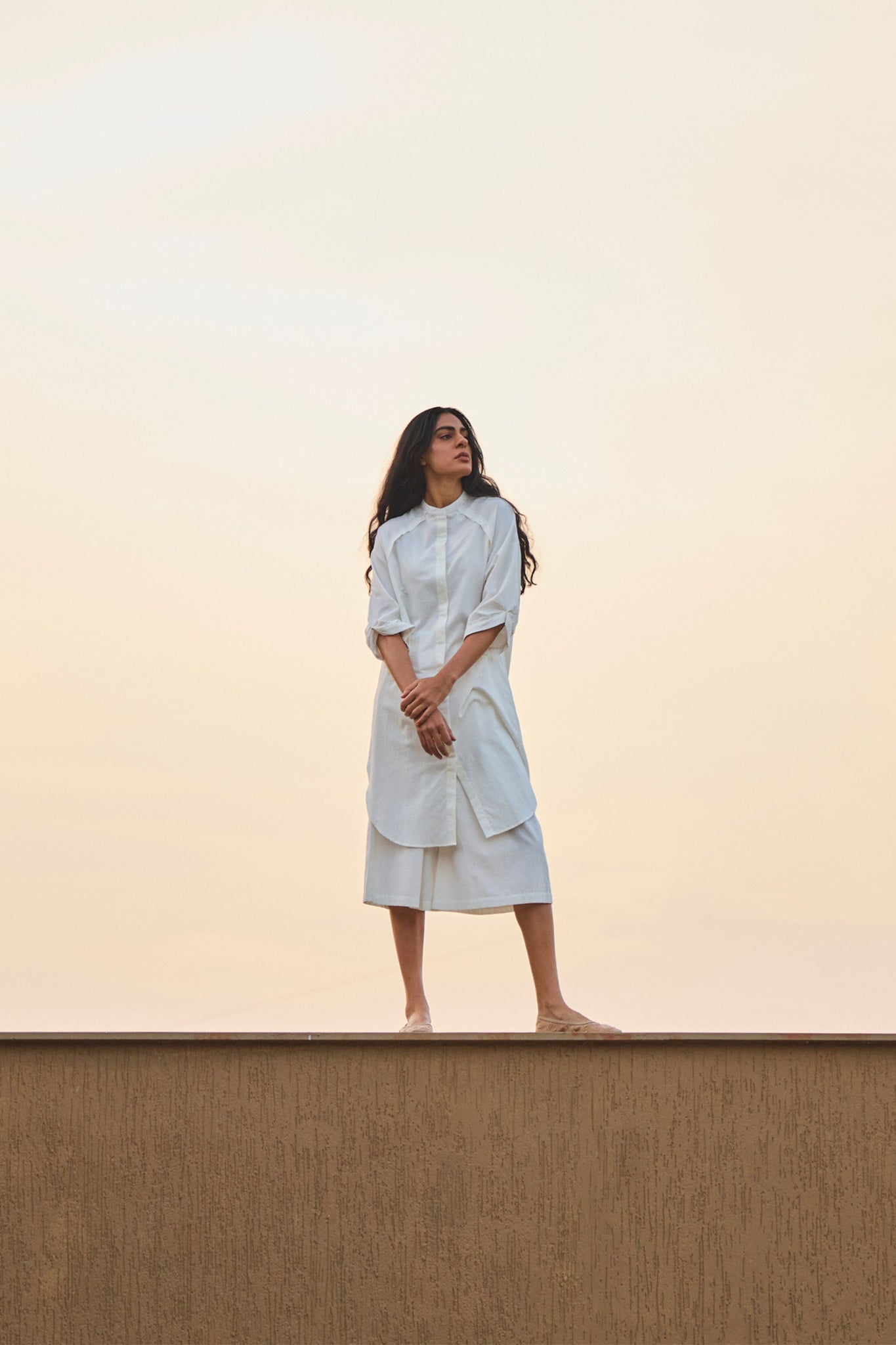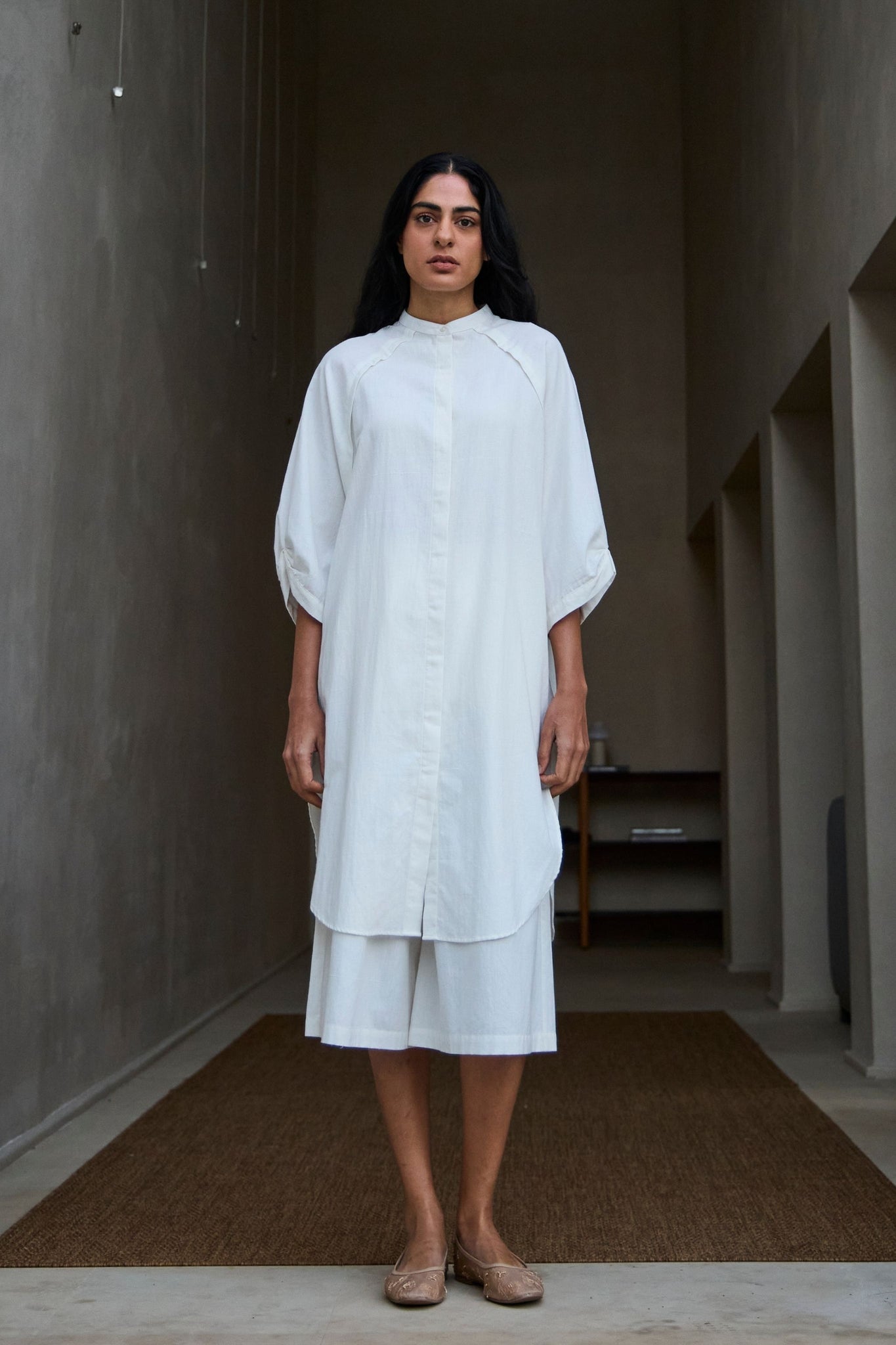 Smart tunic with raglan sleeve and front concealed placket. Side slit for ease of movement. Curved hemline. Inseam pockets. Paired with crop pants. Elasticated waist.