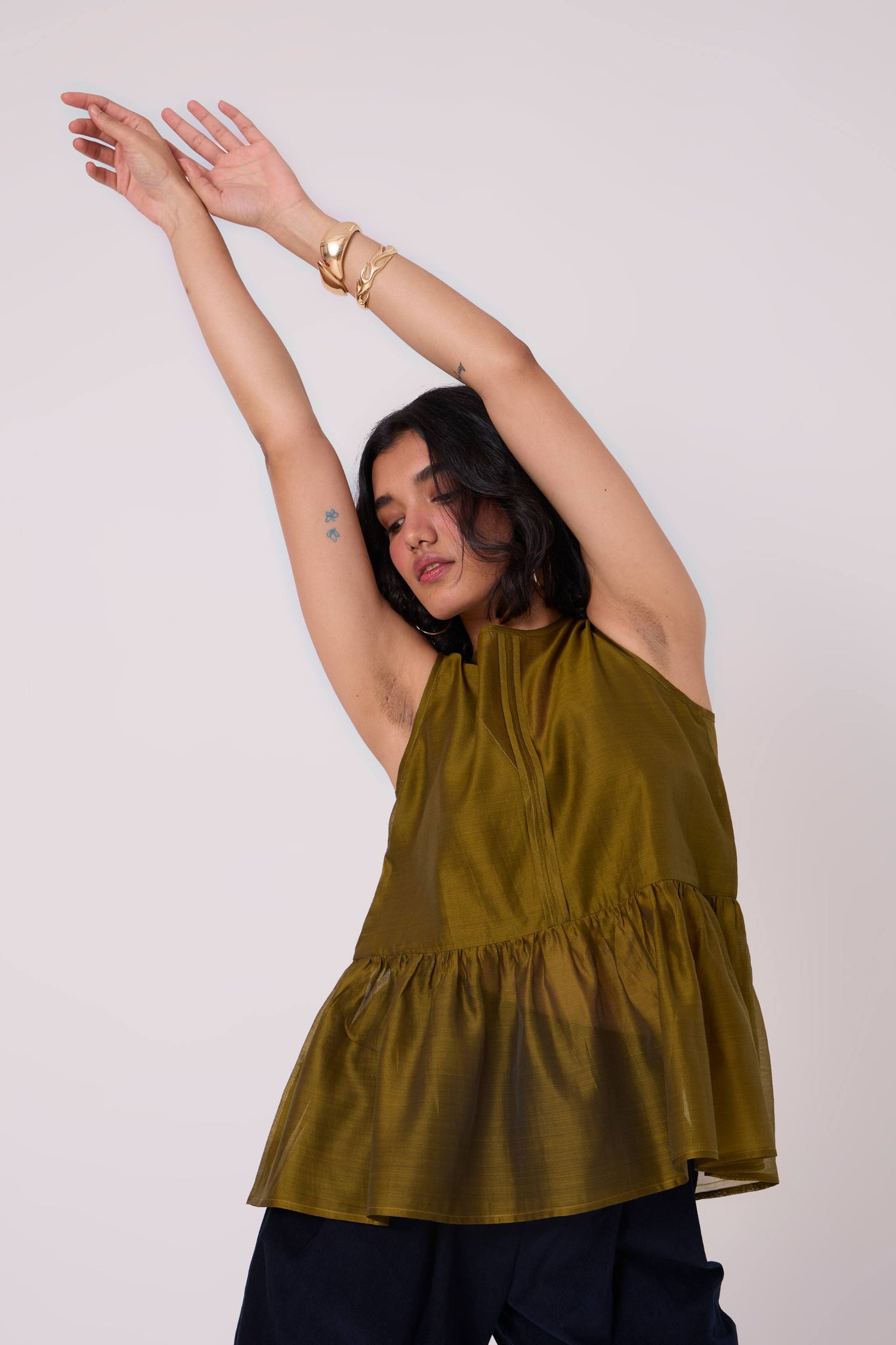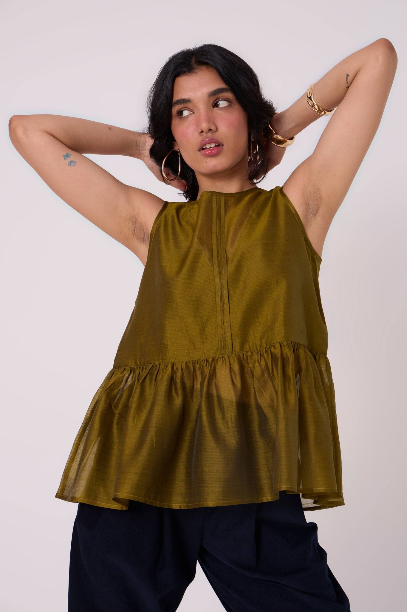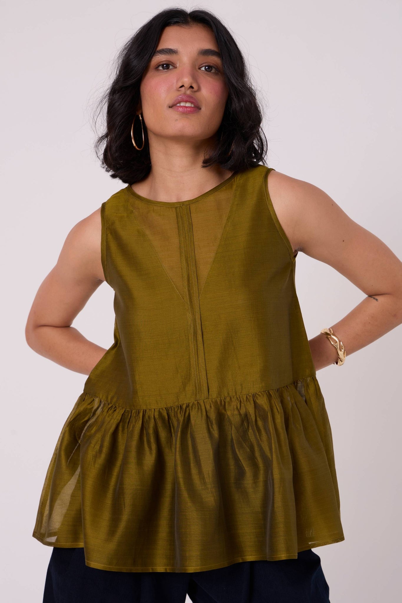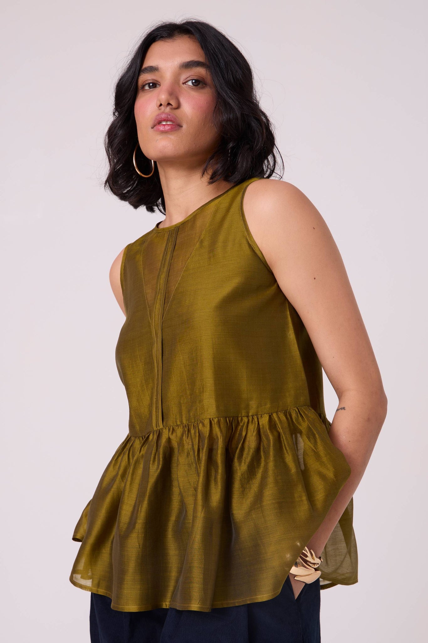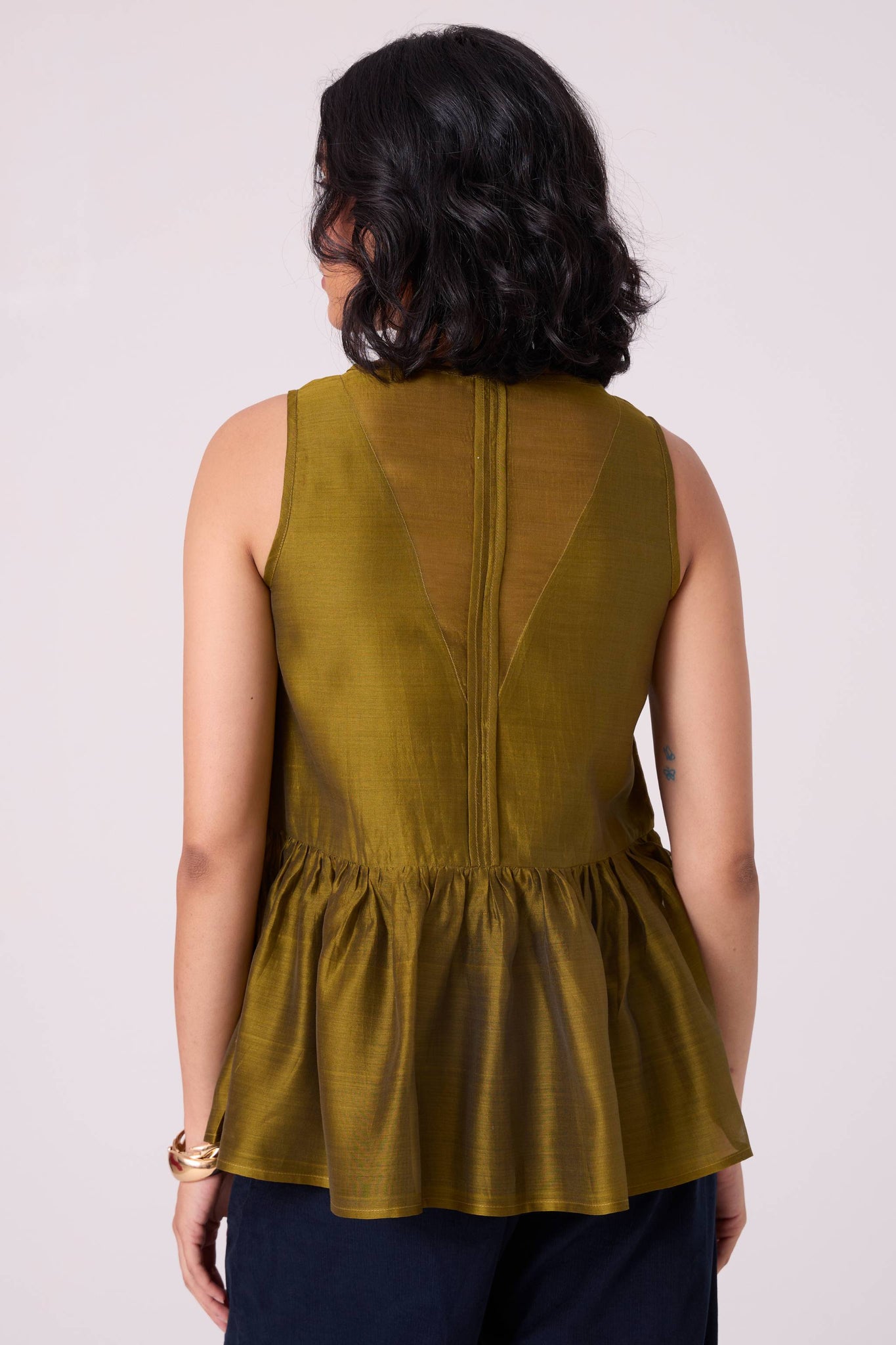A sleeveless top elevated by a softly gathered peplum. The sheer V-neckline at both front and back introduces quiet lightness to a balanced, modern shape.