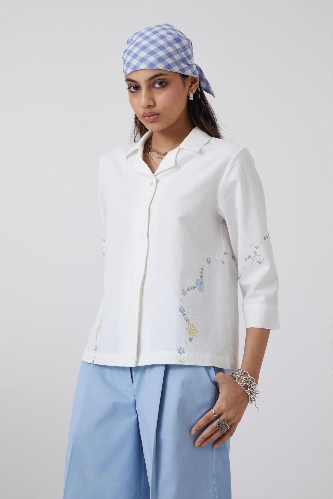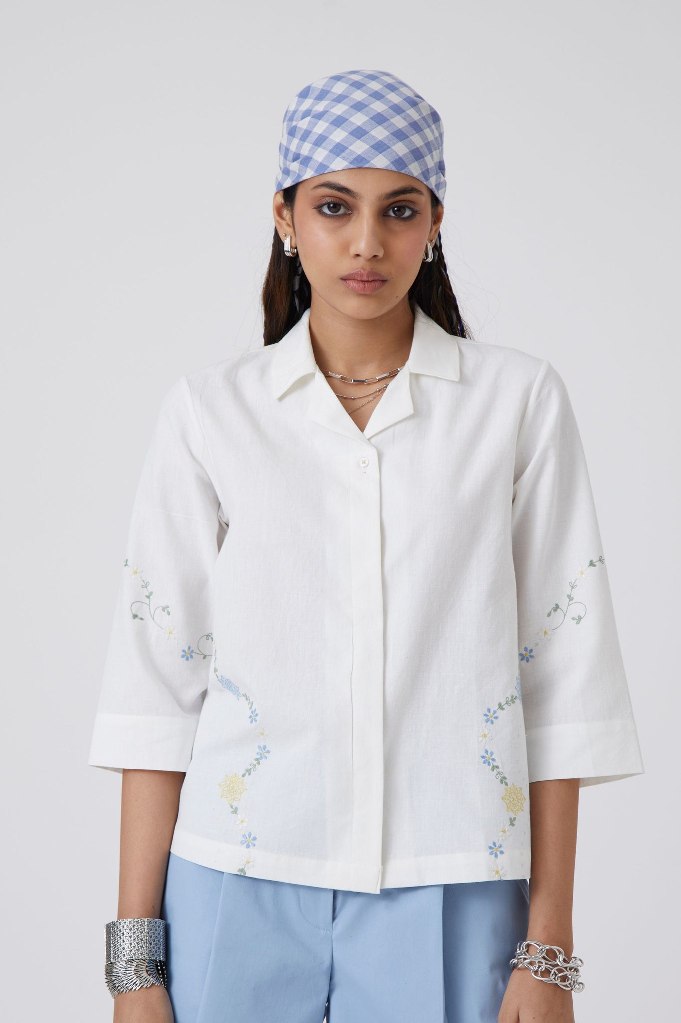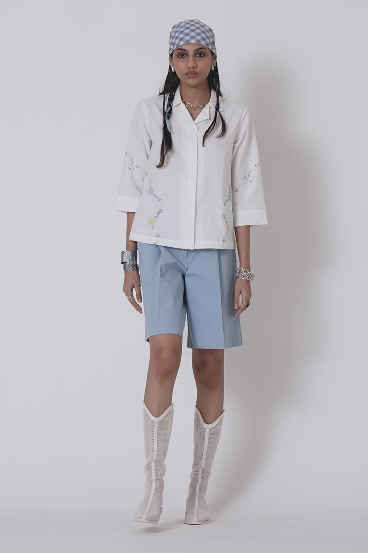 Cuban collar shirt made in handspun and handwoven cotton. Three quarter length sleeves. Finished with vintage embroidery floral motifs.