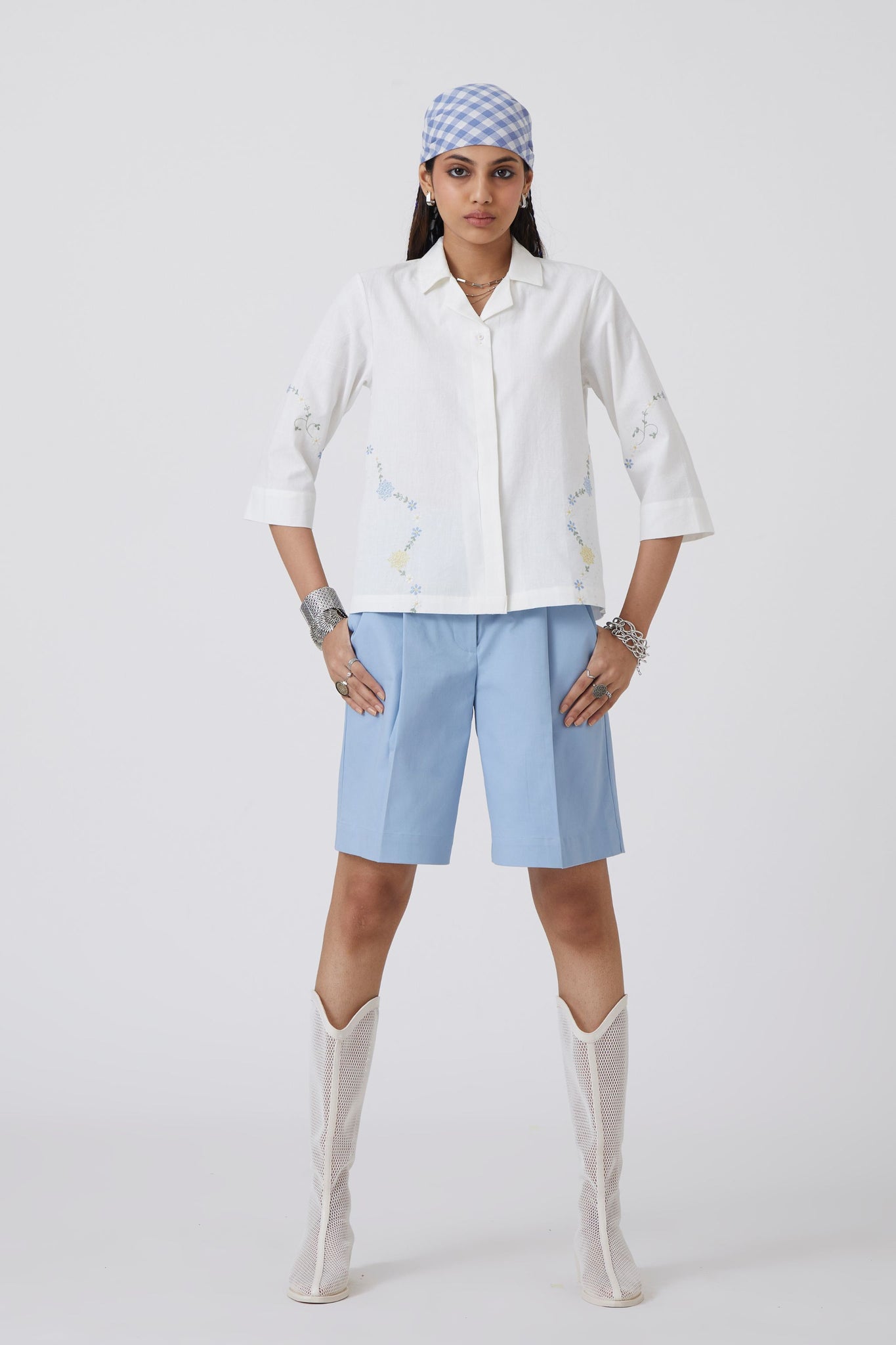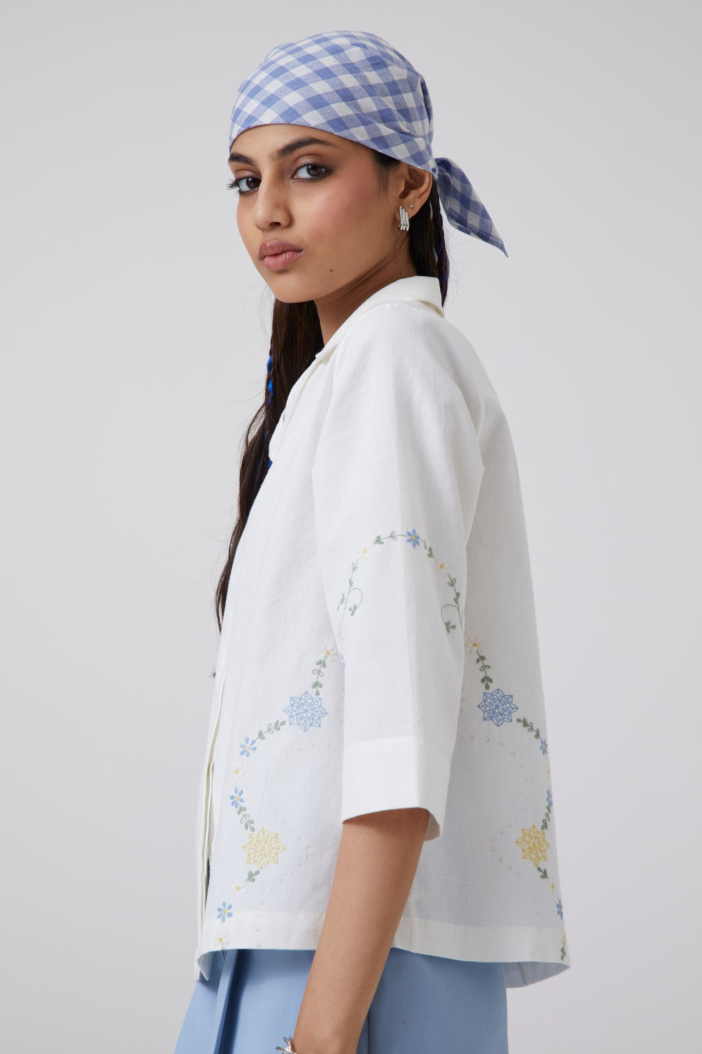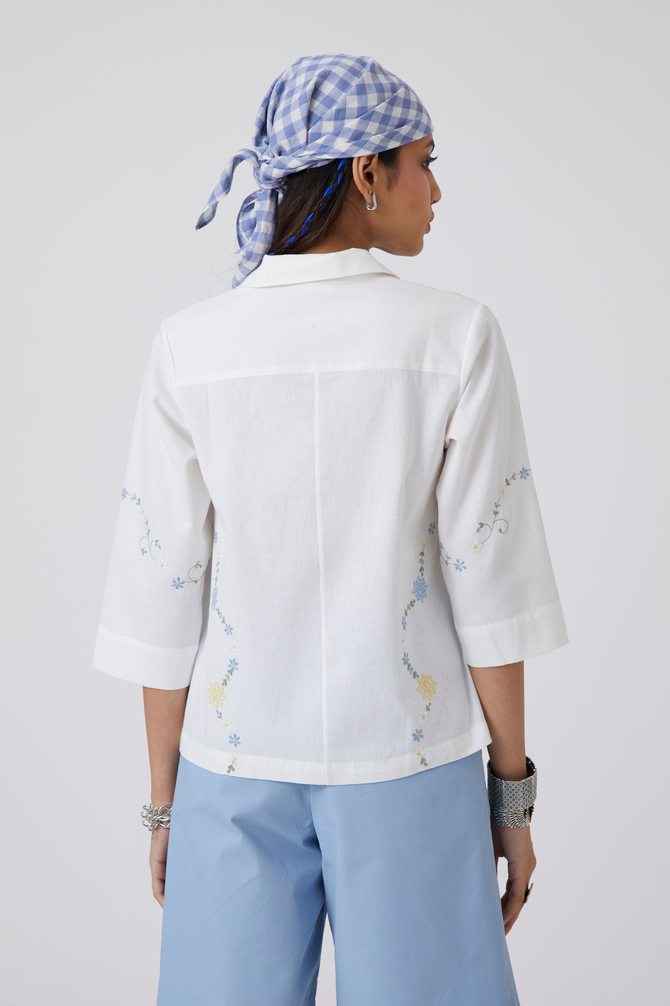 Cuban collar shirt made in handspun and handwoven cotton. Three quarter length sleeves. Finished with vintage embroidery floral motifs.