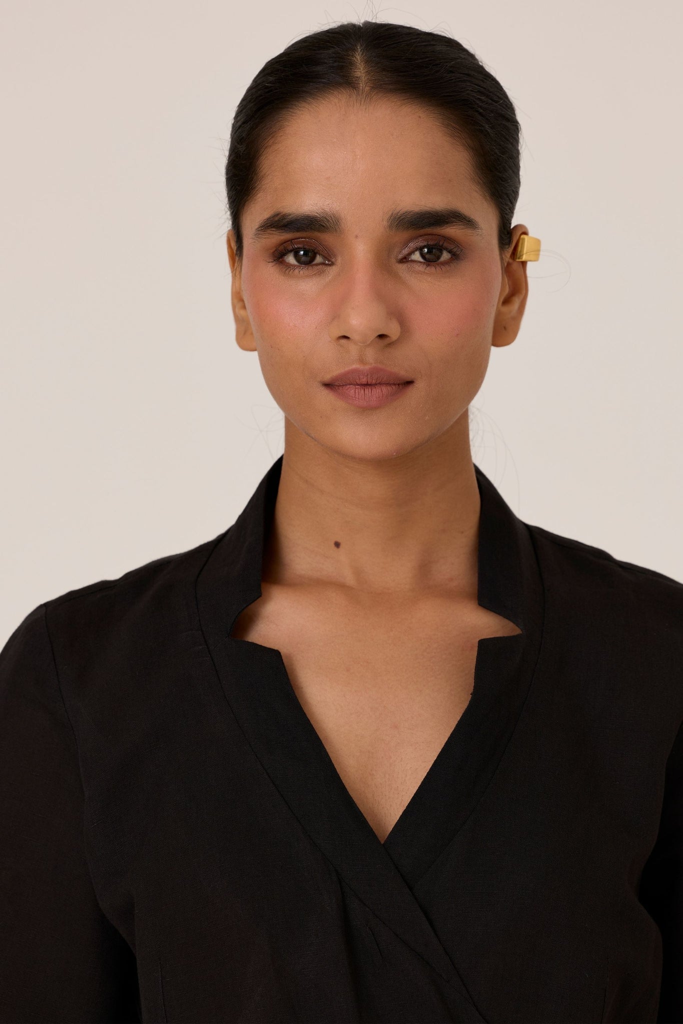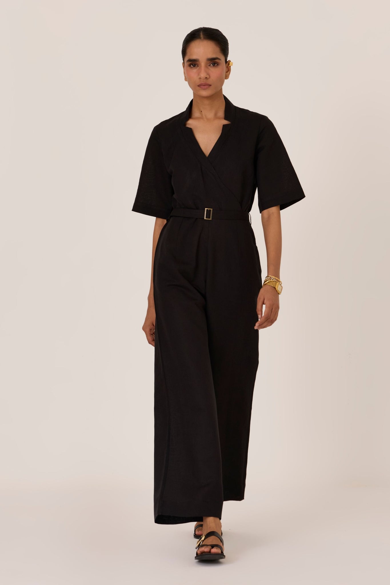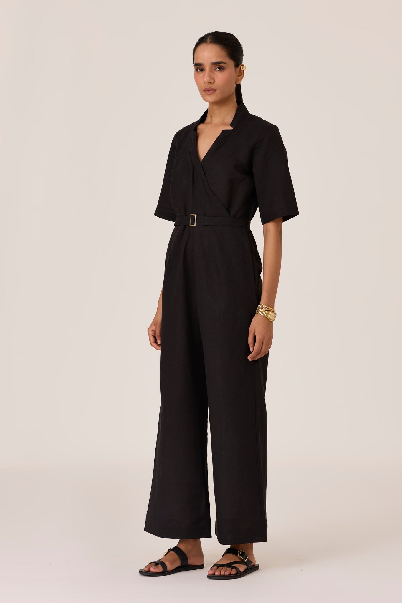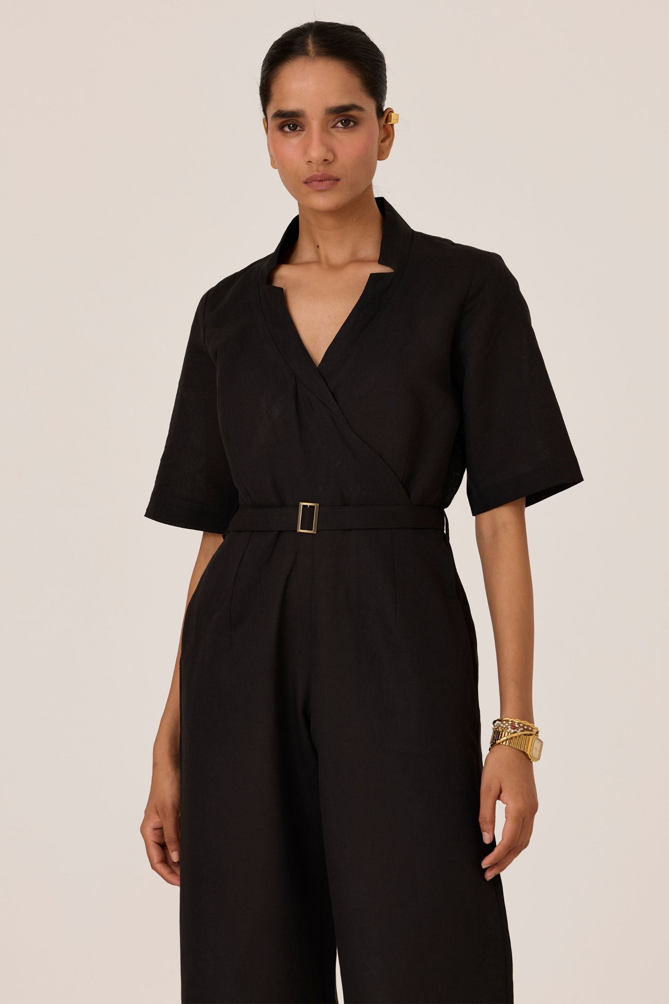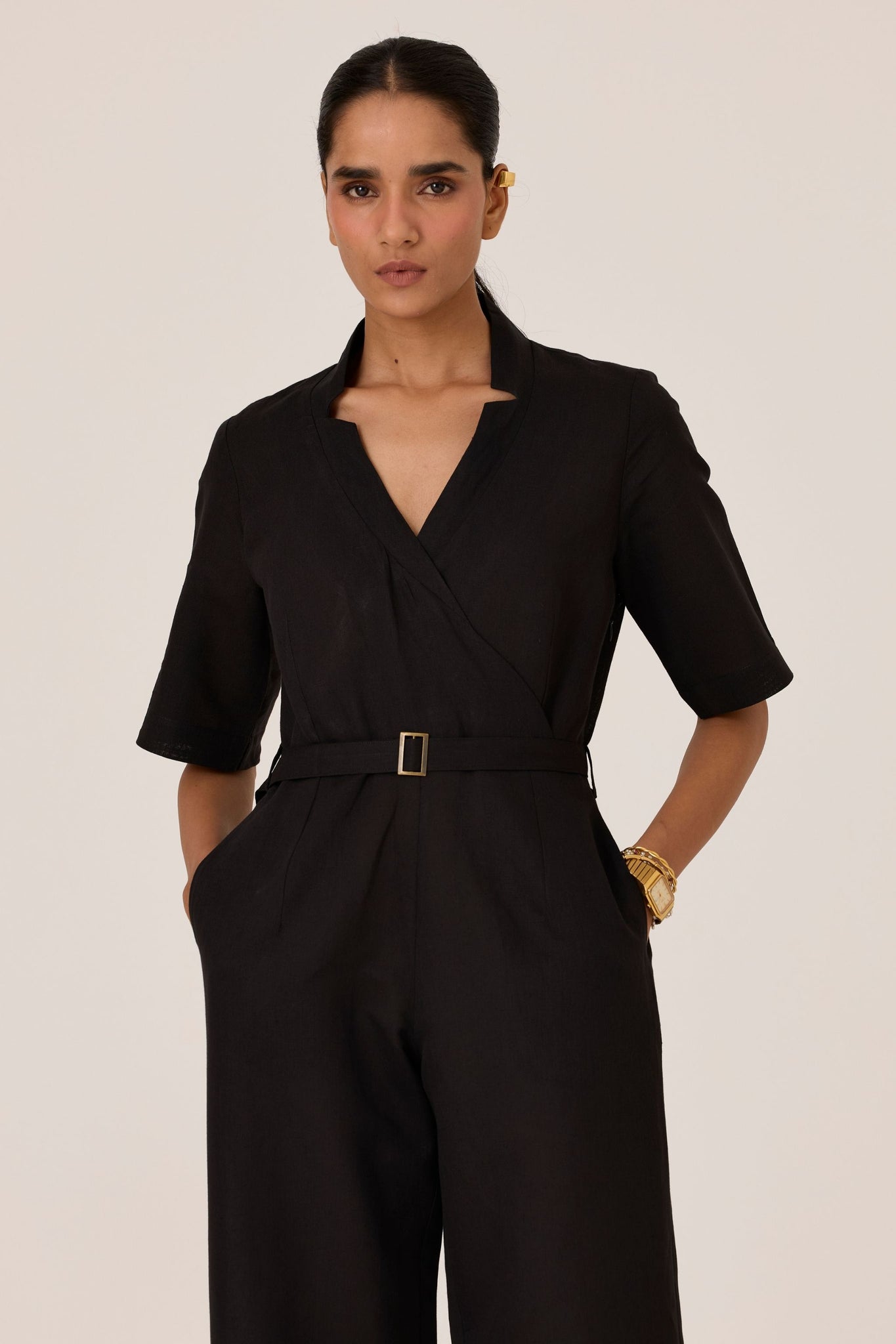 Handsome linen jumpsuit with a surplice neckline. Safari style turn-up sleeves. Buckled belt to cinch as required at waist. Invisible side zip fastening. In-seam pockets.