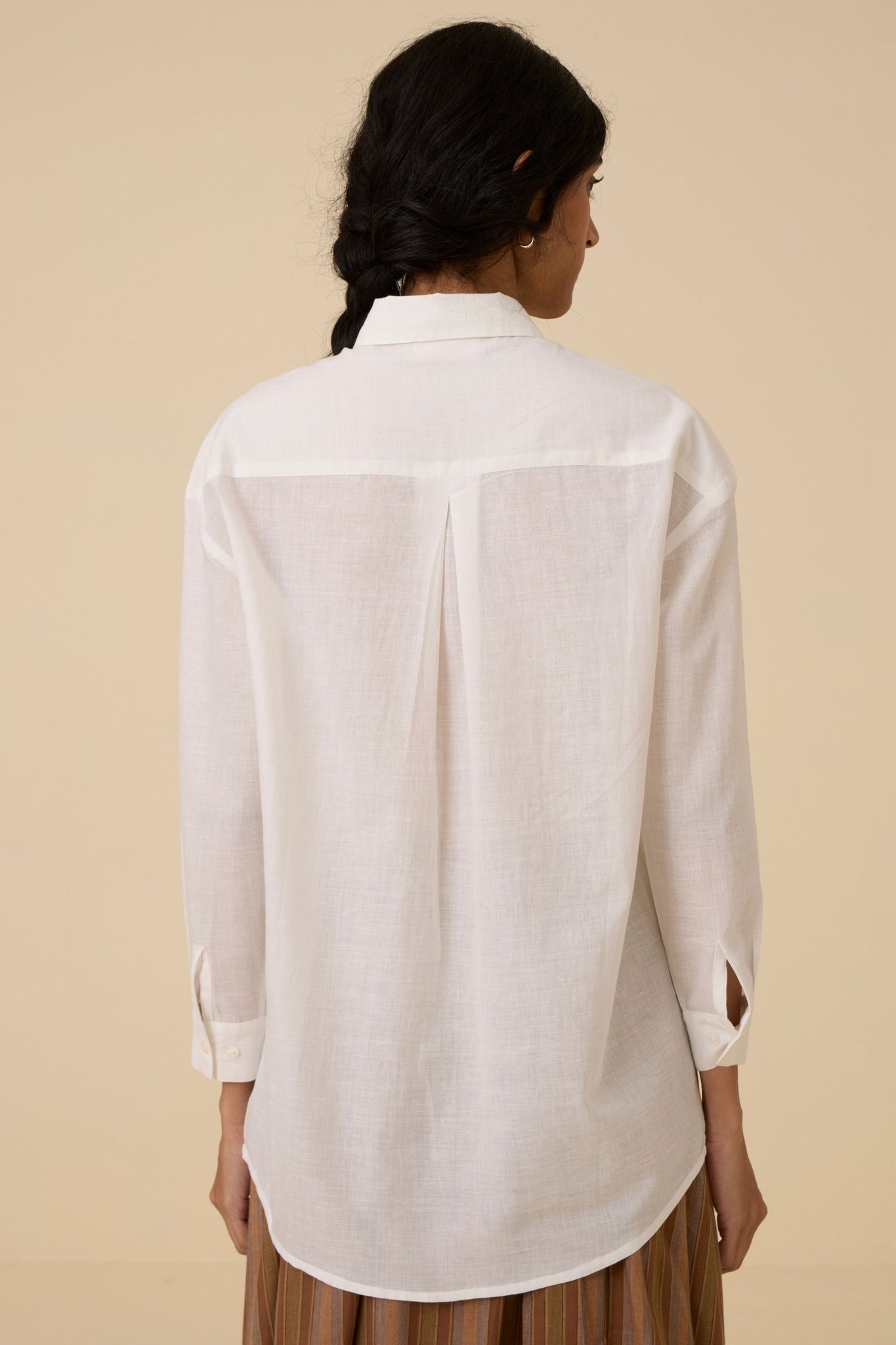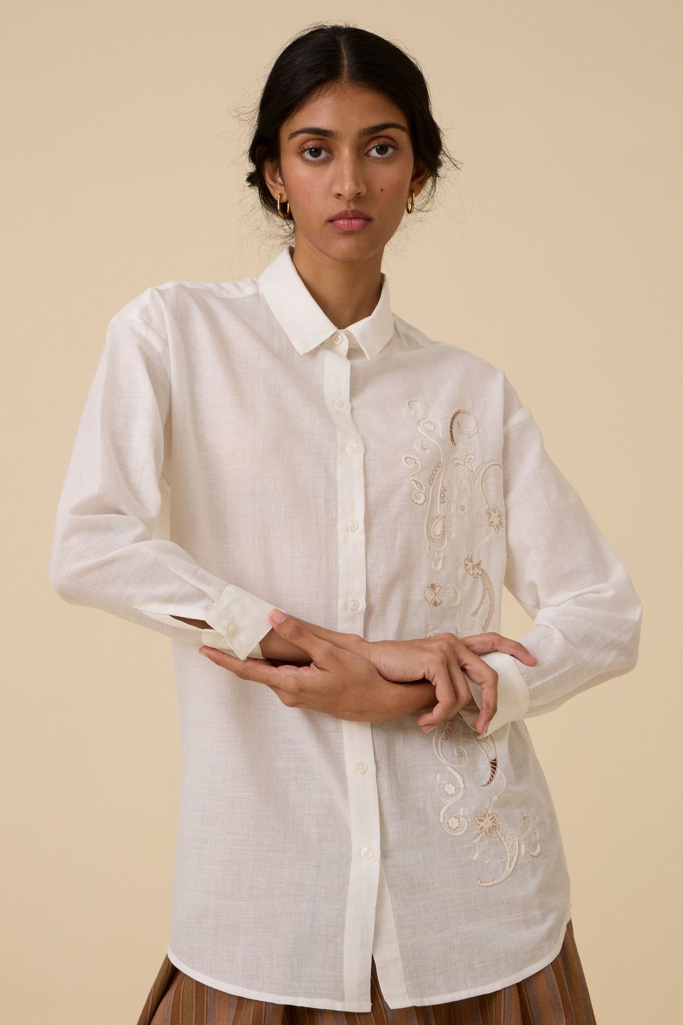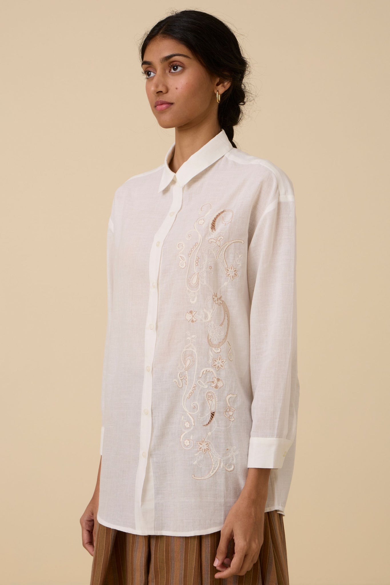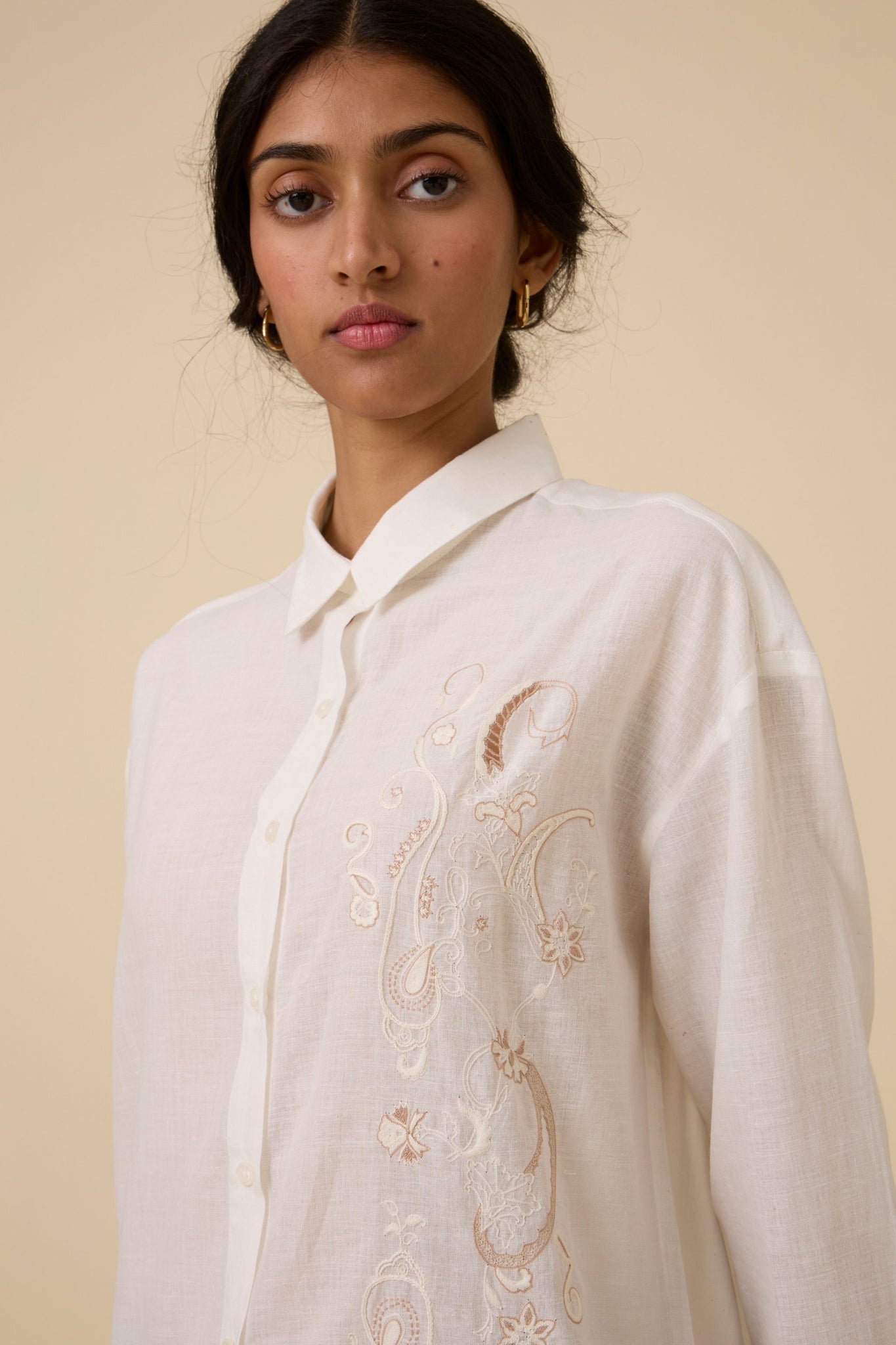 Our popular Joyce shirt crafted from hand spun and handwoven cotton embellished with subtle embroidery. Slim collar. Full length sleeves with cuff.