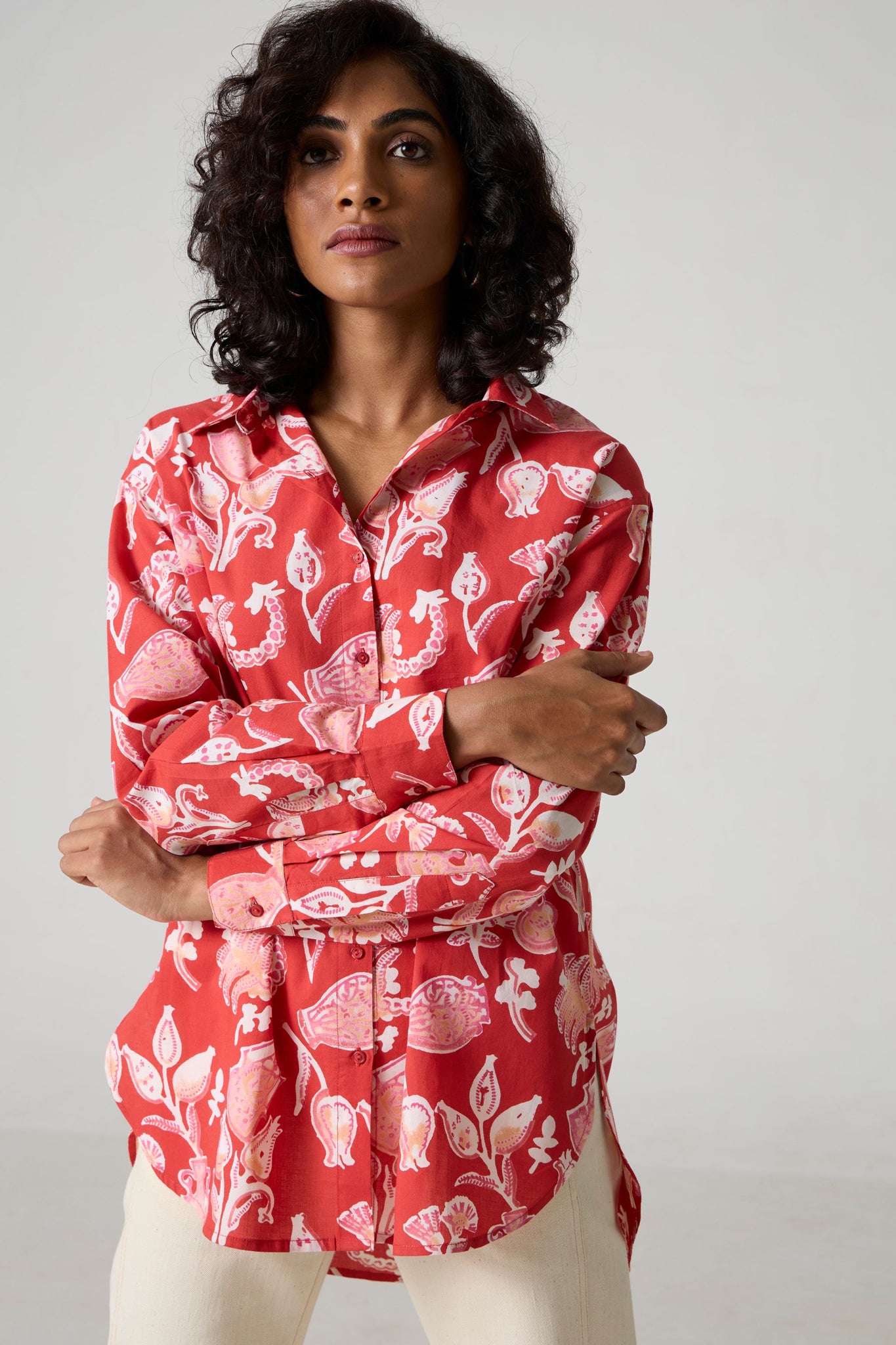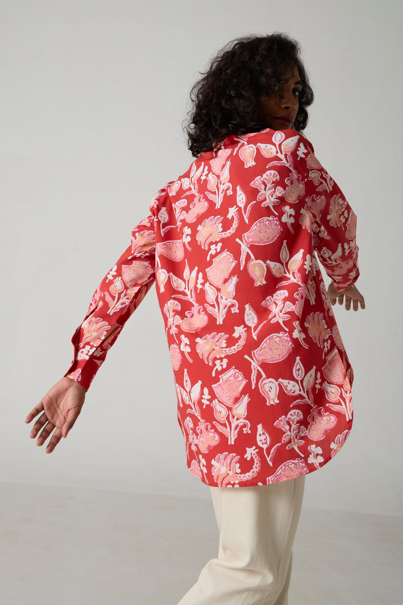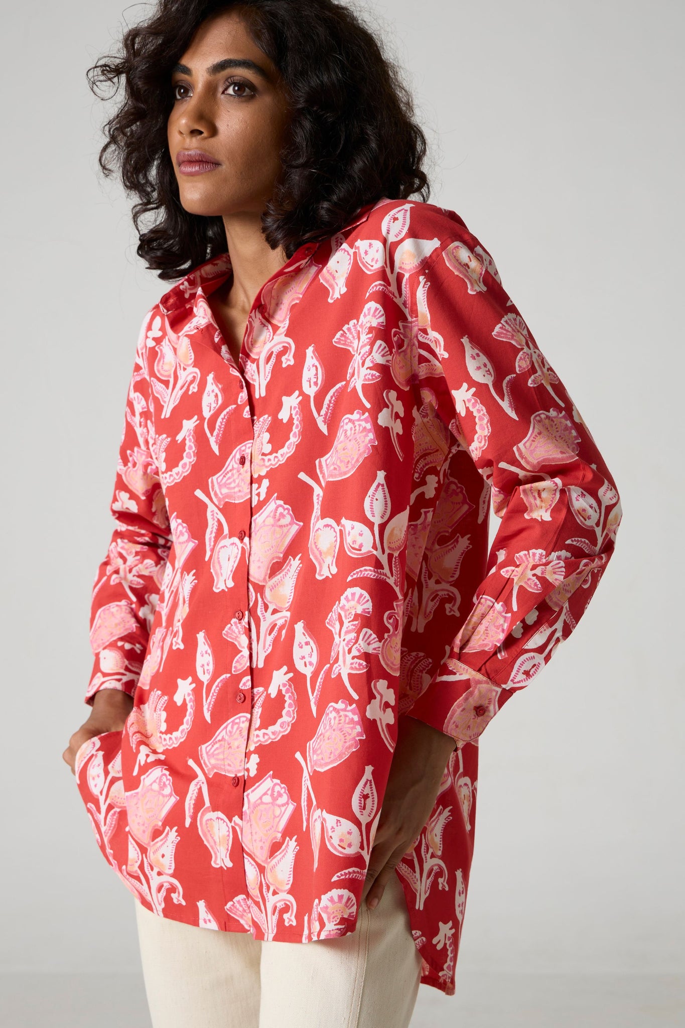 An oversized shirt for busy days on the move. Crafted in soft hand block-printed fabric. High-low hem, classic shirt collar, bracelet length sleeves.